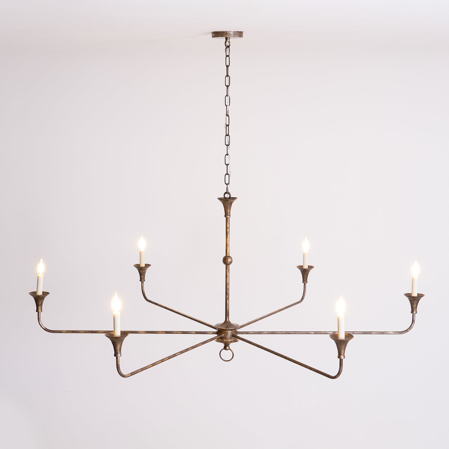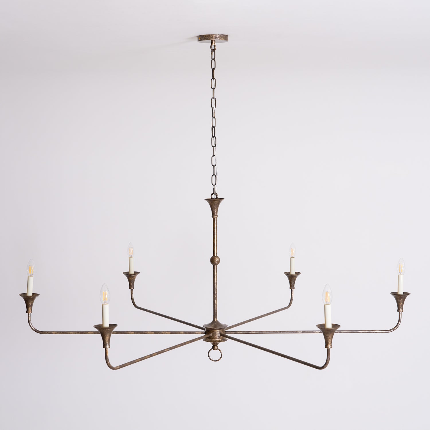 The metal surface is finished with a painted coating that gives the chandelier a subtly textured, hand-applied look. Rather than a perfectly smooth, sanded finish, the surface may display a soft, sponge-like texture that adds a touch of organic character. This artisanal finish complements the fixture’s fluid profile, bringing timeless elegance and architectural poise to any interior.