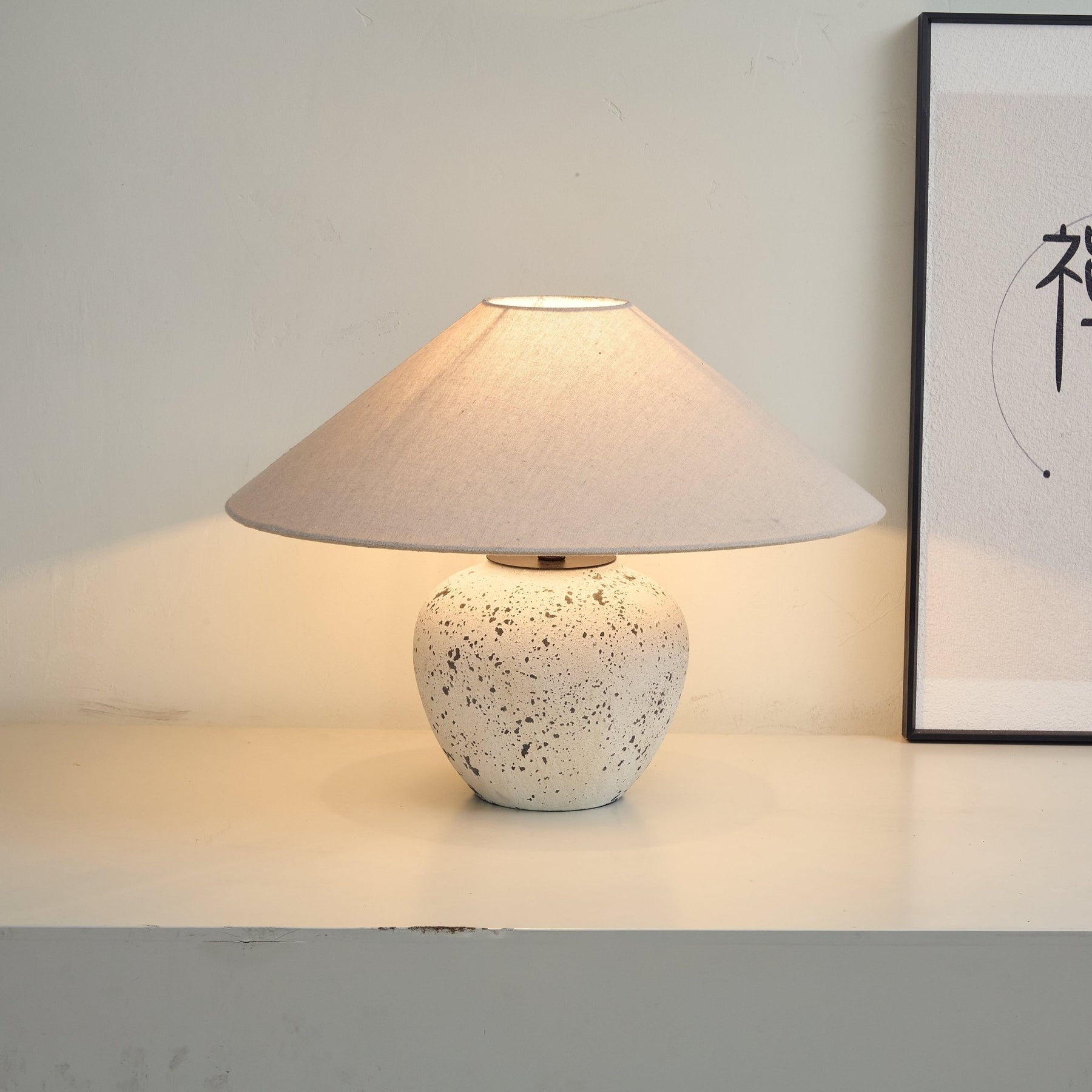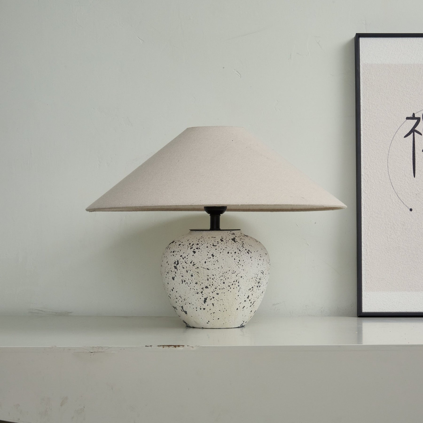 This table lamp features a base designed like a ceramic jar, with a light - colored surface adorned with dark speckles, giving it a natural and artistic look. Topped with a neutral - hued fabric lampshade, it diffuses light softly. Perfect for adding a touch of rustic charm and warm ambiance to bedside tables, desks, or cozy corners in living spaces.