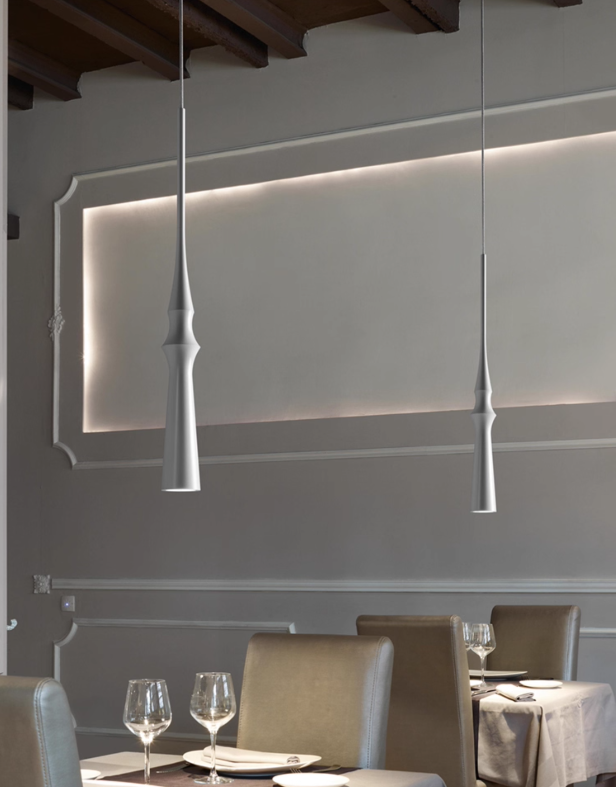 The Slend Pendant Light is an elegantly crafted suspension light featuring a curvaceous form reminiscent of bamboo joints. This stylish product, made from die-cast aluminum, comes in three high-gloss finishing options that complement each other to enhance their combined aesthetics. Equipped with adjustable LED bulbs within its copper lining, the Slend Pendant Light is perfect for tables, counters, and other installations, providing precise and powerful spotlighting.