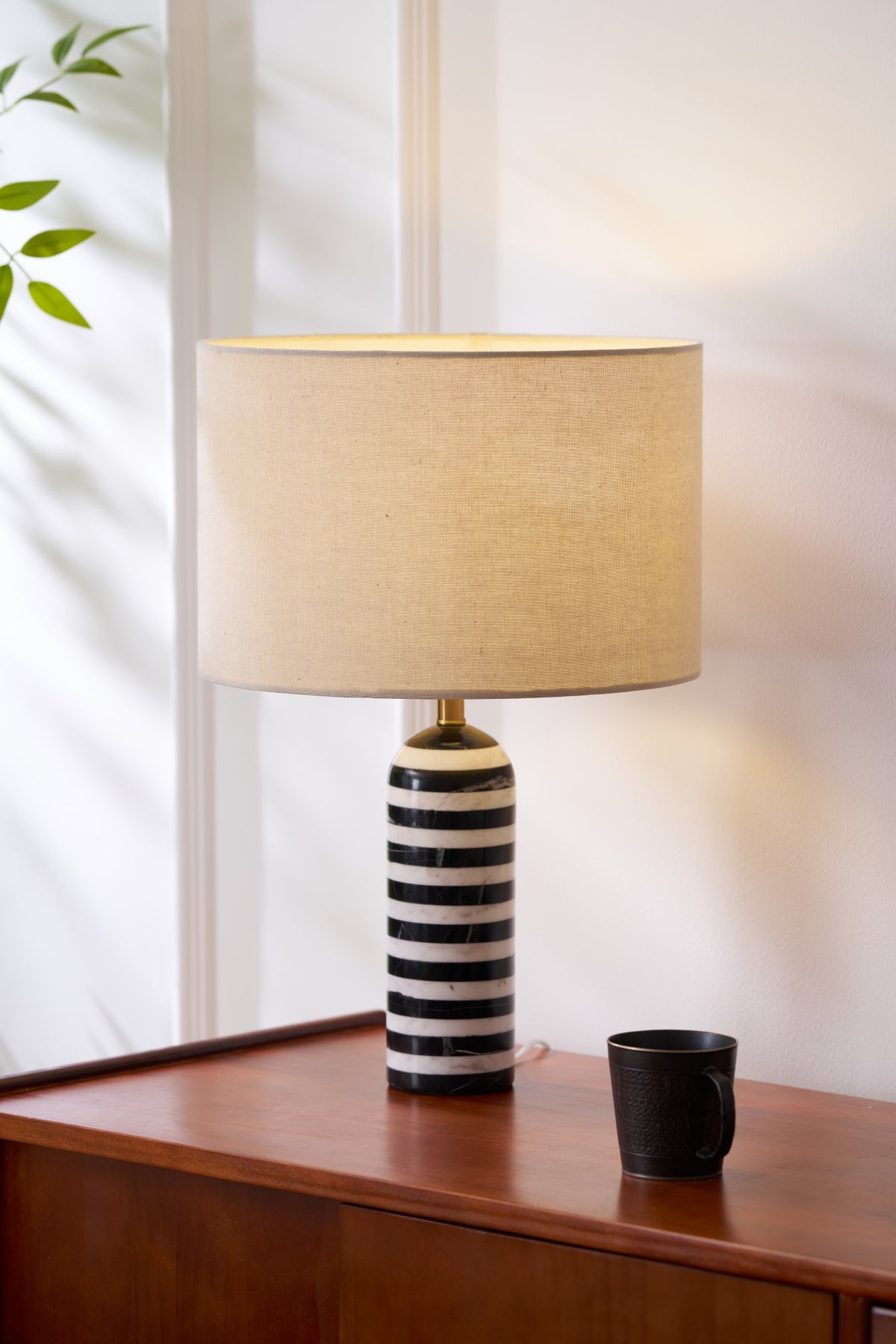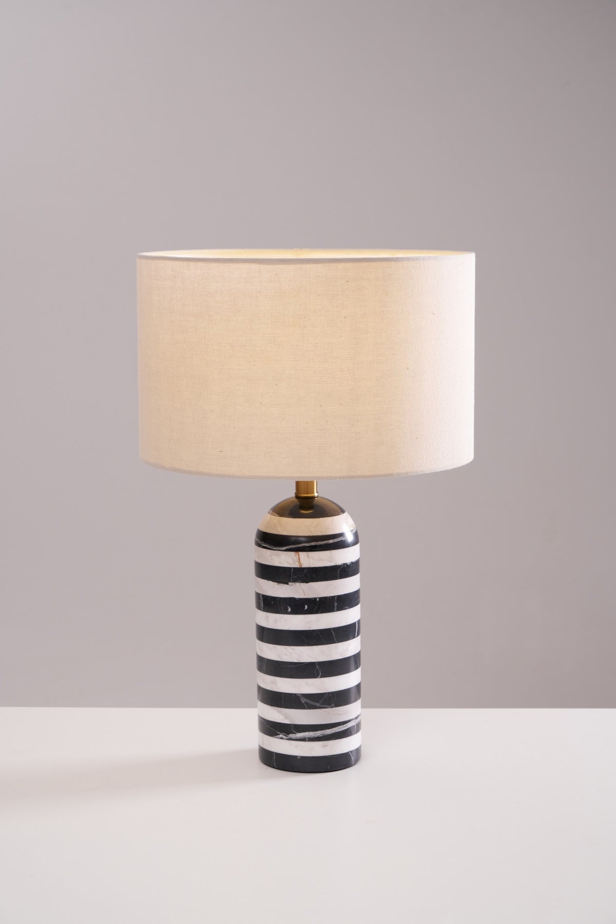 The Tuxedo Table Lamp by Vakkerlight makes a bold monochrome statement with its sleek, cylindrical base crafted from alternating bands of black and white marble. Topped with a soft linen drum shade, it offers a refined balance of modern elegance and timeless charm. Ideal for entryways, bedside tables, or stylish offices, the Tuxedo brings graphic sophistication and natural texture to any interior.
