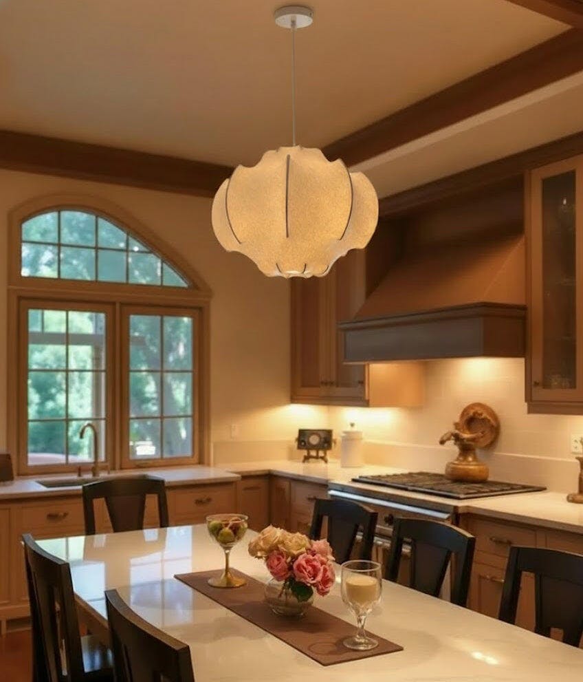 The Silken Lotus Pendant Lamp embodies elegance with its lantern-like silhouette crafted from fine silk. The natural texture of the silk softly diffuses the light, creating a warm and serene atmosphere that feels both refined and inviting. Its sculptural form, reminiscent of a lotus in bloom, brings a touch of organic beauty and timeless charm. With an adjustable 150 cm suspension, this pendant adapts perfectly to dining rooms, bedrooms, or living spaces, infusing interiors with a delicate glow and sophisticated character.