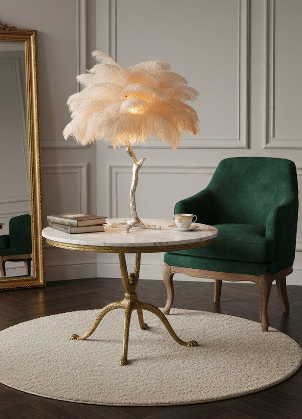 Palmier illuminant, resplendissant d'un feuillage exquis en plumes d'autruche, la lampe de table en plumes occupe le devant de la scène dans n'importe quel cadre de luxe et apporte la touche midas ultime aux décors de la régence hollywoodienne. Une pièce de résistance parmi les lampadaires, cette œuvre d'art d'éclairage attire l'attention sur son design exquis et son savoir-faire complexe.