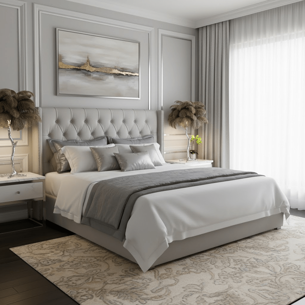 Task Lighting: Bedside lamps or wall sconces should be proportionate to the size of the nightstands and the bed. The lamp height should be roughly at eye level when sitting in bed.