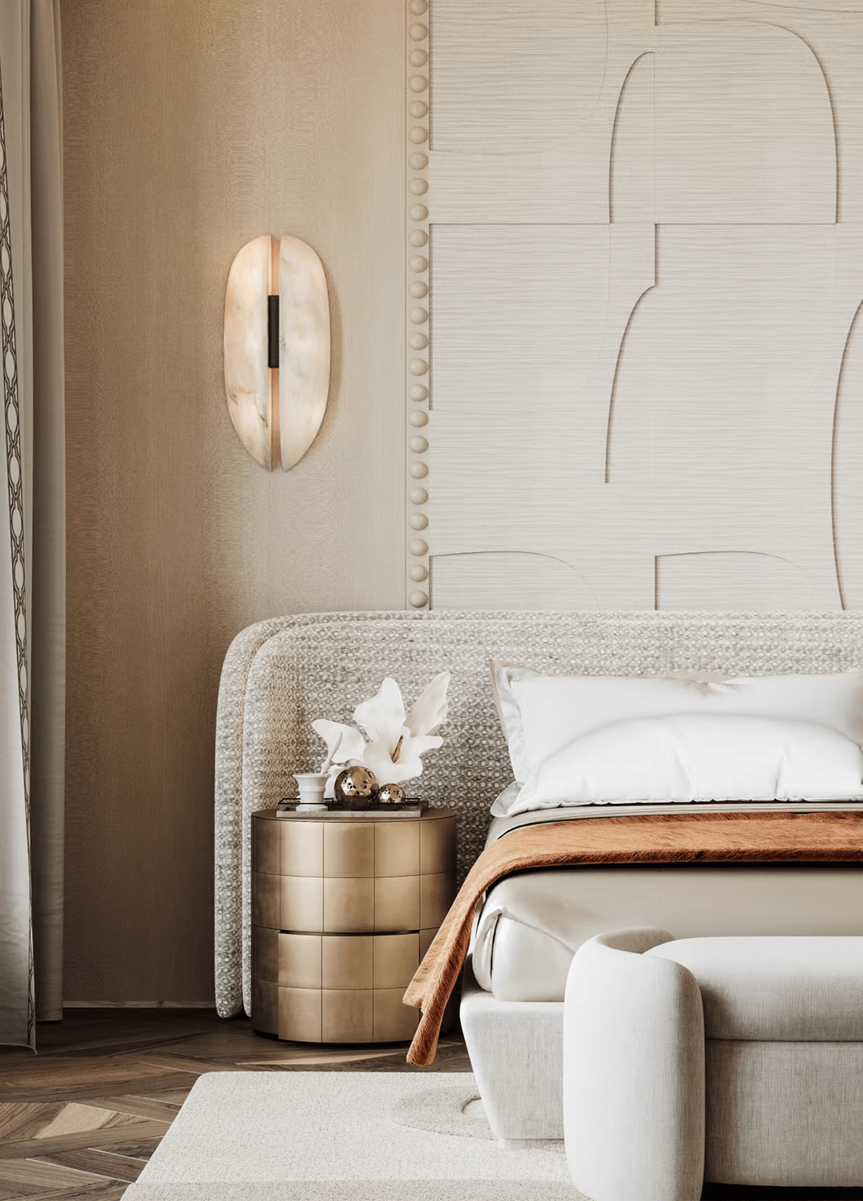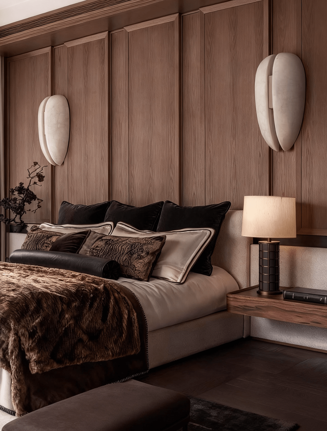 Task Lighting: Bedside lamps or wall sconces should be proportionate to the size of the nightstands and the bed. The lamp height should be roughly at eye level when sitting in bed.