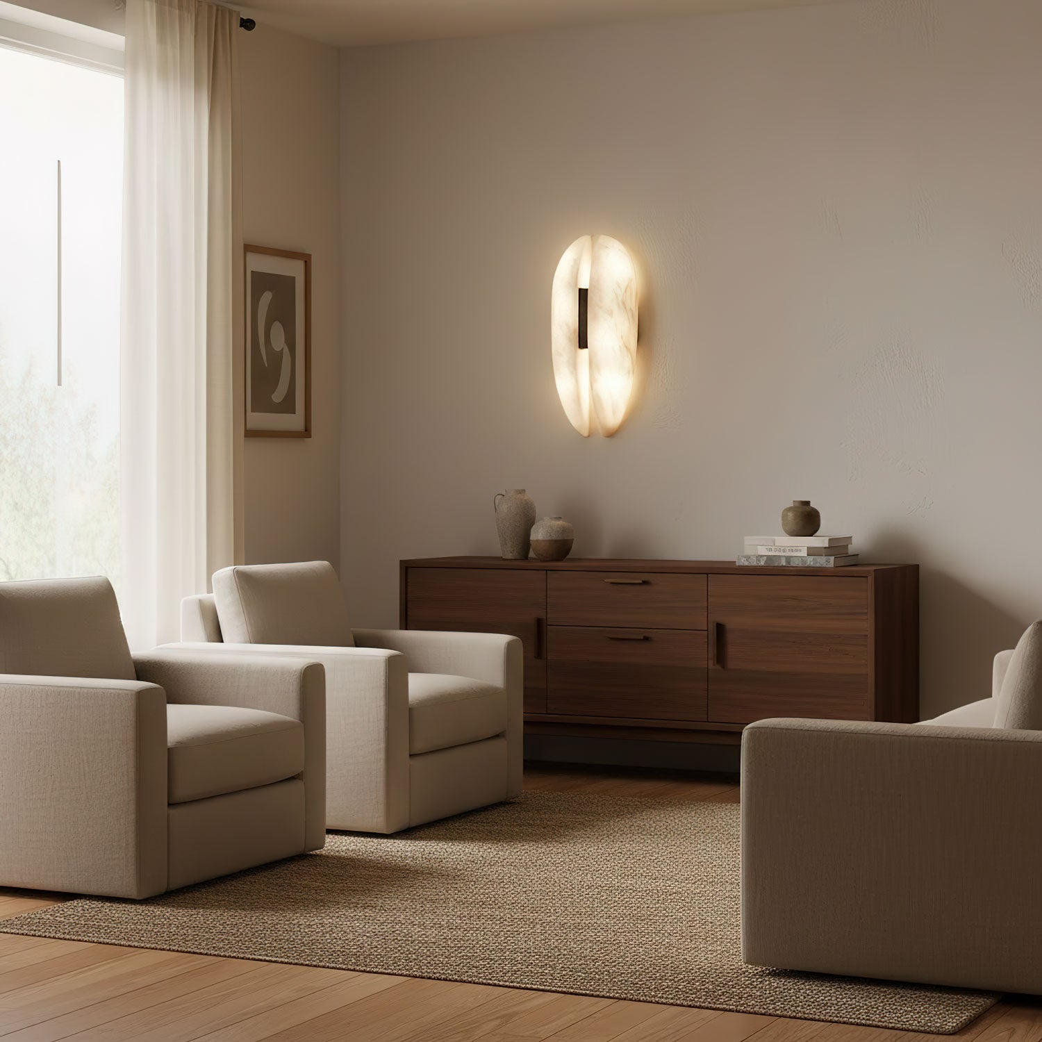 The Vakkerlight Alabaster Veil Wall Sconce is a stunning embodiment of natural beauty and refined design. Crafted with panels that mimic the delicate, translucent quality of alabaster, it emits a soft, diffused glow that creates a serene and inviting ambiance. The dark, textured accent at the center adds a touch of sophisticated contrast, enhancing the sconce's organic yet elegant allure. Perfect for bringing a sense of luxurious tranquility to bedrooms, hallways, or living areas, this sconce from Vakkerlight seamlessly blends artisanal craftsmanship with a design inspired by the timeless charm of alabaster.