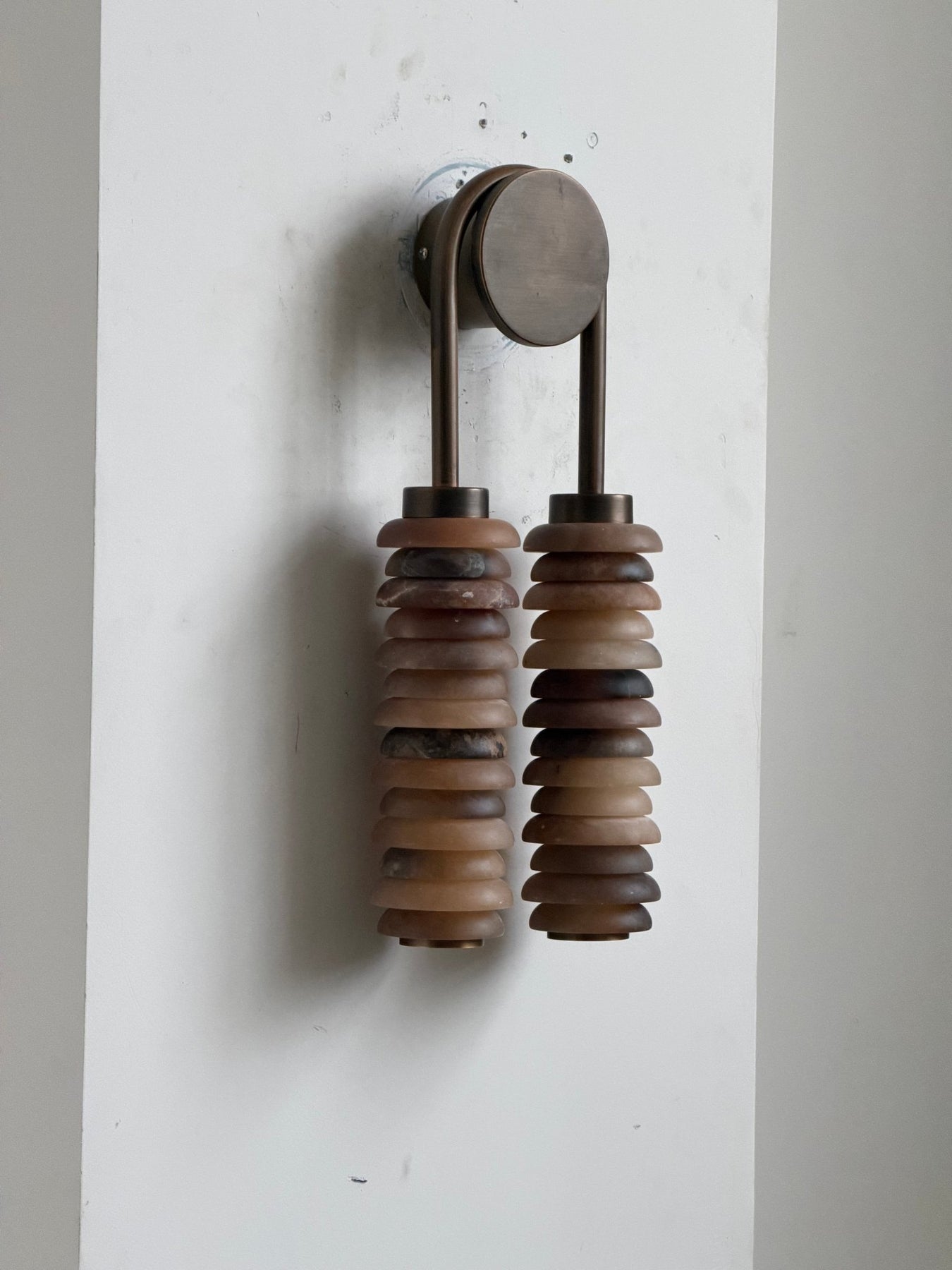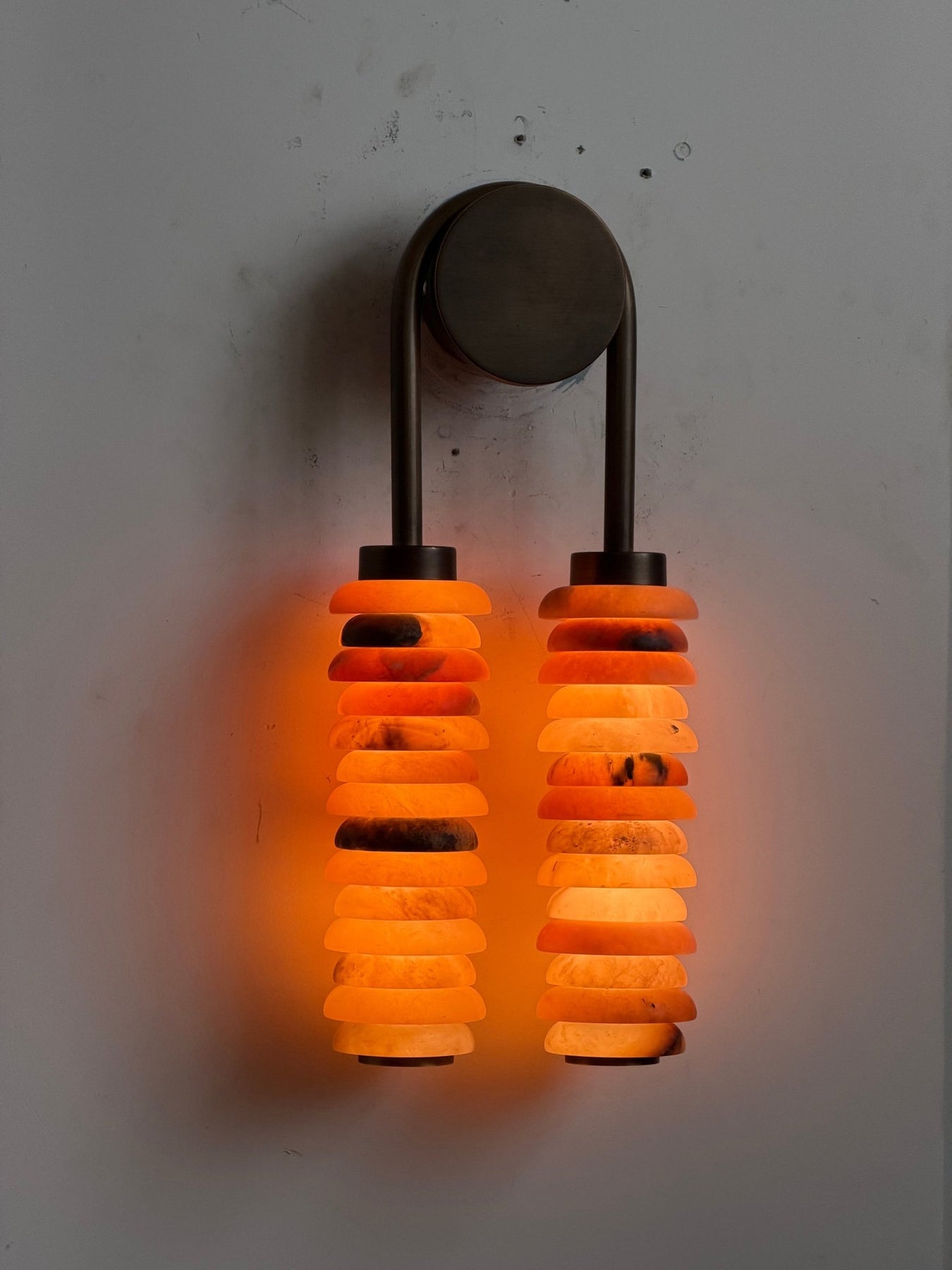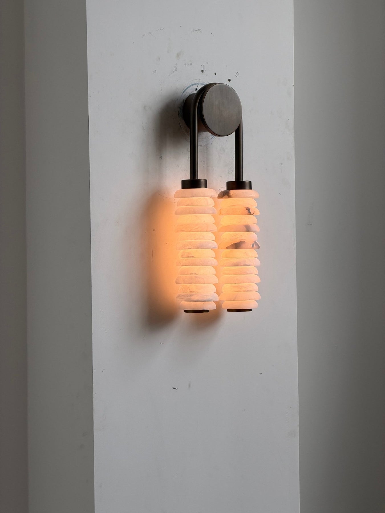 Experience the captivating interplay of light and texture with the Calla Ribbed Sconce, an architectural and elegant wall light from Vakkerlight. This striking fixture features two parallel, cylindrical shades, each meticulously crafted from individual, translucent rings of genuine alabaster. The stacked design allows light to gracefully filter through, creating a soft, rhythmic glow that highlights the stone's natural beauty. A sleek, antique brass frame suspends these luminous columns, providing a sophisticated contrast and a touch of refined industrial charm. Named 'Calla'—meaning "beautiful"—to reflect its sculptural form and radiant quality, the Calla Ribbed Sconce by Vakkerlight is perfect for adding ambient illumination and a distinctive, artistic statement to hallways, living areas, or sophisticated bathrooms.