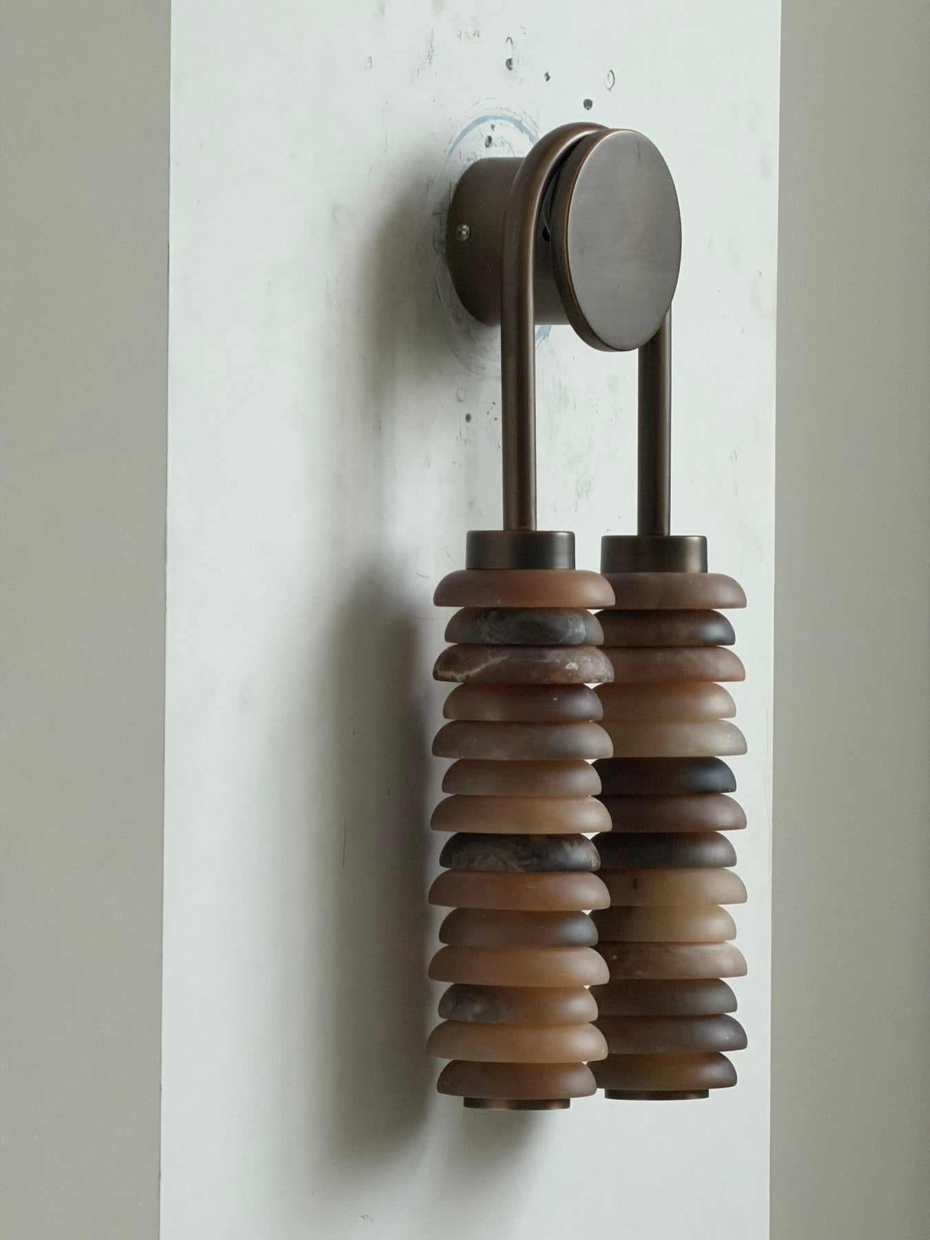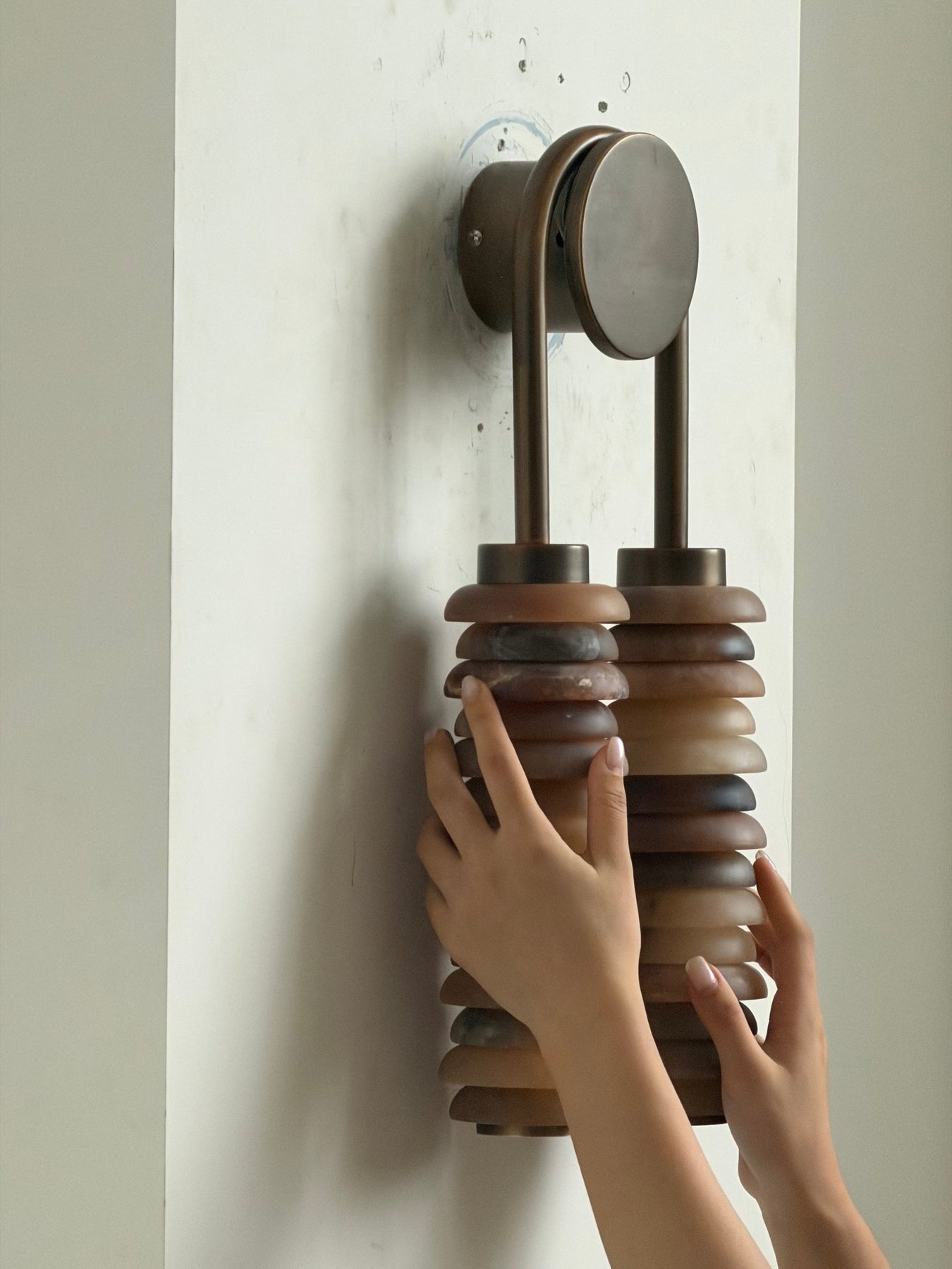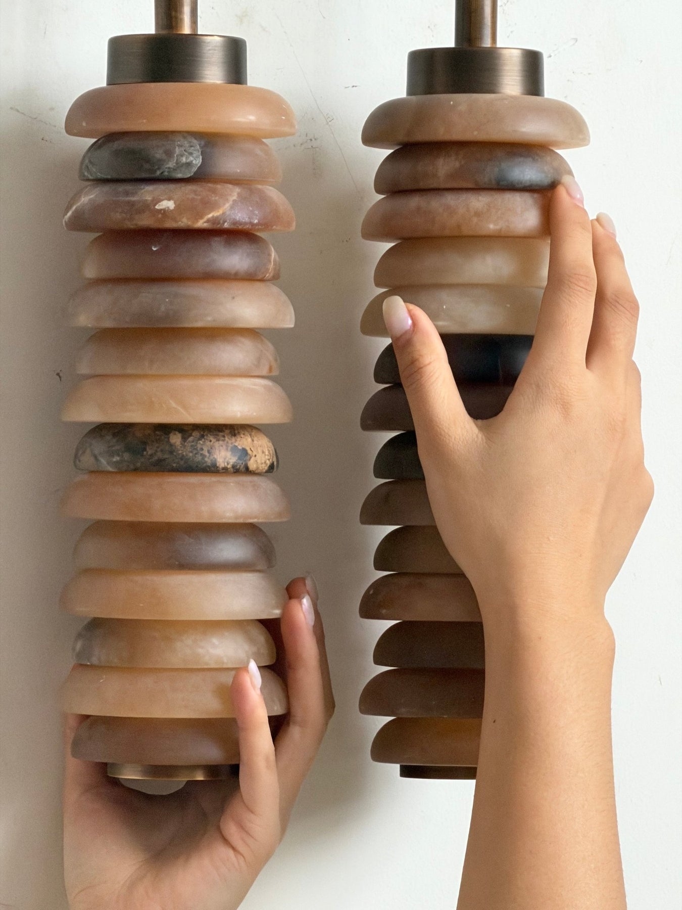 Experience the captivating interplay of light and texture with the Calla Ribbed Sconce, an architectural and elegant wall light from Vakkerlight. This striking fixture features two parallel, cylindrical shades, each meticulously crafted from individual, translucent rings of genuine alabaster. The stacked design allows light to gracefully filter through, creating a soft, rhythmic glow that highlights the stone's natural beauty. A sleek, antique brass frame suspends these luminous columns, providing a sophisticated contrast and a touch of refined industrial charm. Named 'Calla'—meaning "beautiful"—to reflect its sculptural form and radiant quality, the Calla Ribbed Sconce by Vakkerlight is perfect for adding ambient illumination and a distinctive, artistic statement to hallways, living areas, or sophisticated bathrooms.