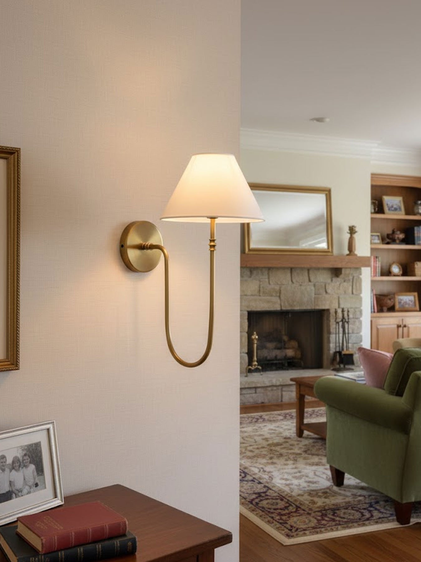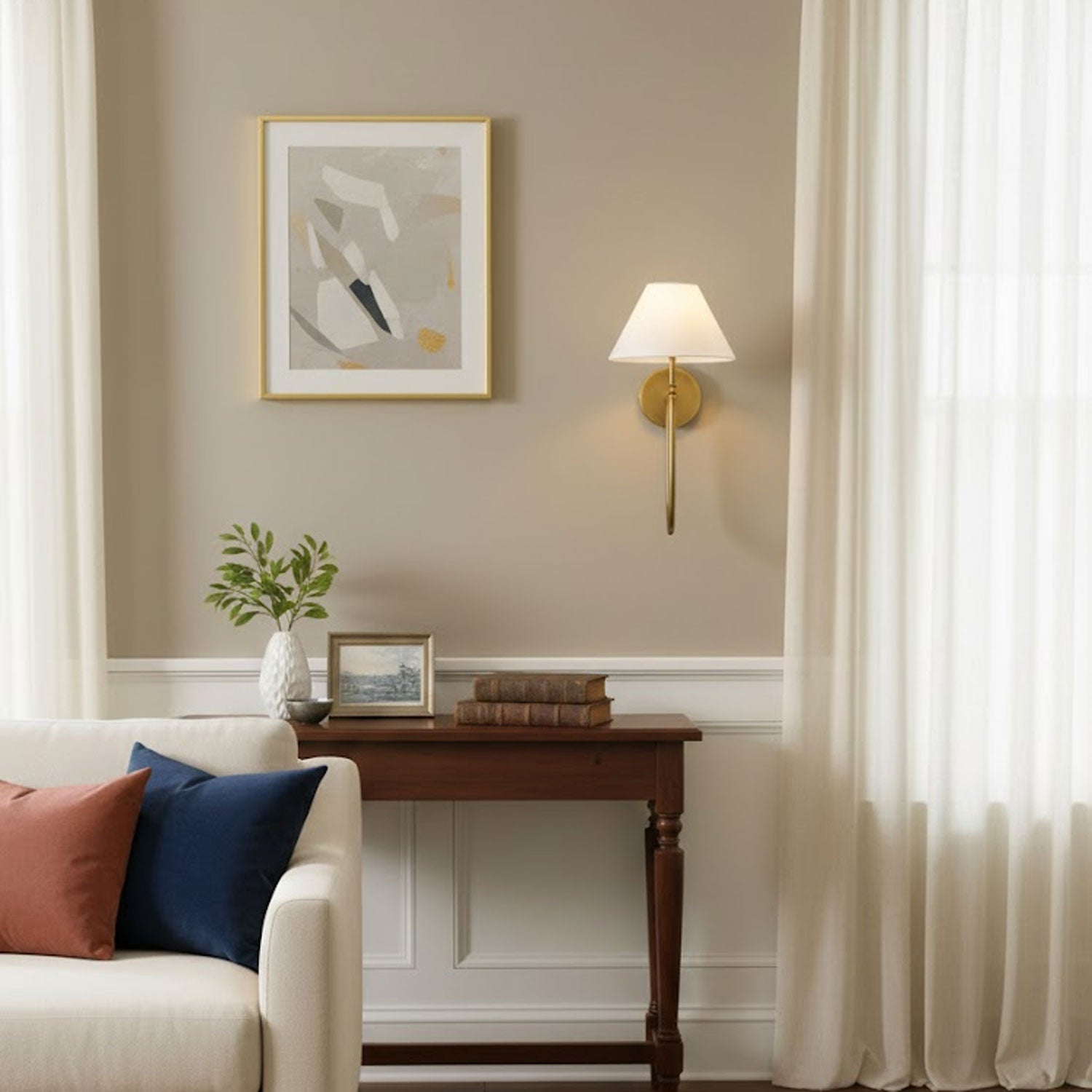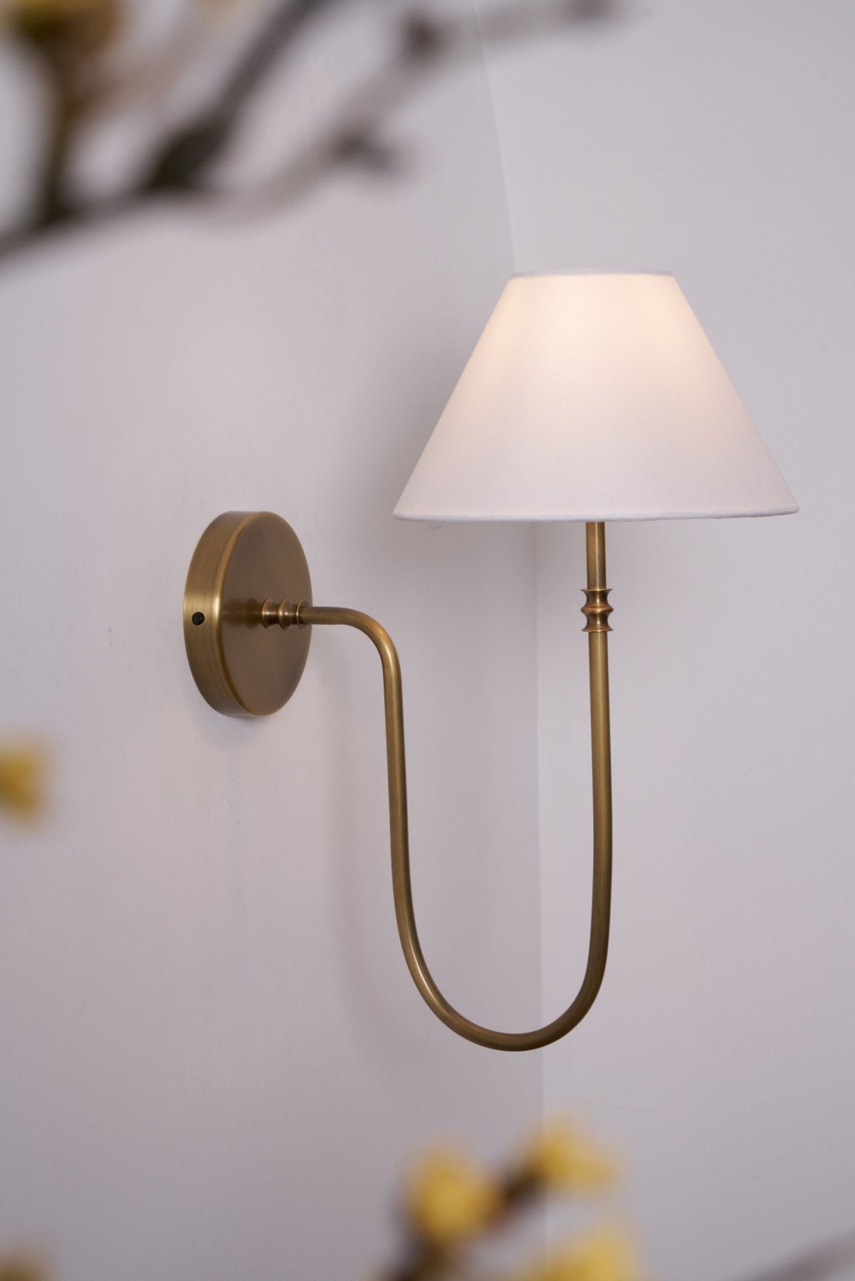 The Collins Wall Light adds a touch of sophistication to any space with its sleek black metal arm, classic white fabric shade, and subtle brass accents. This versatile wall lamp provides bedside lighting or accents living spaces with a soft, warm glow. Elevate your interior with its understated charm and refined design.