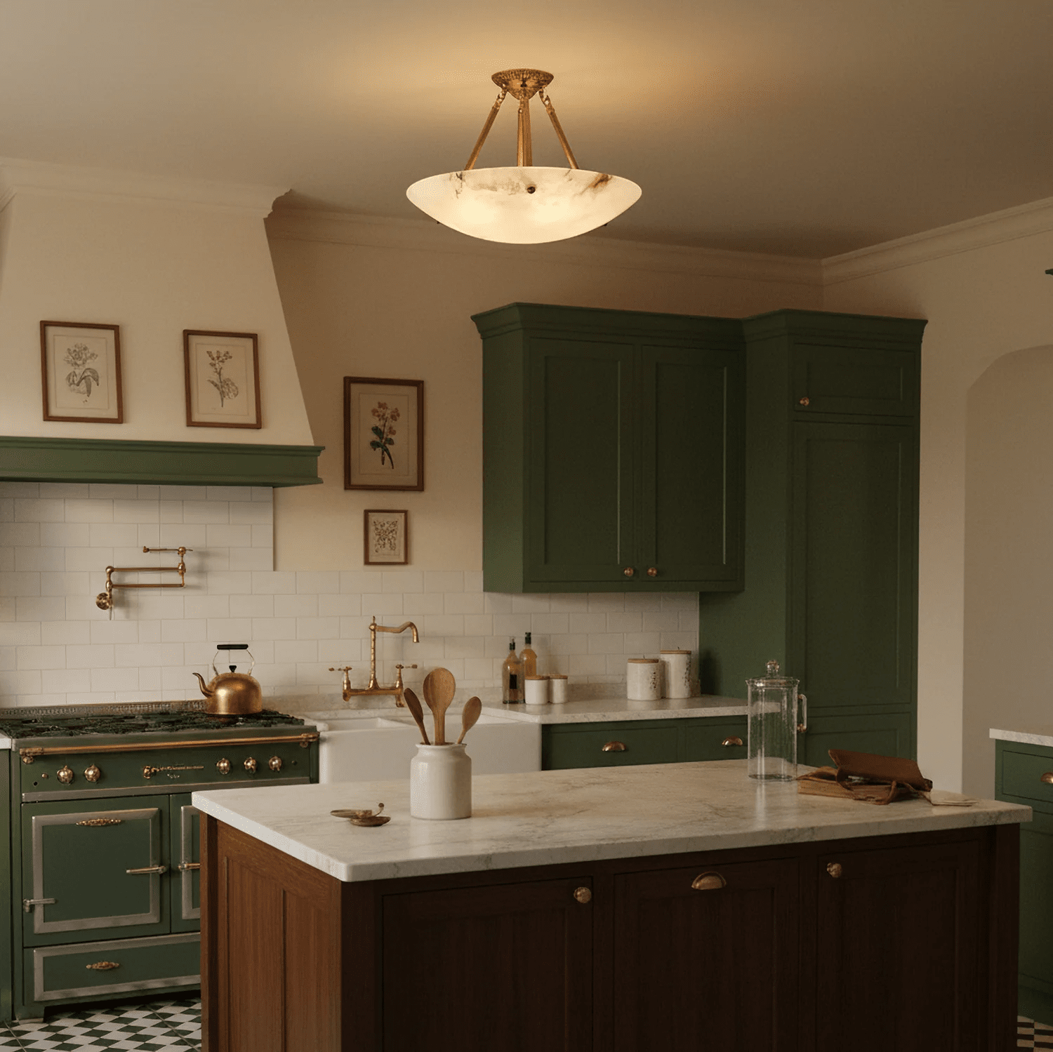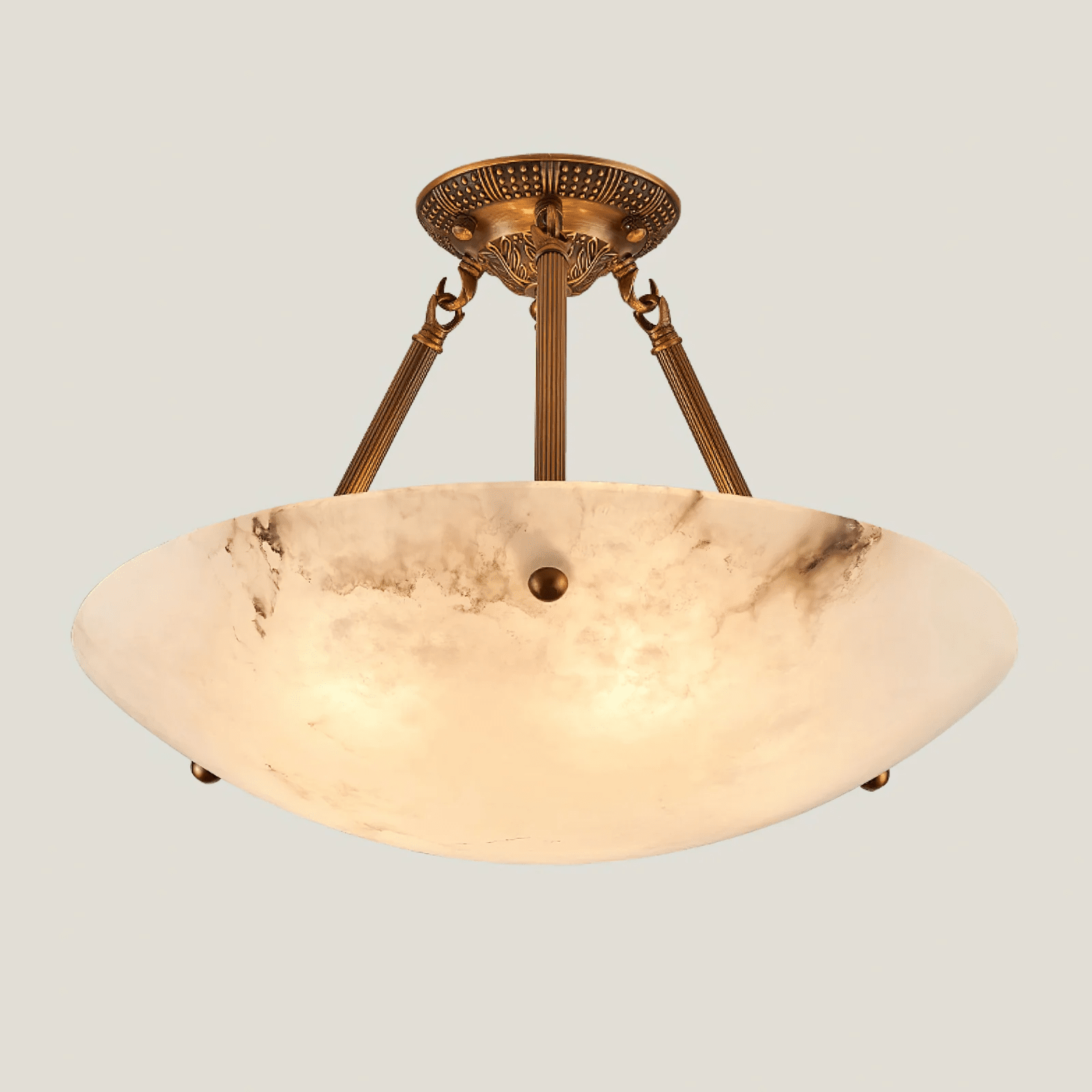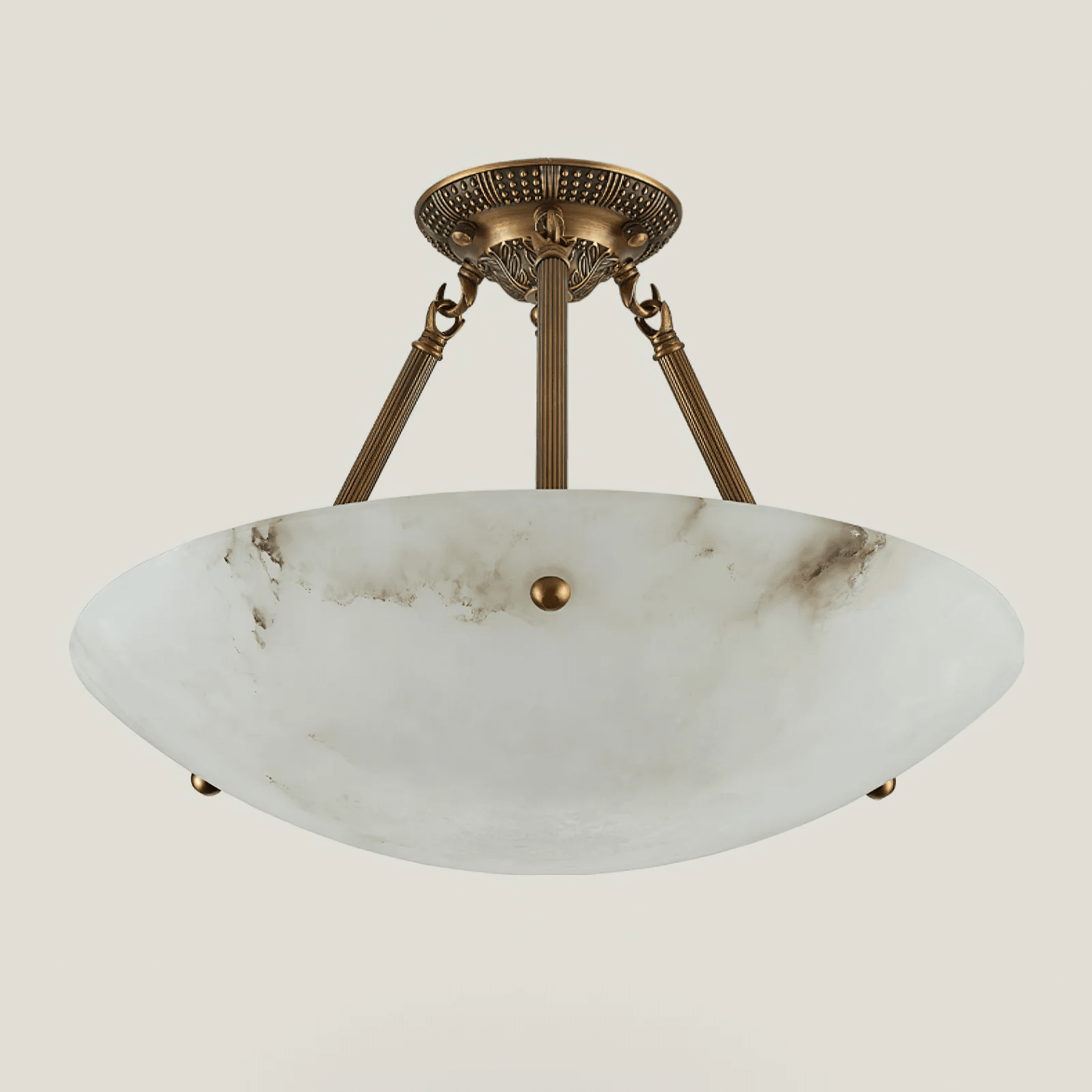 The Vakkerlight Calyra Alabaster Semi-Flush Ceiling Light blends classical structure with the natural elegance of alabaster stone. Featuring a wide, softly curved alabaster bowl with organic cloud-like veining, this fixture is suspended by refined brass arms and a detailed ceiling mount, creating a harmonious balance between architectural strength and natural beauty. When illuminated, the alabaster diffuses light into a warm, gentle glow that fills the space with calm and sophistication. Designed by Vakkerlight for timeless interiors, this ceiling light is ideal for living rooms, dining areas, hallways, and grand entryways, offering a refined atmosphere where luxury feels warm, natural, and enduring.