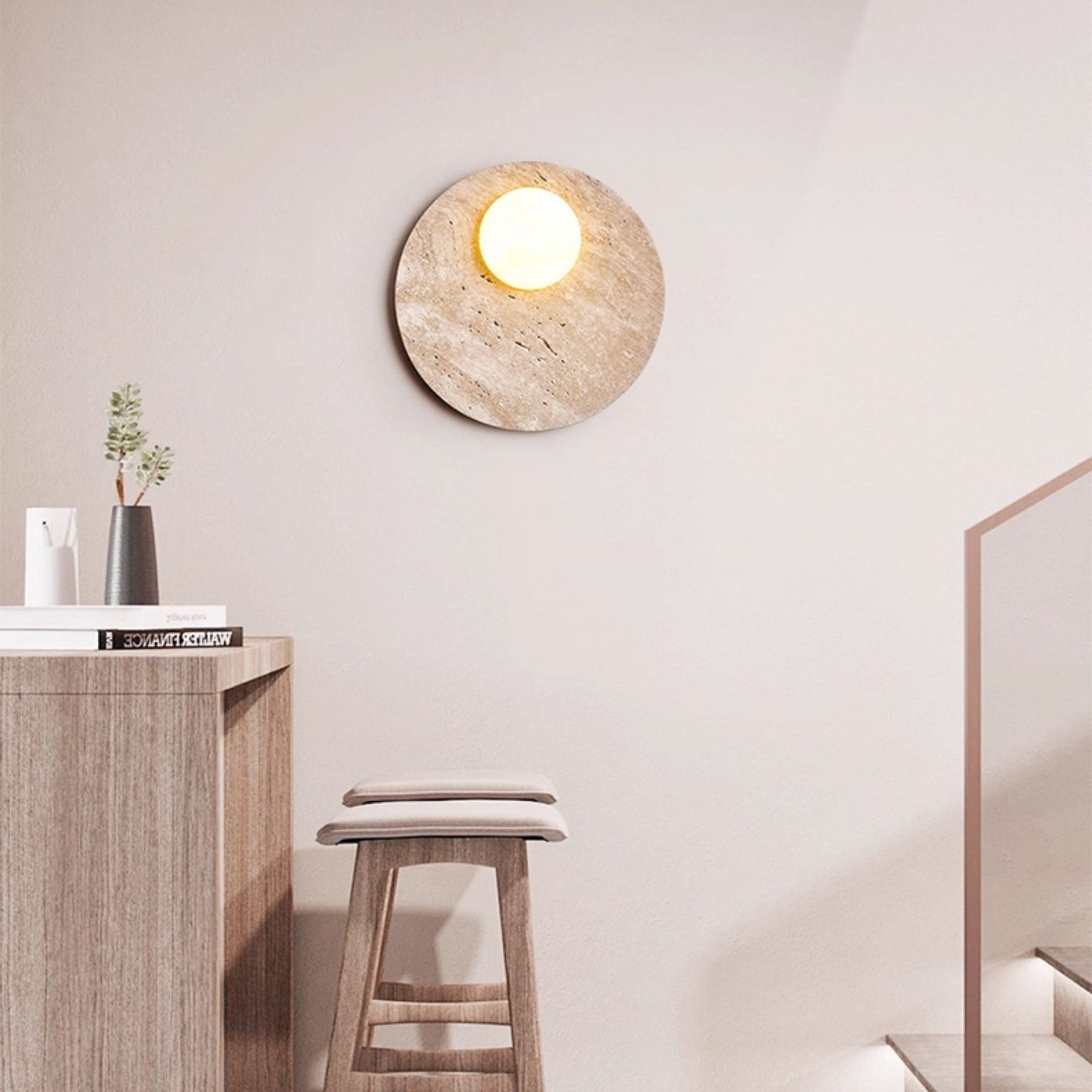 An artistic and refined wall fixture by Vakkerlight, the Terra Lume features a perfectly polished circular face of natural, beige-toned stone with a naturally porous texture. At its core, a luminous, frosted globe emits a soft, uniform light, creating a stark yet harmonious contrast between the ancient beauty of the stone and the modern simplicity of the orb. This unique sconce offers a serene, organic accent, enriching sophisticated interiors with its elemental design and warm ambient glow.