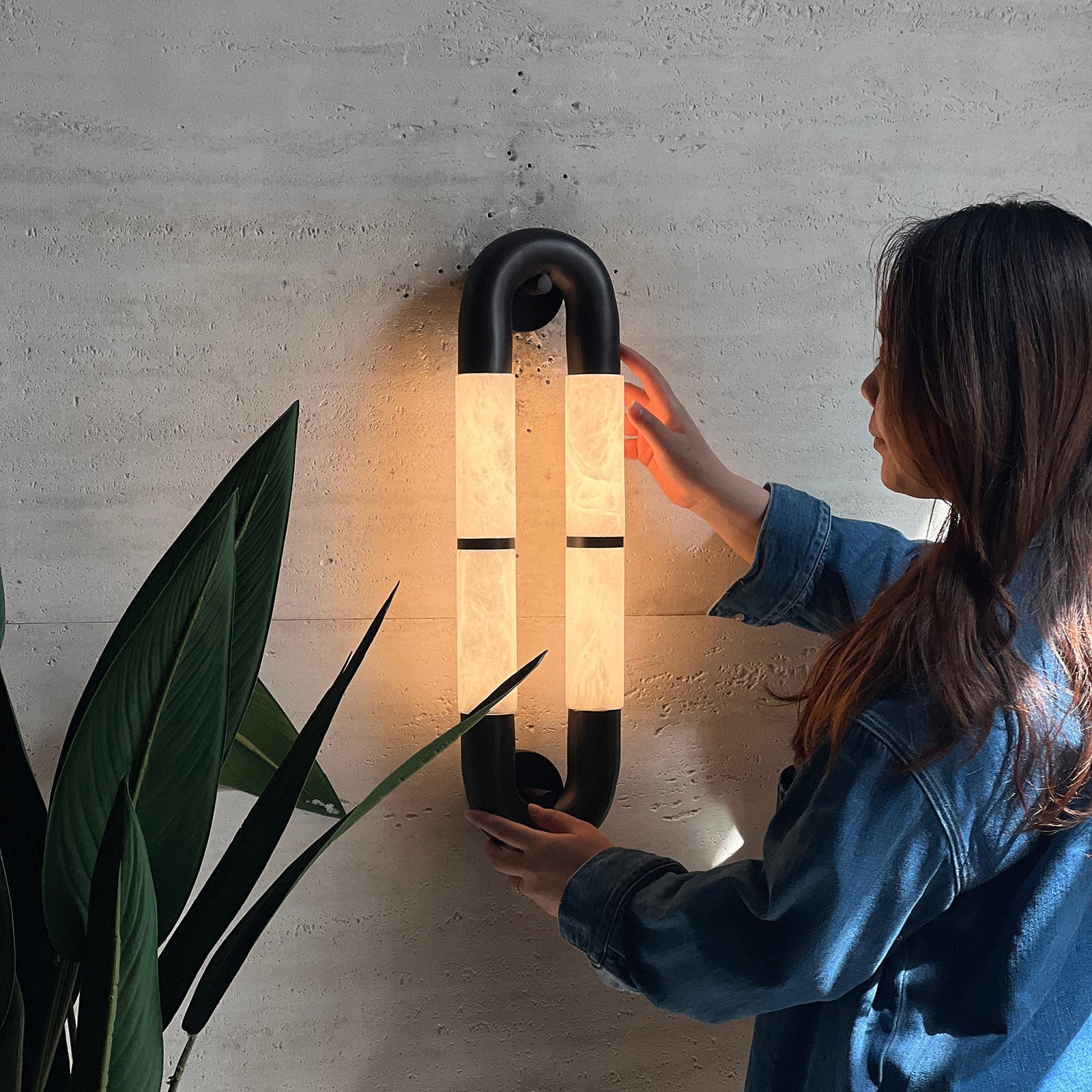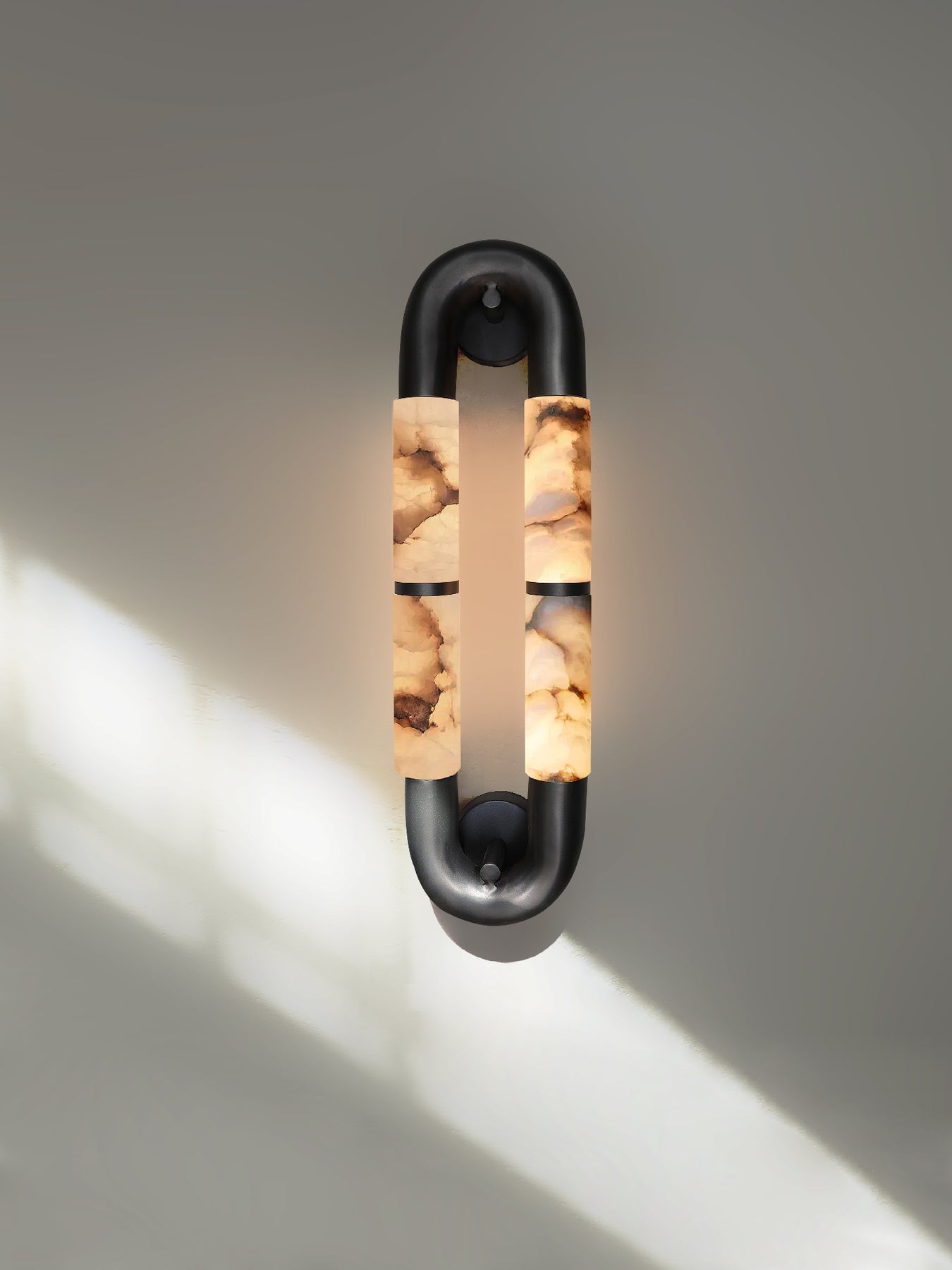 Two alabaster-inspired light columns are held within a sleek U-shaped metal frame, creating a balanced interplay of softness and structure. The result is a wall fixture that feels modern, architectural, and quietly luxurious—perfect for hallways, bathrooms, or living spaces seeking refined ambient lighting.