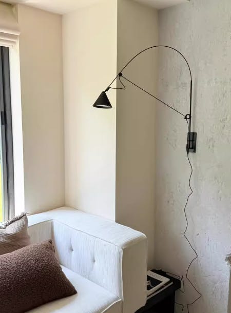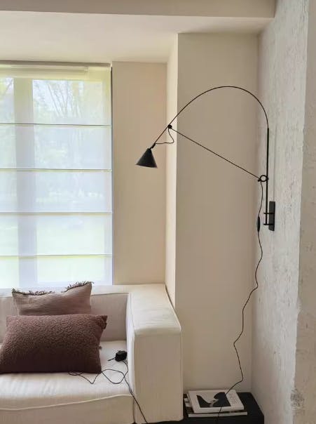 The Ensure Arc Wall Lamp by Vakkerlight is a study in precision, lightness, and playful geometry. A sweeping arc of black metal extends outward, suspended with a vivid red cord that doubles as both a visual statement and structural element. The sharply conical shade adds focus and direction, making it ideal as a reading light or sculptural accent over seating or workspaces.