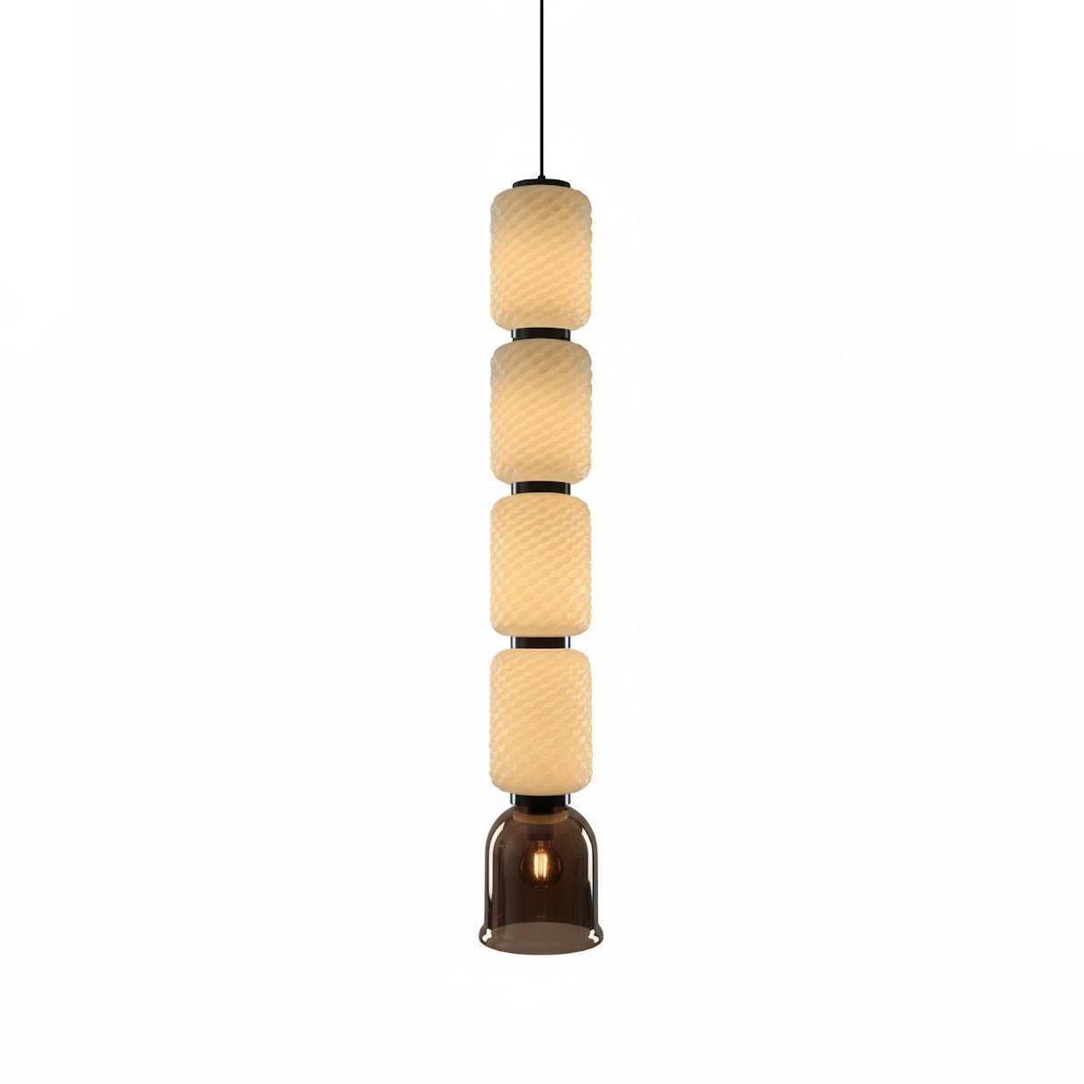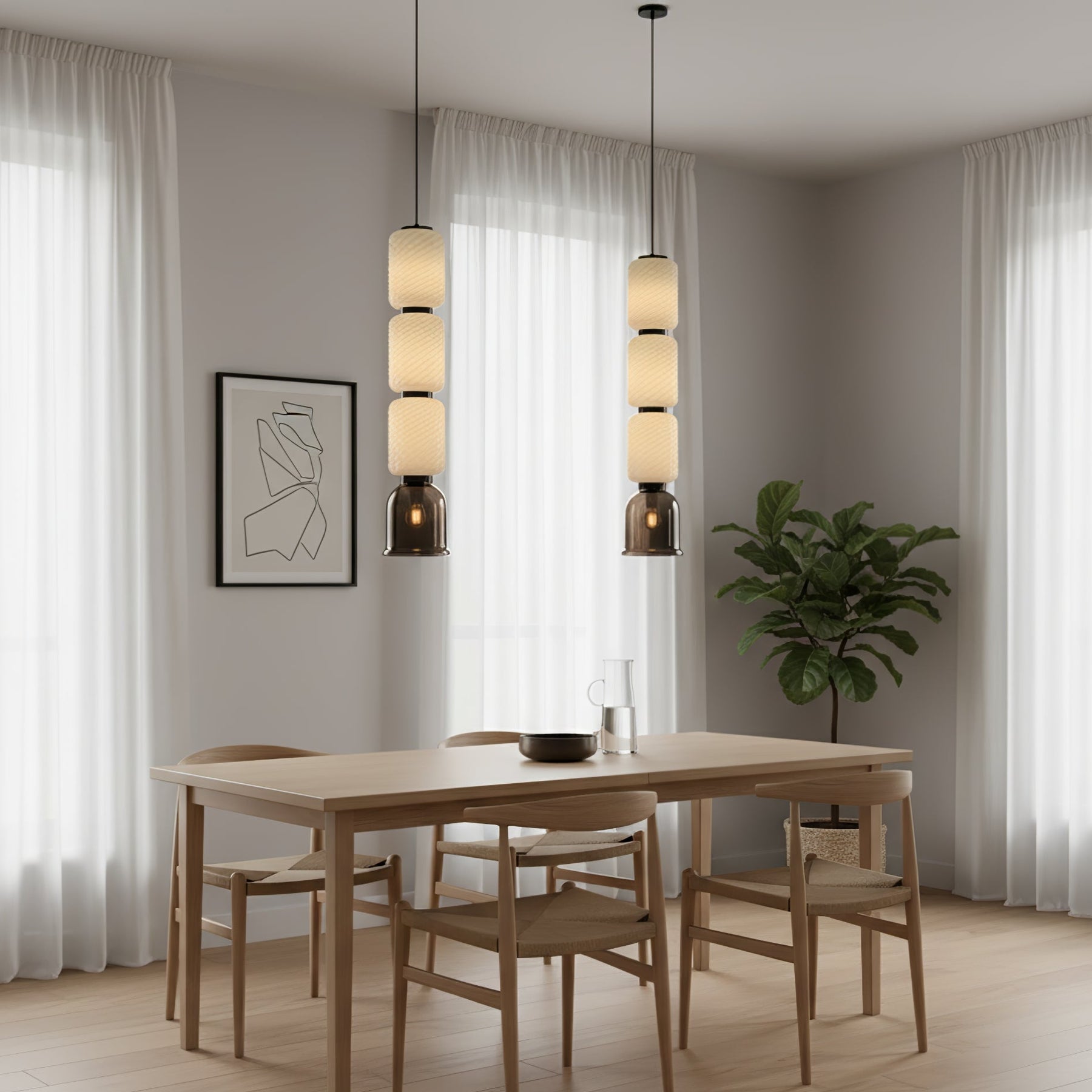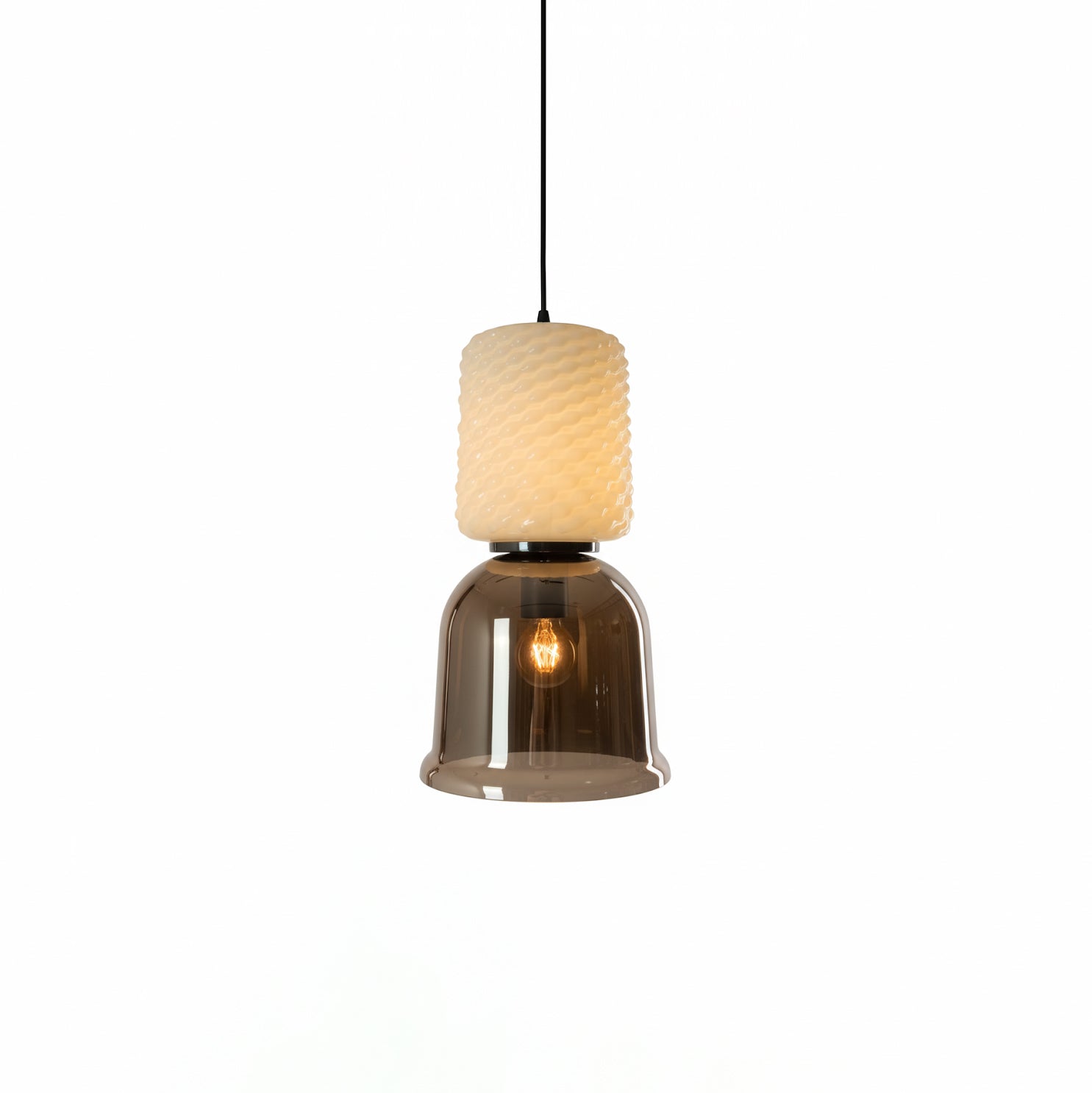 This pendant light features a layered design with textured glass elements and a clear glass bell - shaped lower section. The combination of the textured, creamy - hued upper glass and the transparent lower glass, along with a visible vintage - style bulb, gives it a modern yet retro look. When lit, it emits a warm and intriguing glow, making it suitable for adding a unique touch to dining areas, kitchens, or contemporary living spaces.