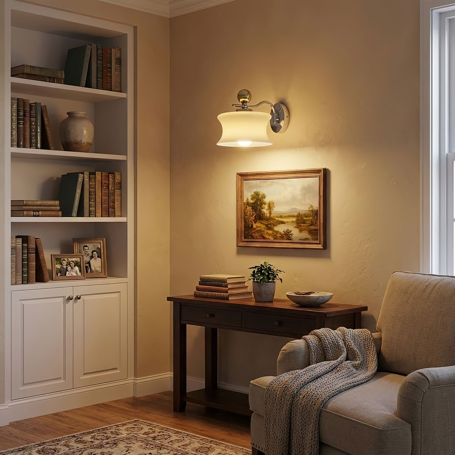Introducing the Adorn Wall Sconce, a stunning lighting fixture designed with a combination of metal and glass materials. The body of the sconce features a beautiful blend of gold and chrome finishes, while the lampshade comes in a sophisticated beige color.