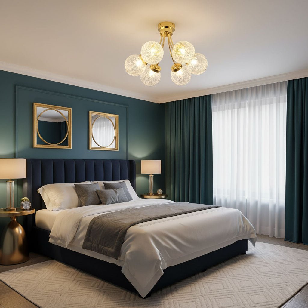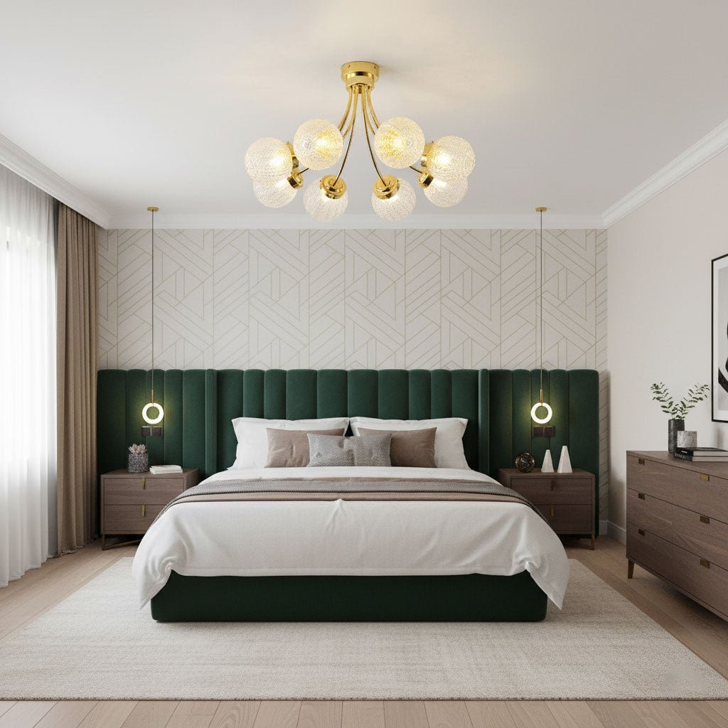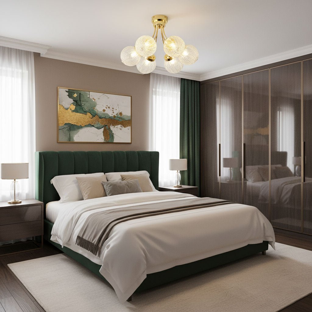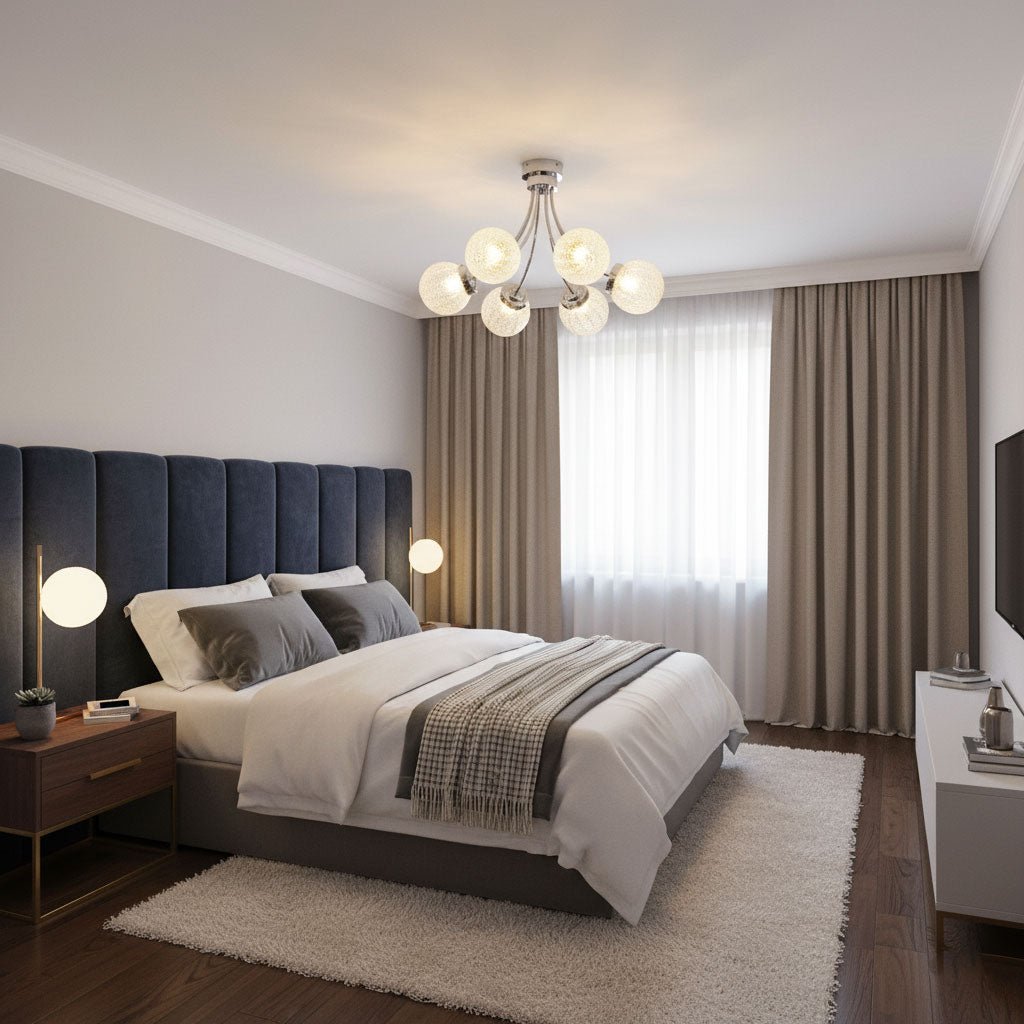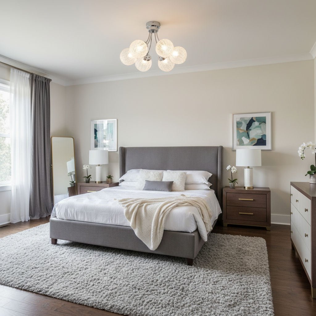 Ceiling Fixtures: Bedrooms benefit from soft, ambient lighting. Use the room dimension formula to ensure the ceiling fixture is properly scaled. Semi-flush or flush mounts work well for general lighting, while sconces or bedside lamps provide focused task lighting.