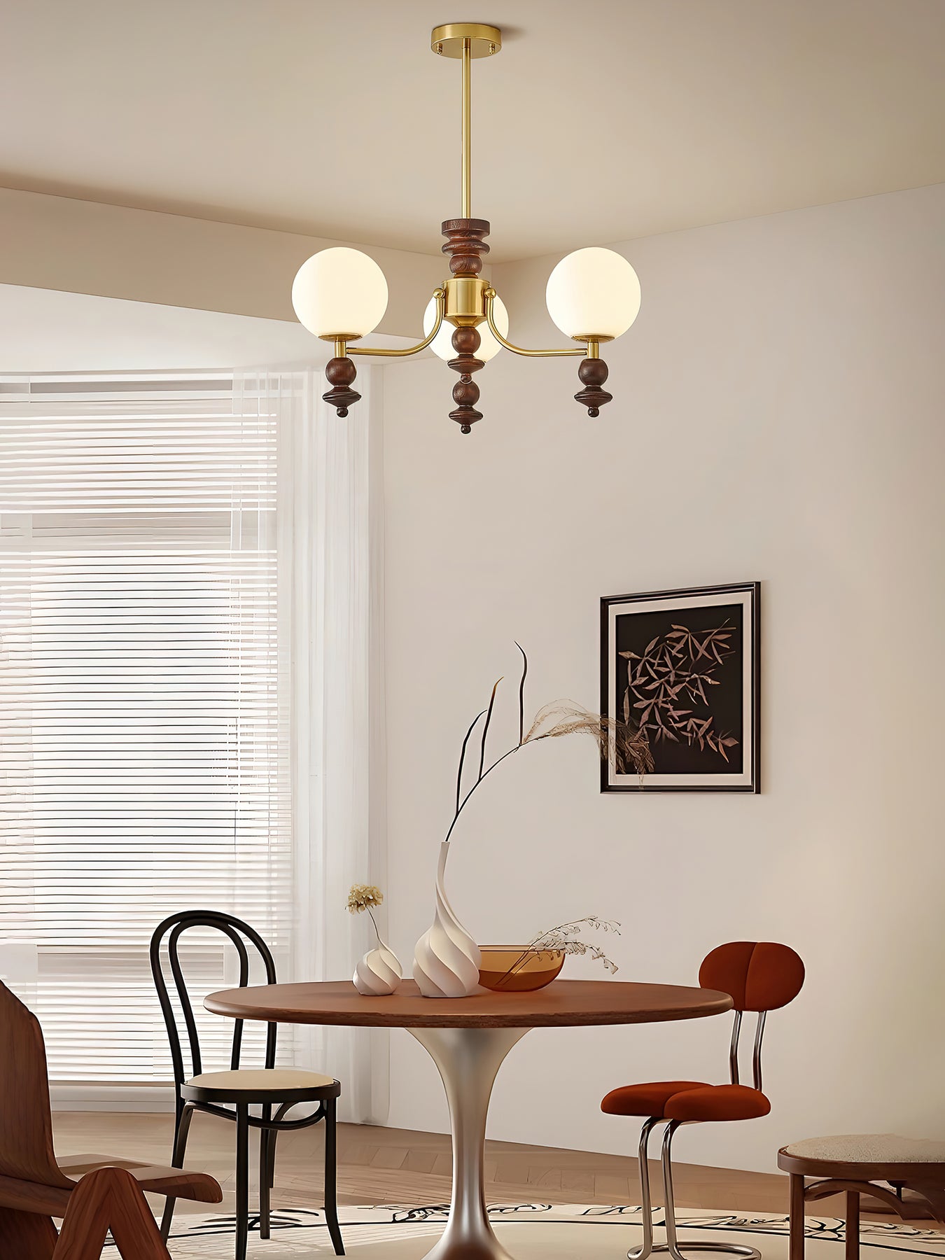 - Chandeliers: As the centerpiece of the dining room, the chandelier should be wide enough to complement the size of the dining table but not so wide that it overwhelms the space. A diameter of 1/2 to 2/3 the table width is a good guide.