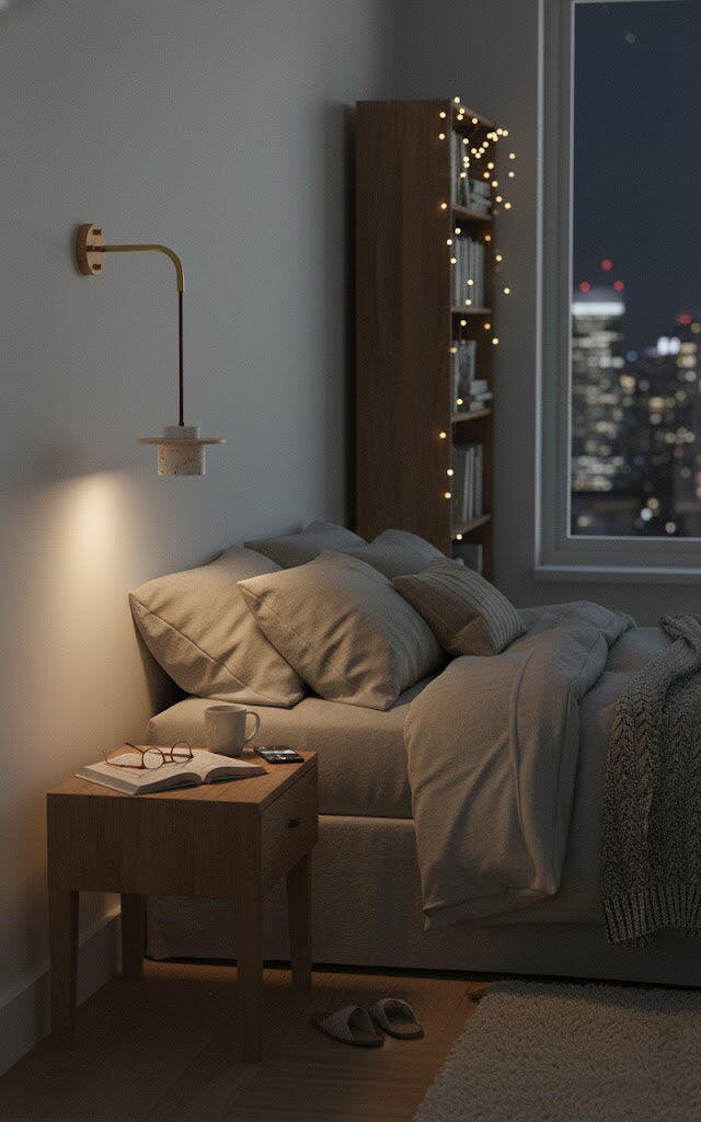 Ceiling Fixtures: Bedrooms benefit from soft, ambient lighting. Use the room dimension formula to ensure the ceiling fixture is properly scaled. Semi-flush or flush mounts work well for general lighting, while sconces or bedside lamps provide focused task lighting.