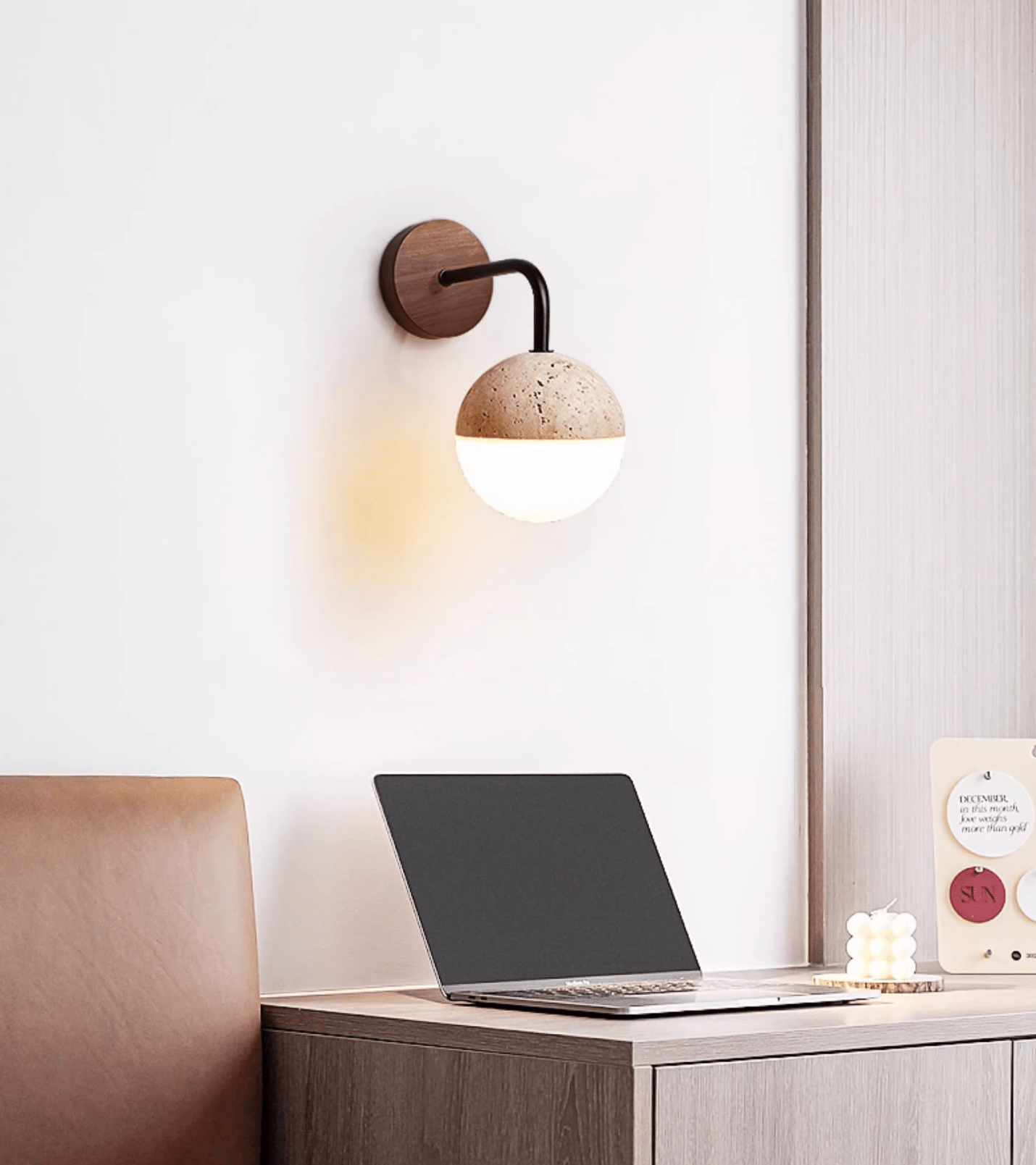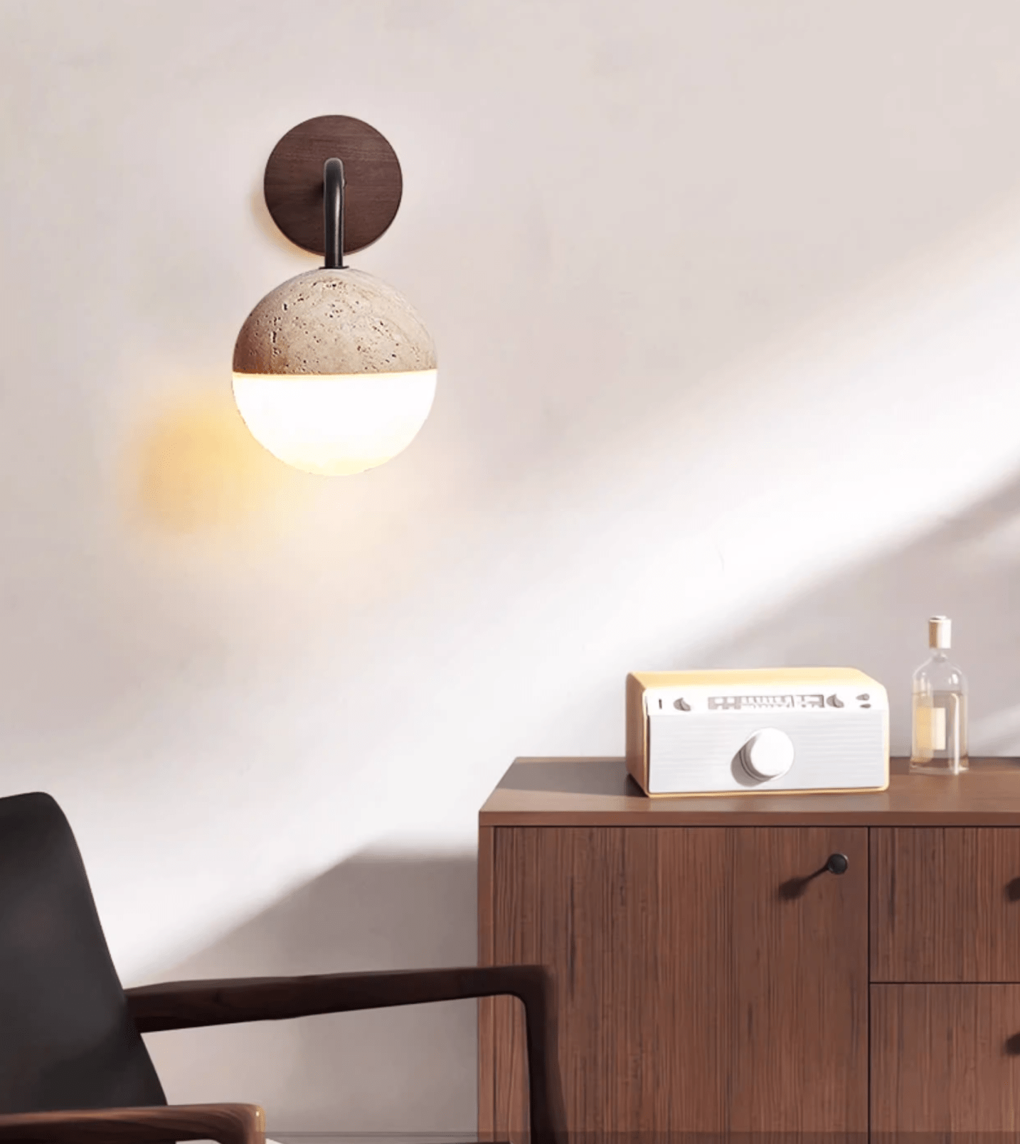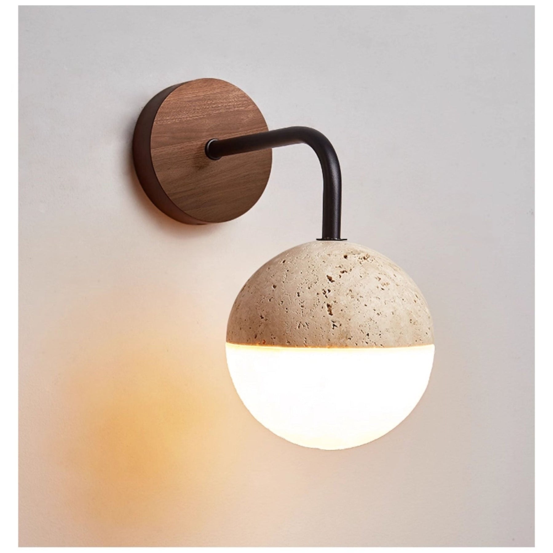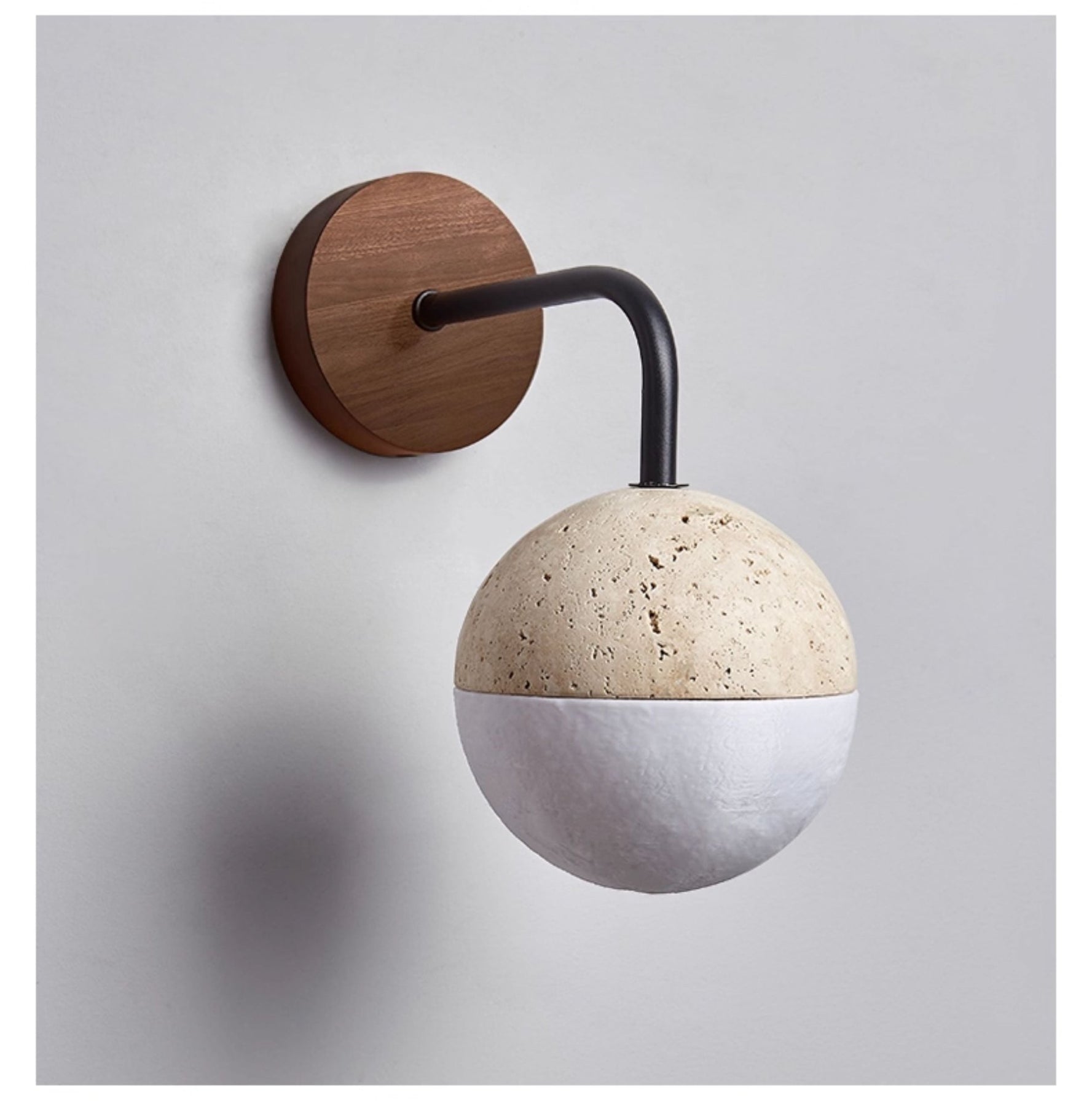 Illuminate your space with the Vakkerlight Moonstone Globe Wall Lamp, a minimalist fixture that seamlessly blends natural textures with soft light. This captivating wall lamp features sleek dark metal arms extending from a warm walnut wall mount. Its unique globe-shaped shade features a naturally textured upper section of yellow travertine and a smooth, matte lower section that emits a soft glow. It's perfect for adding a unique, handcrafted touch and ambient light to a hallway, bathroom, or modern-country interior.