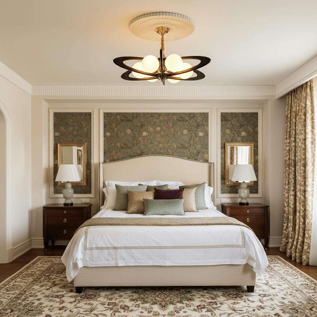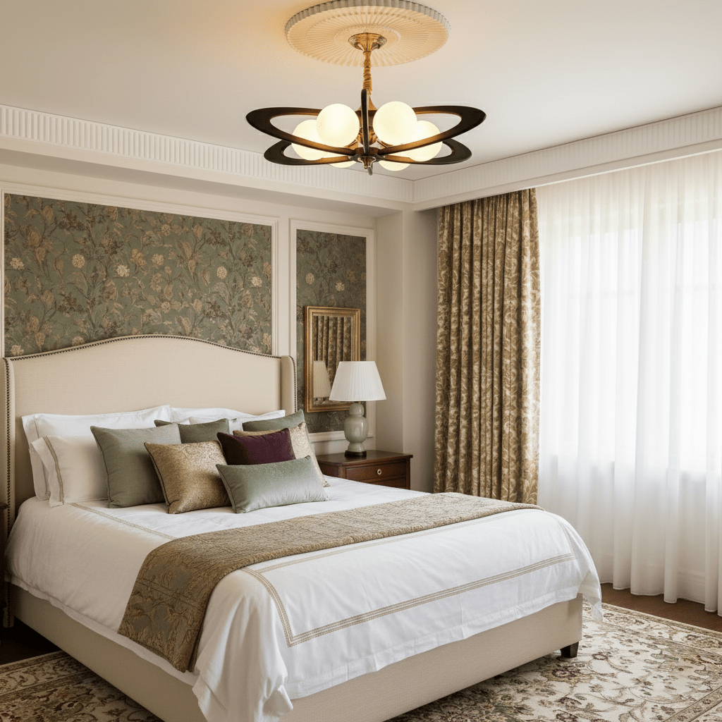 Ceiling Fixtures: Bedrooms benefit from soft, ambient lighting. Use the room dimension formula to ensure the ceiling fixture is properly scaled. Semi-flush or flush mounts work well for general lighting, while sconces or bedside lamps provide focused task lighting.