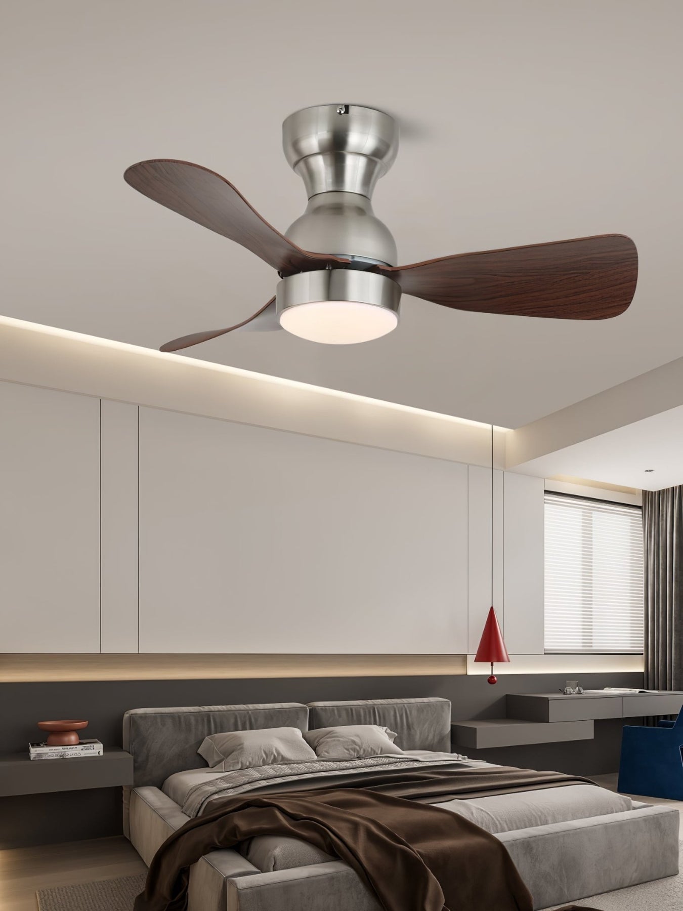 The Civico Spin blends brushed metal and deep wood tones into a streamlined silhouette that’s both functional and refined. Its three sculpted blades ensure quiet airflow, while the integrated LED casts a warm, ambient glow—ideal for lofts, studios, or minimal interiors. Perfect for those who appreciate a balance of form and function in compact spaces.