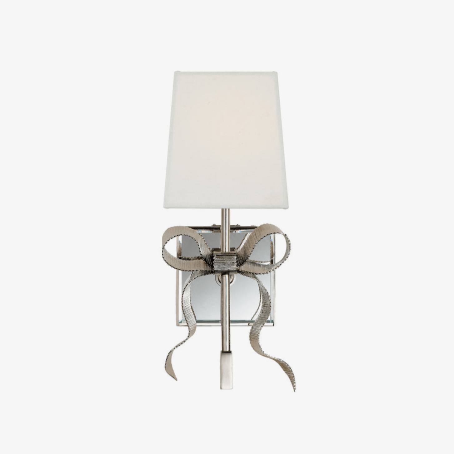Charming and elegant, the Belle Bow Wall Sconce by Vakkerlight brings a touch of romantic sophistication to any interior. Featuring a delicately sculpted metallic bow wrapped around a sleek vertical stem, this piece exudes femininity and glamour. The gleaming mirrored backplate enhances its sparkle, while the crisp white fabric shade diffuses light gently, creating a warm and inviting glow.