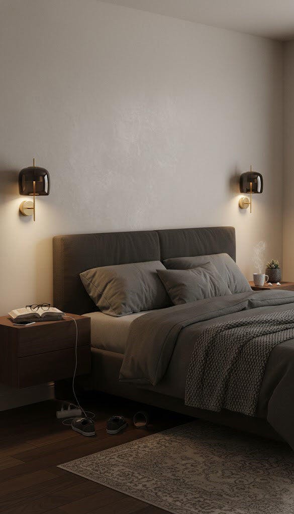 Task Lighting: Bedside lamps or wall sconces should be proportionate to the size of the nightstands and the bed. The lamp height should be roughly at eye level when sitting in bed.