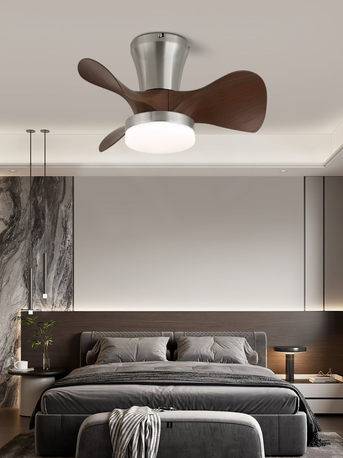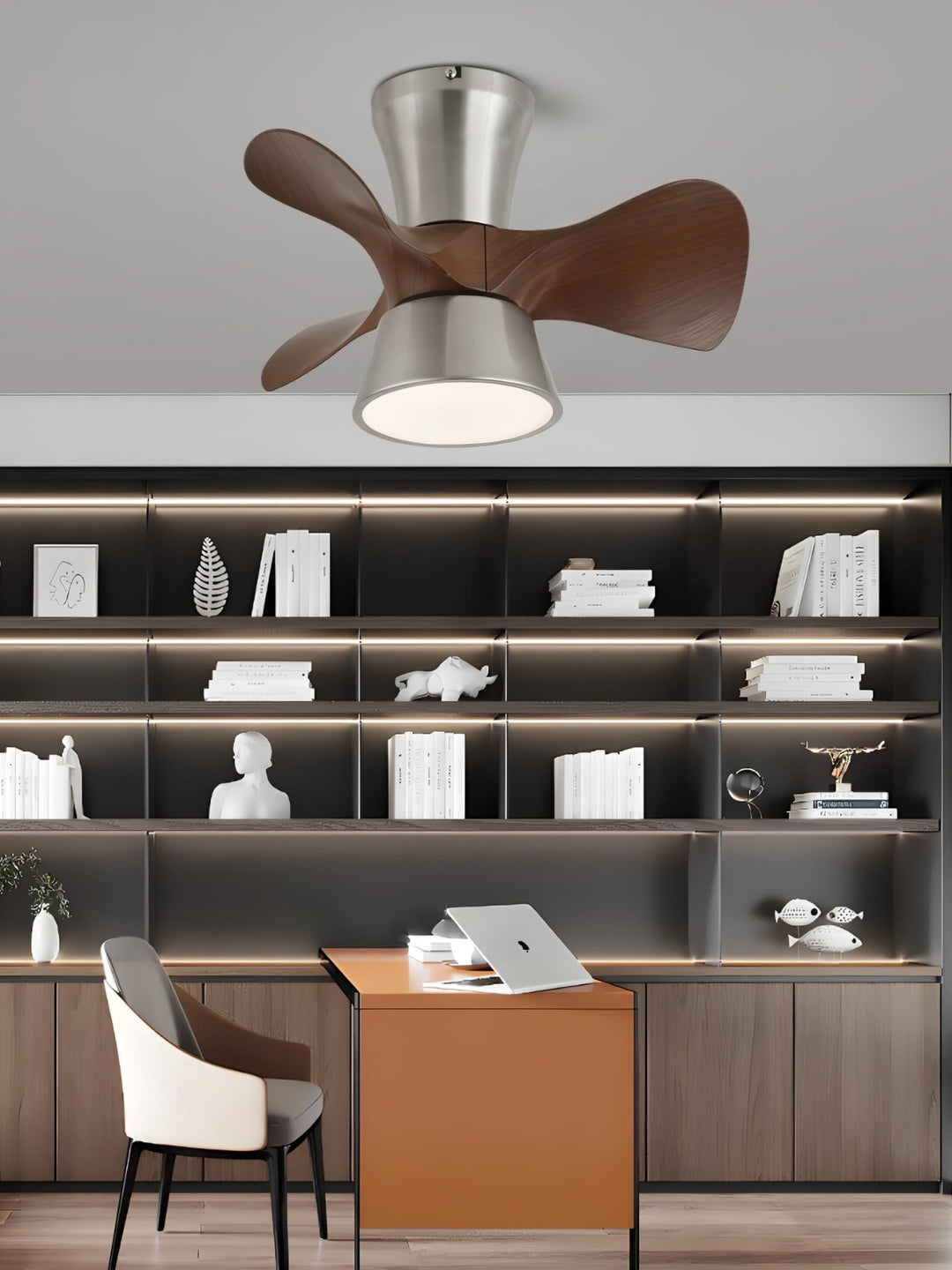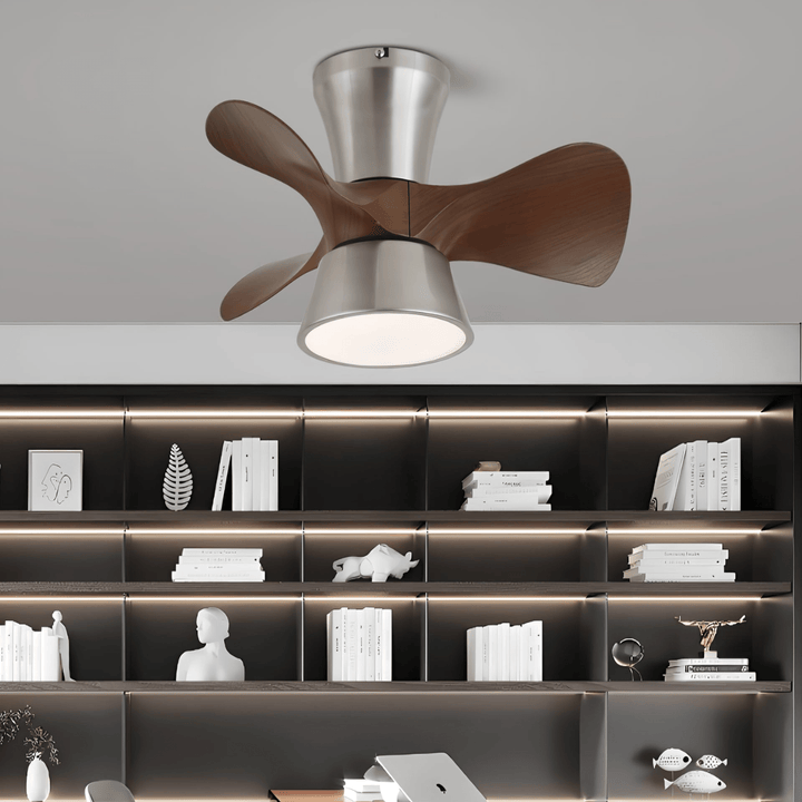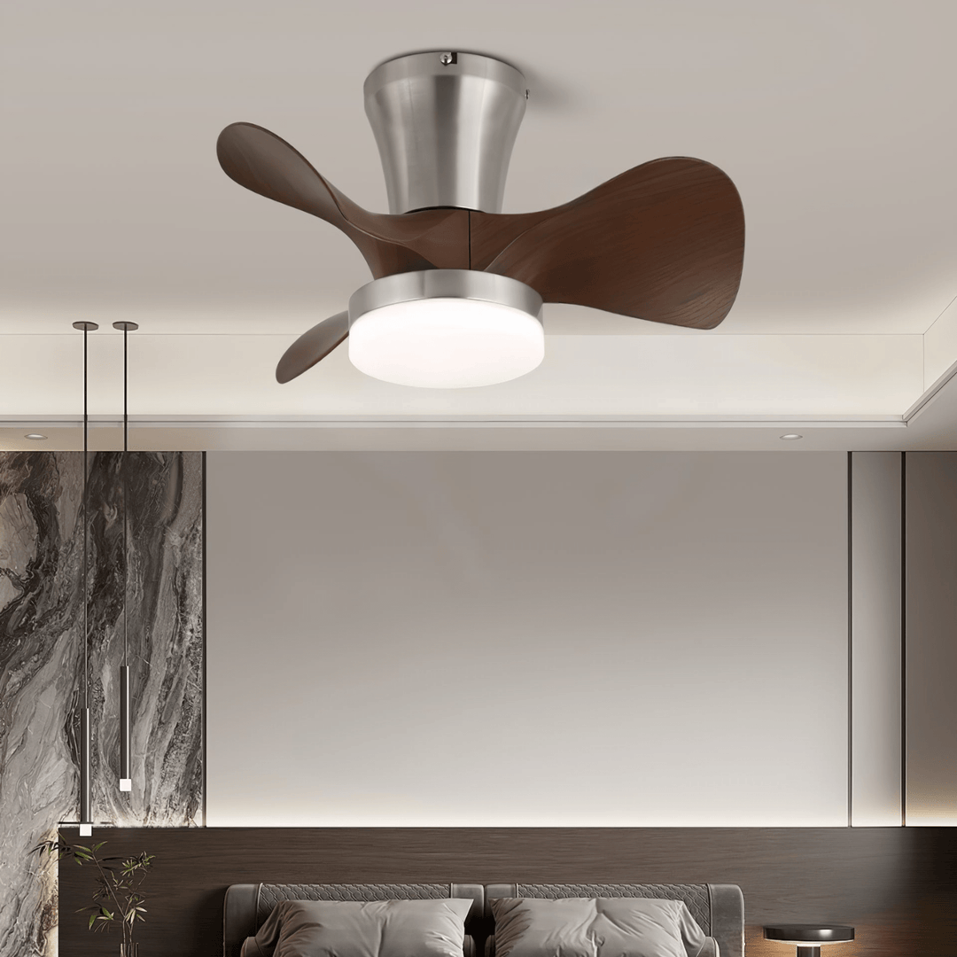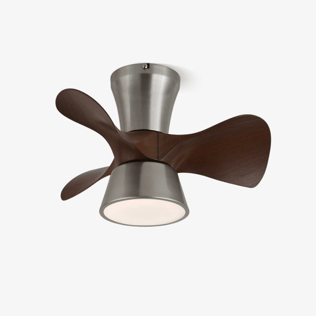 The Arvento Ceiling Fan Light fuses aerodynamic design with warm illumination. Featuring gracefully curved wood-finish blades and a brushed metal body, it delivers efficient airflow and ambient light in one sleek, low-profile form. Perfect for contemporary homes with limited ceiling clearance, this fixture brings both function and flair to bedrooms, kitchens, or studios.