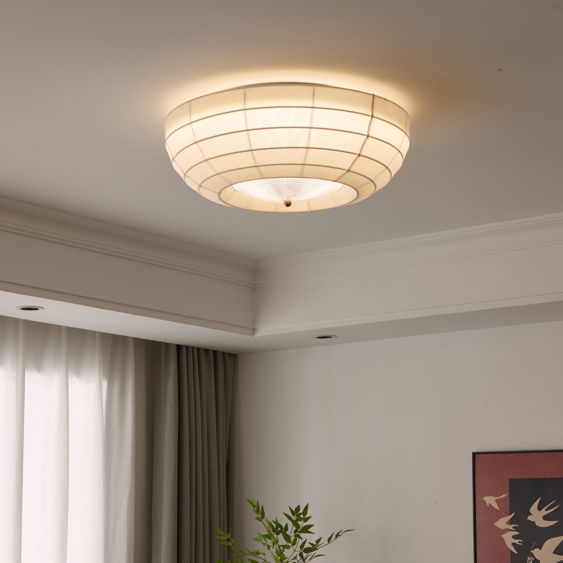 Inspired by the serene elegance of traditional paper lanterns, the Vakkerlight Hana Ceiling Light brings soft sophistication to your interiors. Featuring a layered fabric shell with graceful horizontal ribs and a central crystal diffuser, Hana offers both ambient and downward illumination. The warm glow gently filters through the translucent shade, creating a calming atmosphere ideal for bedrooms, hallways, or tranquil living spaces. A brass finial completes the design with a subtle touch of refinement. Let Hana bloom gently overhead, radiating harmony and warmth.