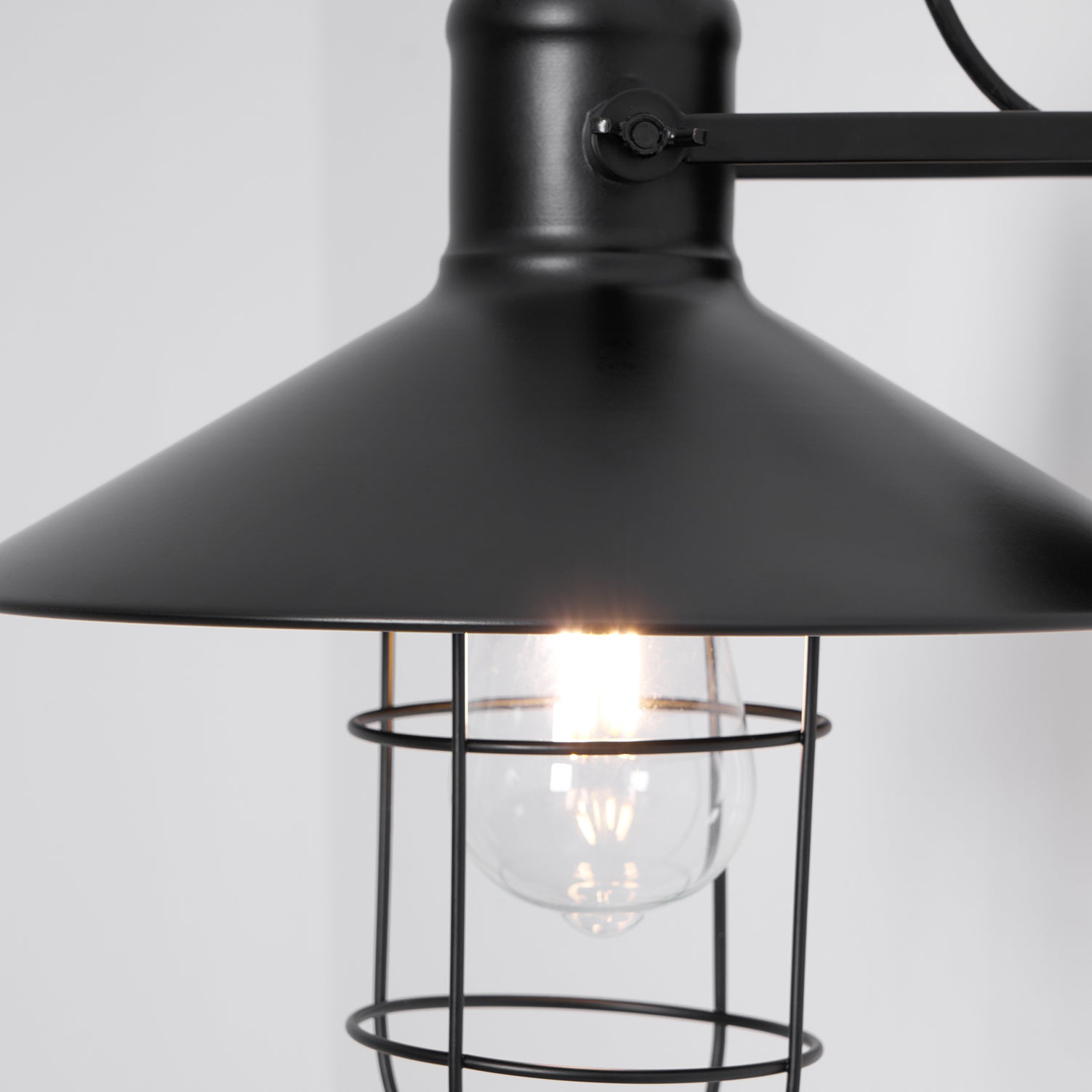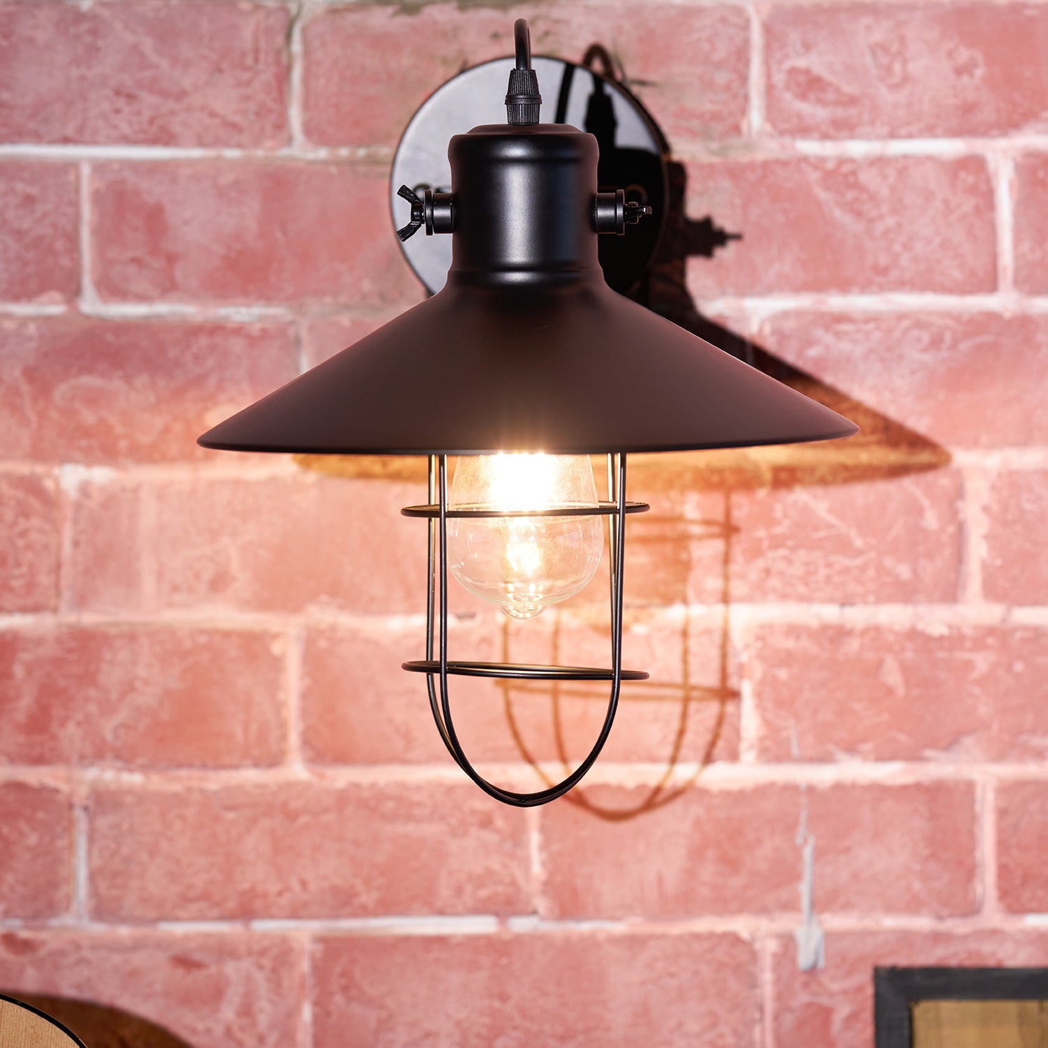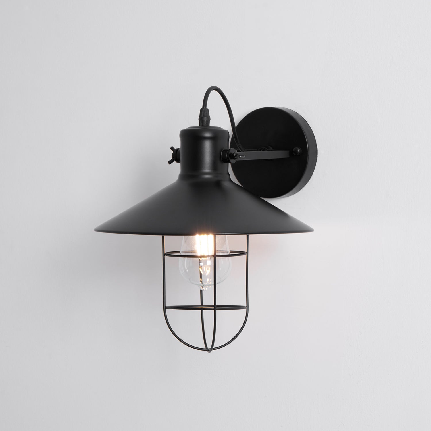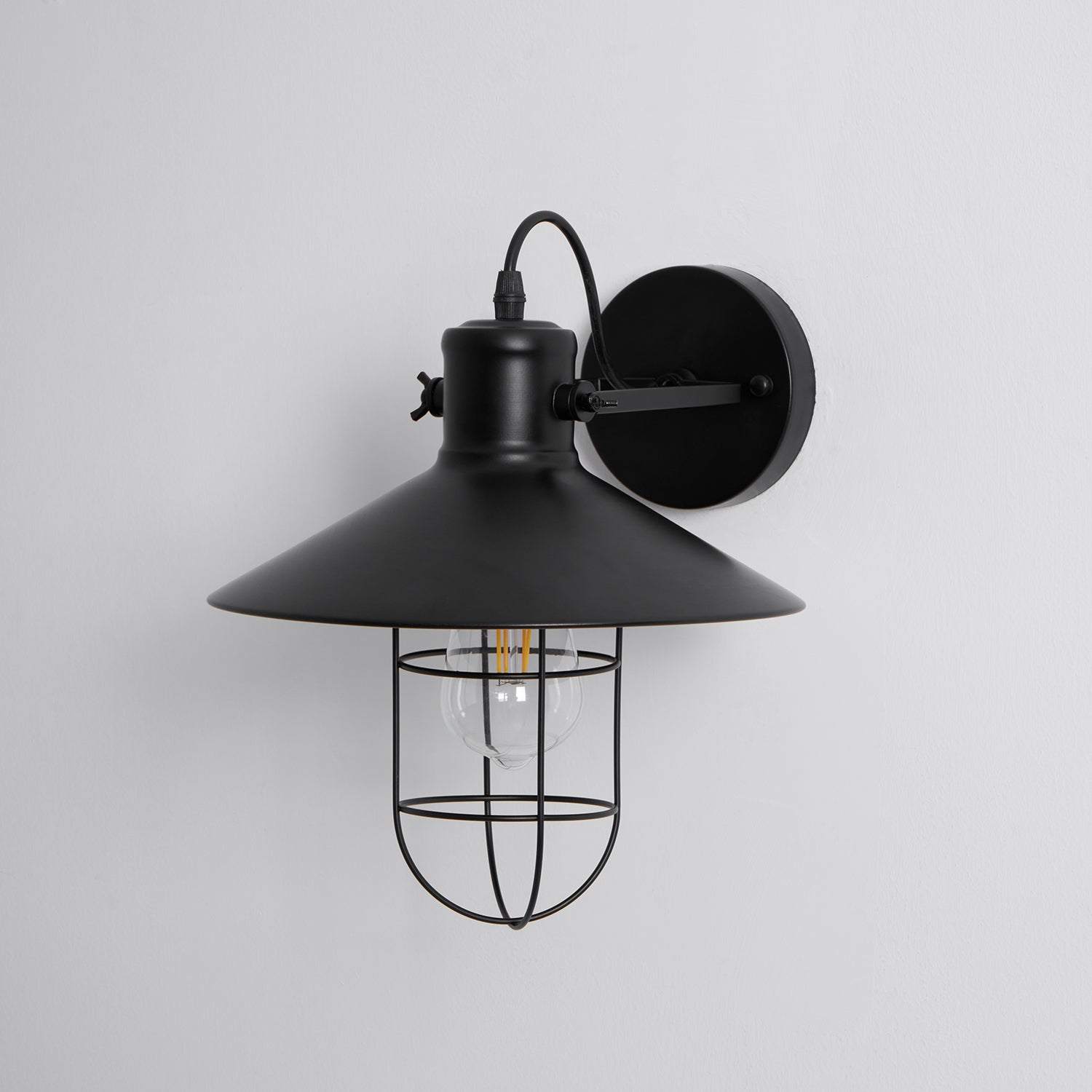 The Harbour Industrial Wall Light draws inspiration from classic wall lamps. Constructed with a transparent glass dome and metal wire cage, this wall light provides protection for the inner bulb and features a canopy top for added durability. Suitable for covered entrances, balconies, covered patios, or under a canopy outside.