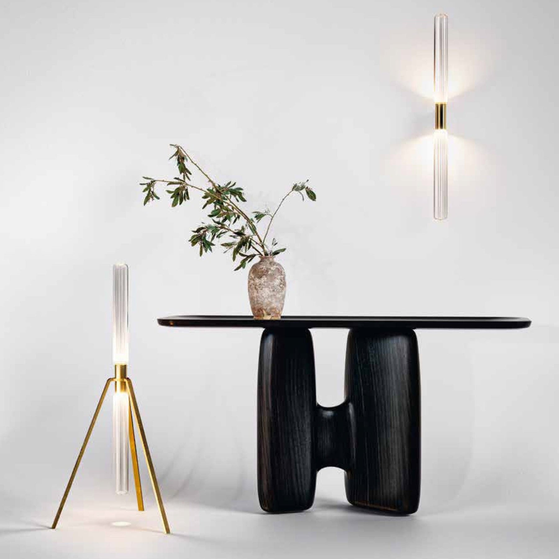 This piece features a series of hand-blown crystal cylinders with clean, precise cuts. Light emanates only from the polished connection points, with the sources ingeniously hidden to create a soft, ambient effect. The linear arrangement of glowing cylinders creates a versatile statement piece, blending heritage craft with a contemporary sensibility.
