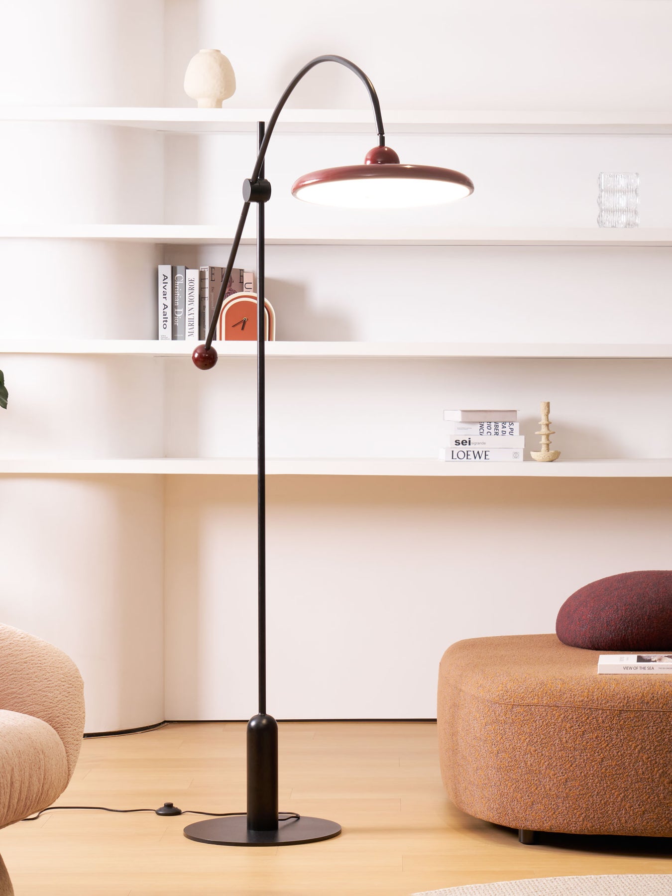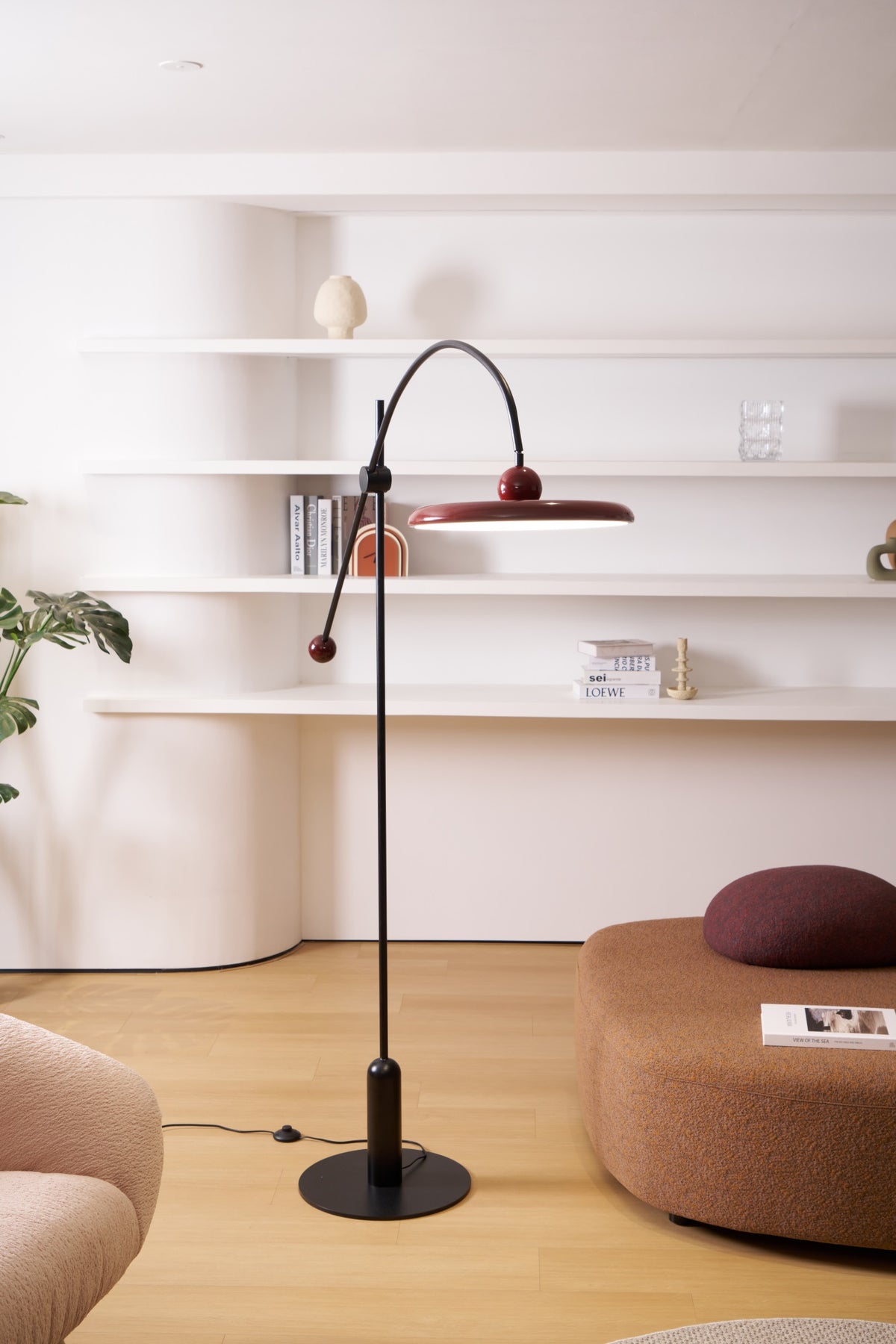 Meet the Lola Floor Lamp — a sculptural statement piece that fuses minimalist structure with playful asymmetry. Its bold arc and counterweighted silhouette evoke balance and motion, while the glossy red dome shade adds a punch of color and modern character. Perfect for reading corners, design-forward living rooms, or anywhere you want form and function in harmony.