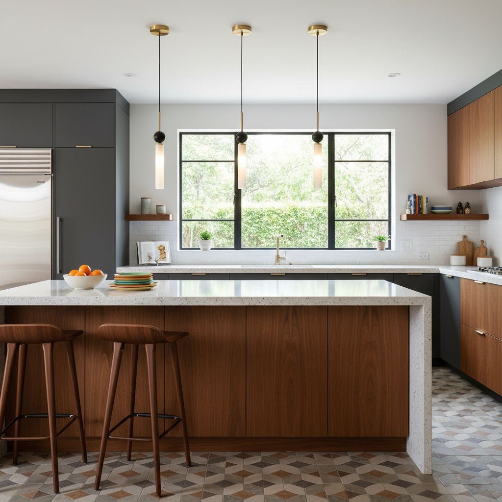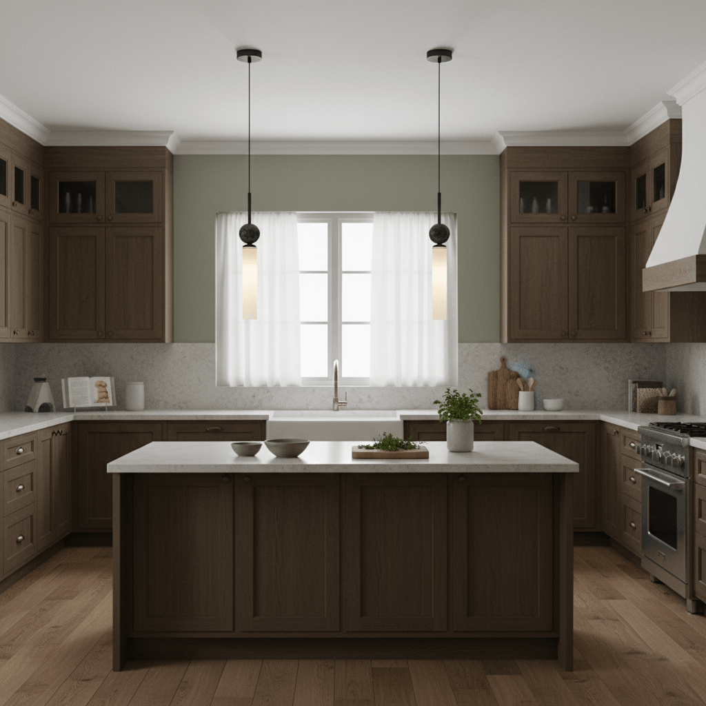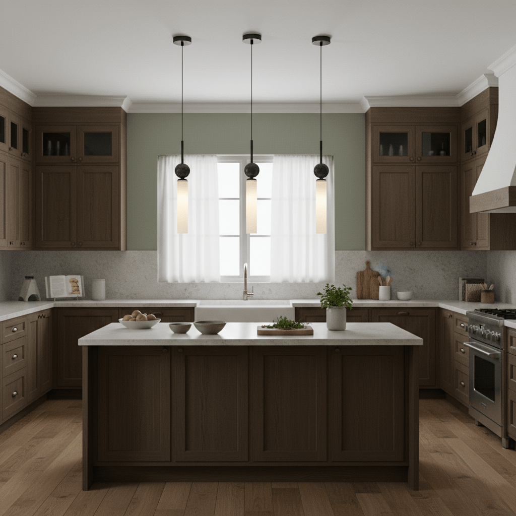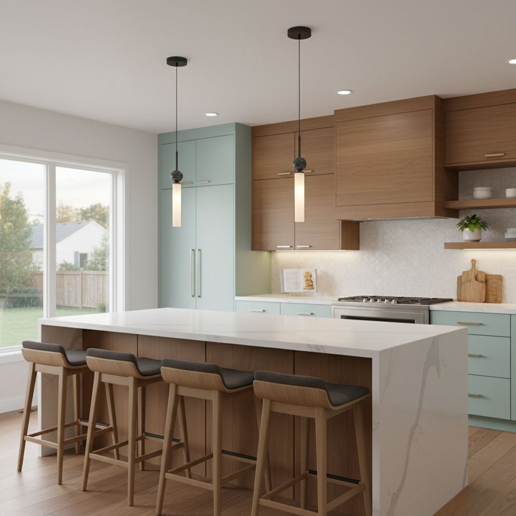 Pendants Over Island: These provide crucial task lighting for food prep and should hang 32-36 inches above the surface. Make sure that each pendant is about 1/4 the length of the island to provide sufficient coverage without overwhelming the space.