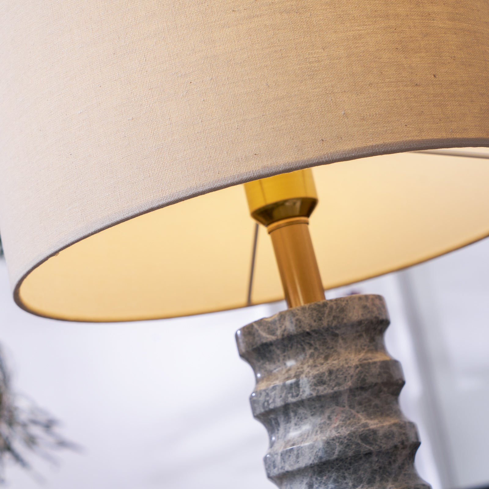 The Rivara Stone Table Lamp by Vakkerlight features a sculpted marble base with a wave-like texture, anchored by a brushed brass ring. Topped with a neutral linen shade, this piece balances organic form and refined elegance—ideal for modern bedrooms, living rooms, or reading corners.