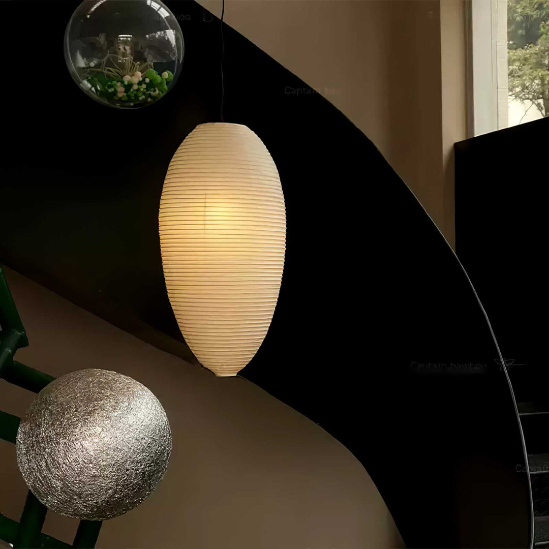 Illuminate your space with the warm and enchanting beauty of the Washi Paper Chestnut Pendant Lamp. Handmade from the inner bark of the mulberry tree, this Akari 23A 24A Pendant Lamp emulates traditional paper doors, casting a warm glow and creating a pleasant ambiance. Inspired by sunlight filtering through, this designer light is sure to add a touch of elegance to any room.