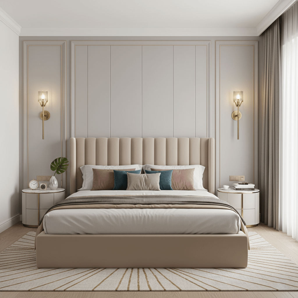 Task Lighting: Bedside lamps or wall sconces should be proportionate to the size of the nightstands and the bed. The lamp height should be roughly at eye level when sitting in bed.