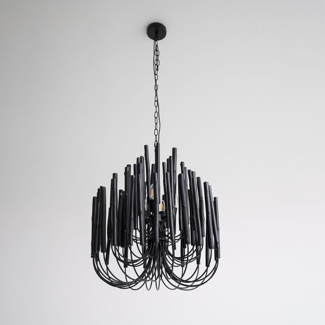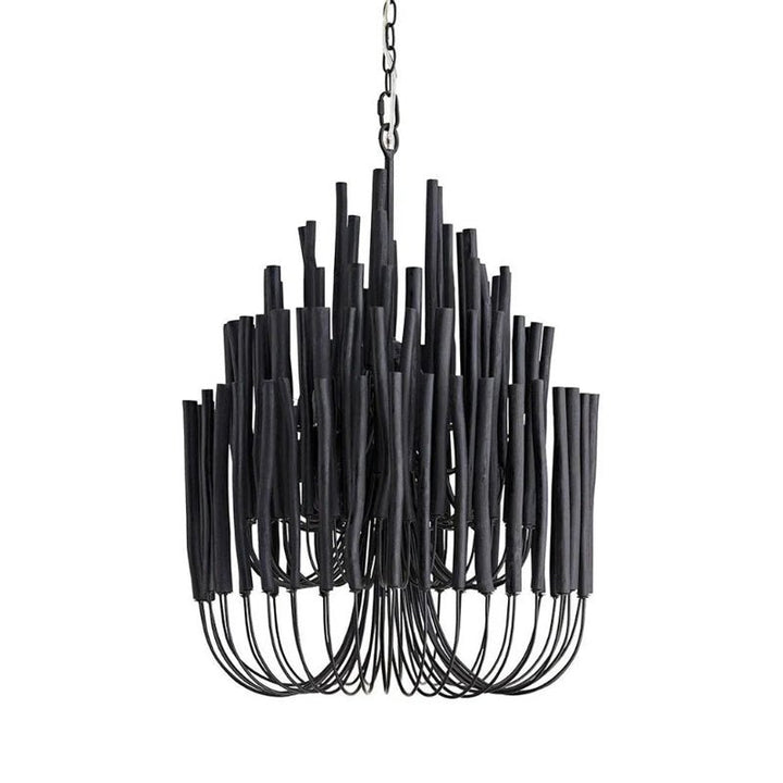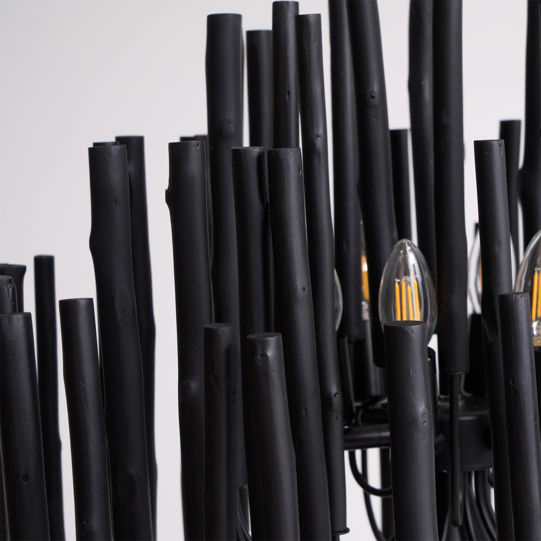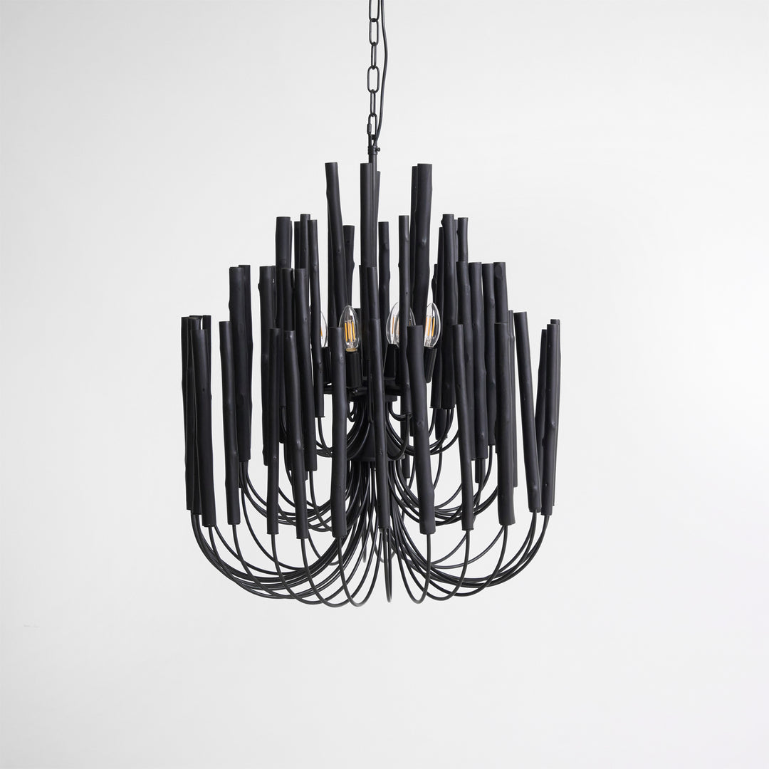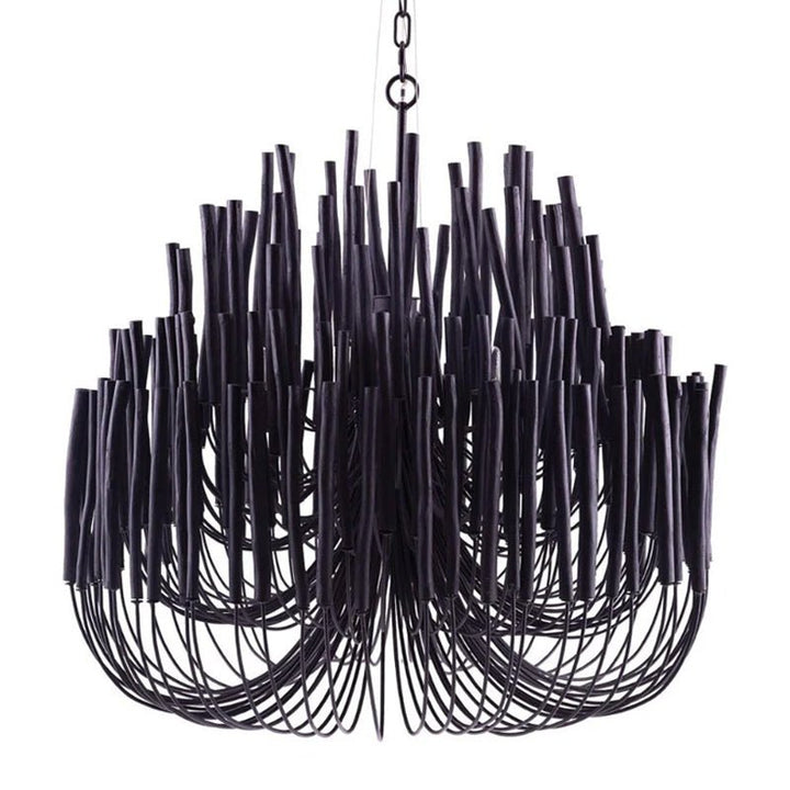 Each Swinton Chandelier is carefully constructed from layered, natural wooden rods and supported by smooth, curved iron arms. We celebrate the natural characteristics of the wood, which means the texture, color, and shape of every rod are unique, crafting a genuine "one-of-a-kind" masterpiece for you. This organic yet layered structure cleverly balances rustic natural charm with clean, sharp modern lines.
