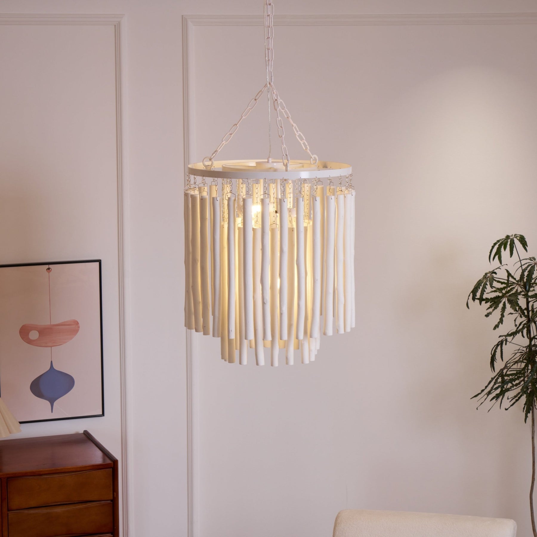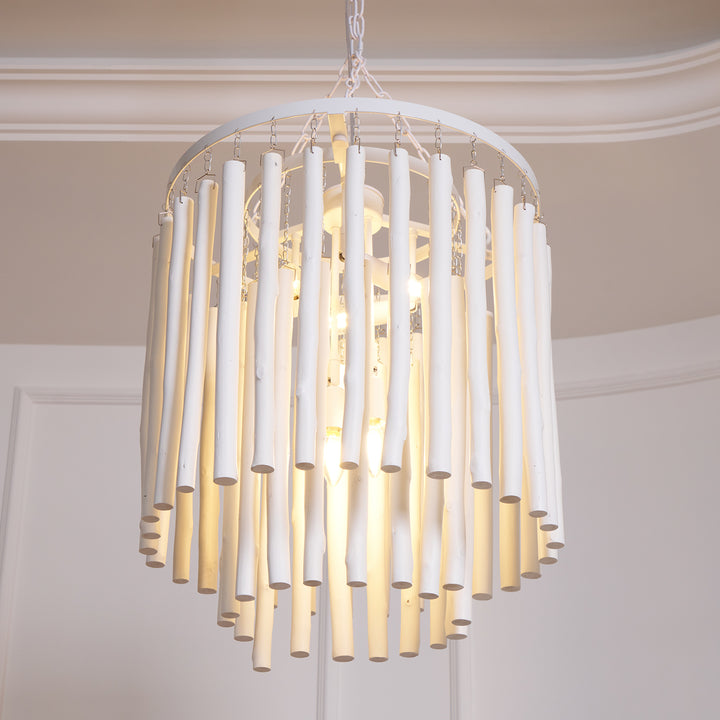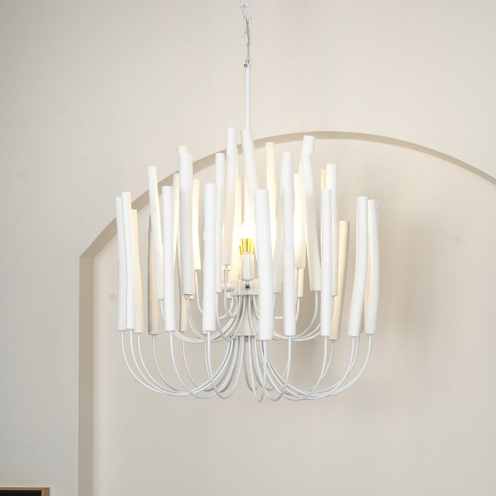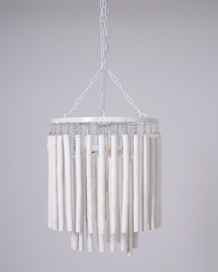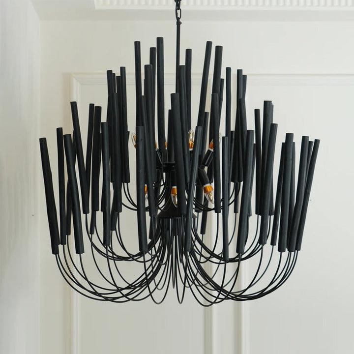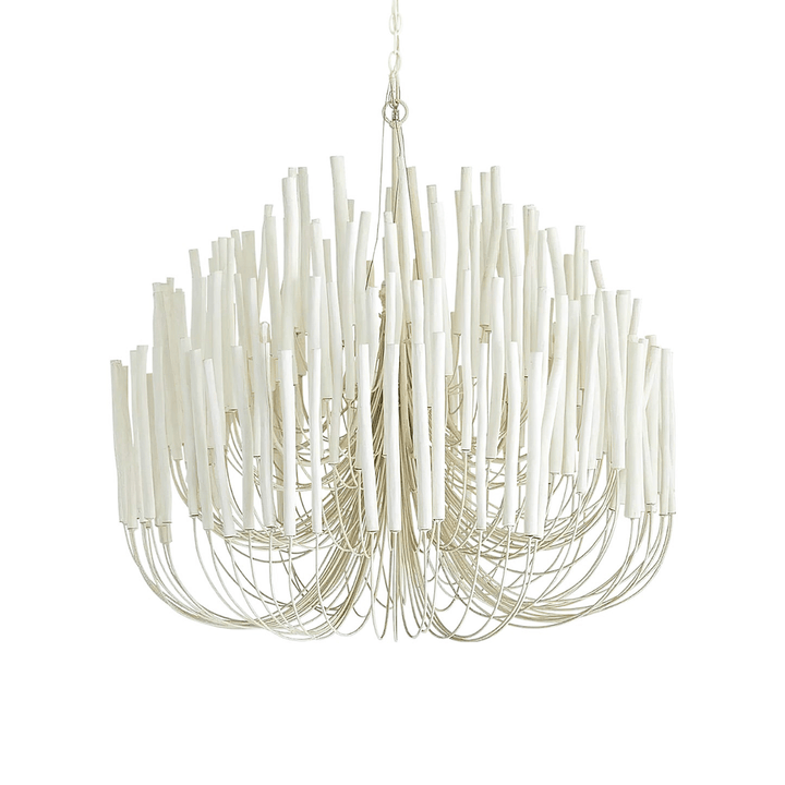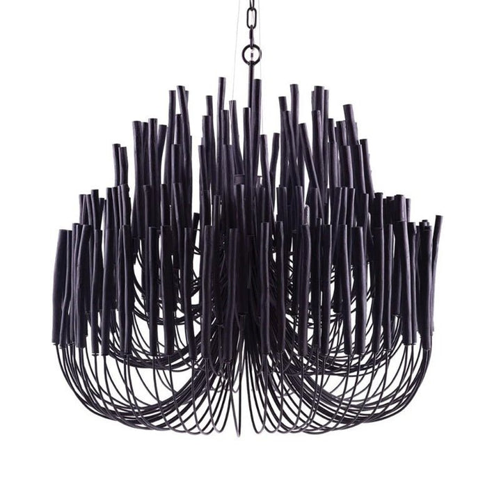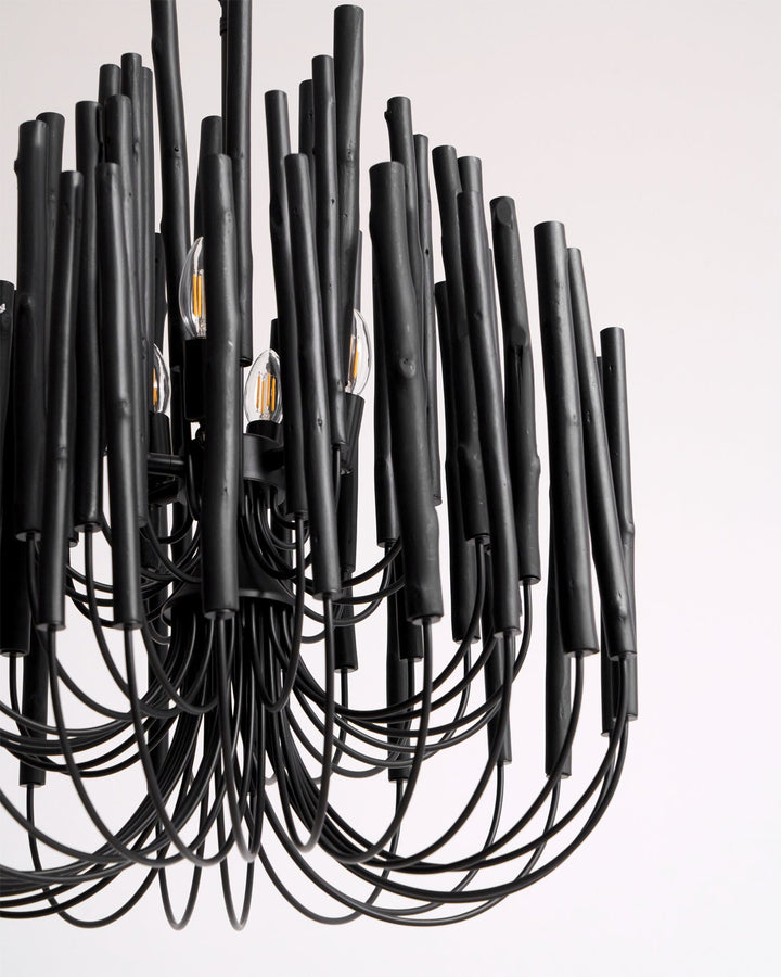 Each Swinton Chandelier is carefully constructed from layered, natural wooden rods and supported by smooth, curved iron arms. We celebrate the natural characteristics of the wood, which means the texture, color, and shape of every rod are unique, crafting a genuine "one-of-a-kind" masterpiece for you. This organic yet layered structure cleverly balances rustic natural charm with clean, sharp modern lines.