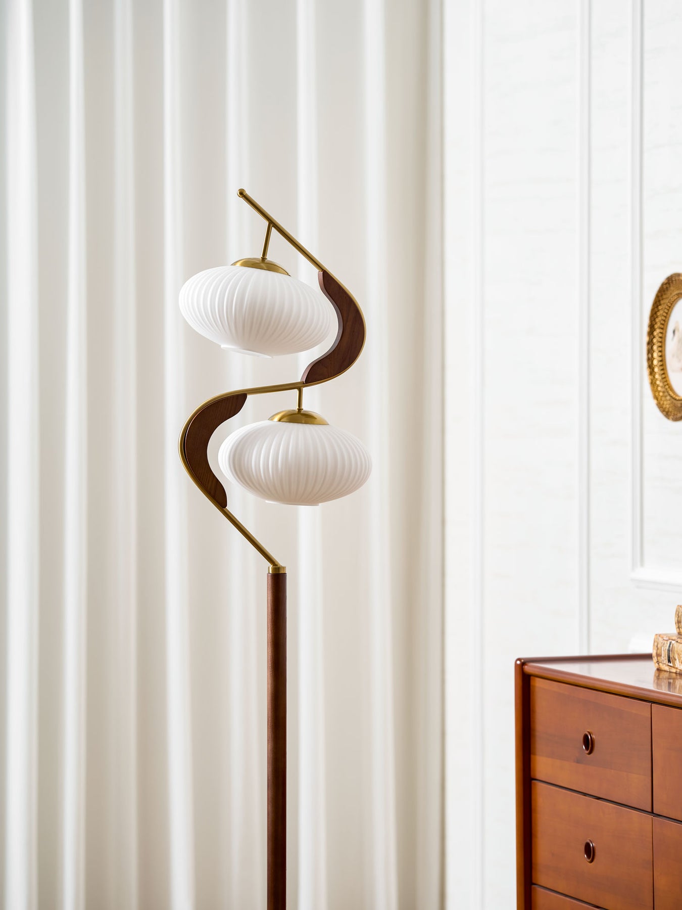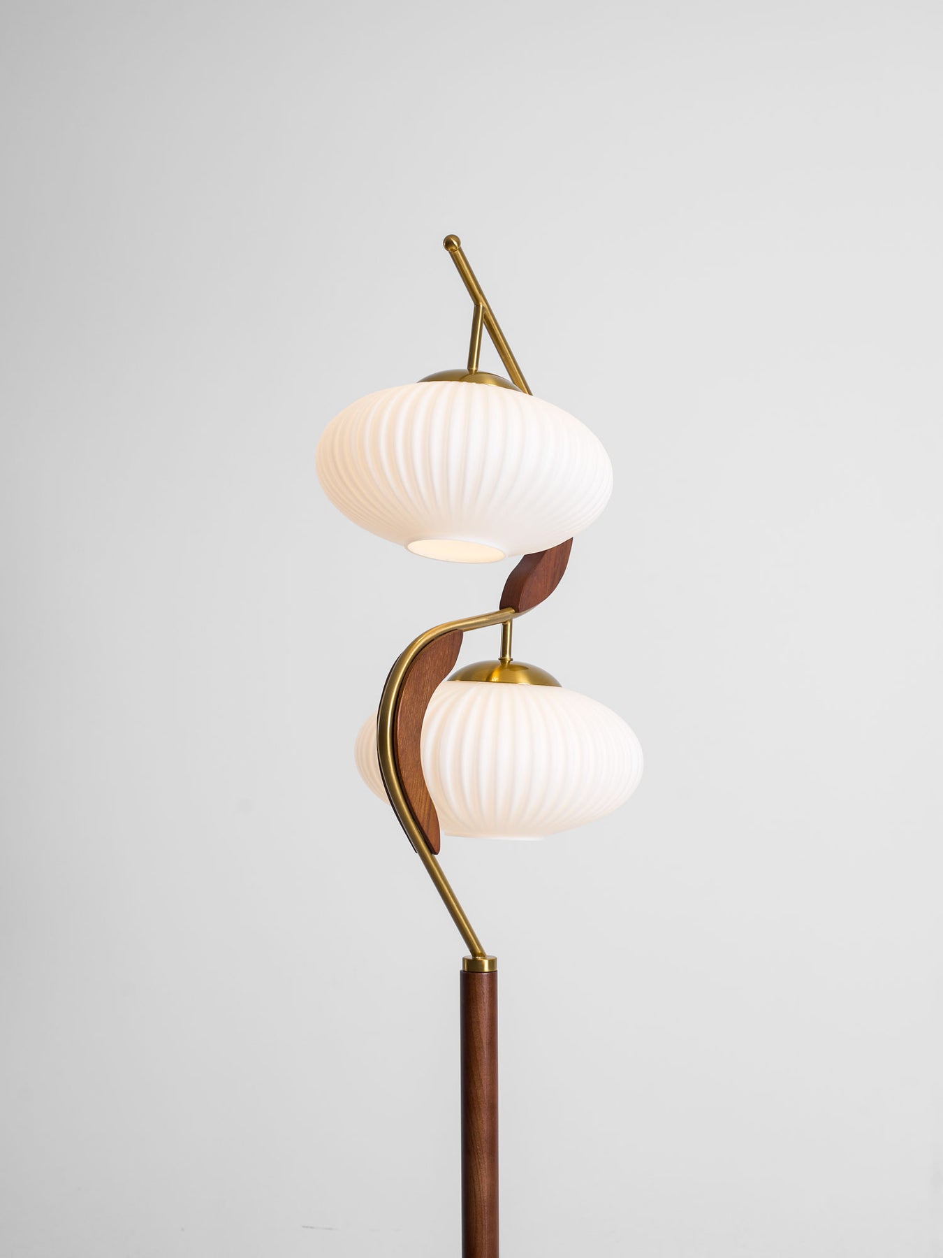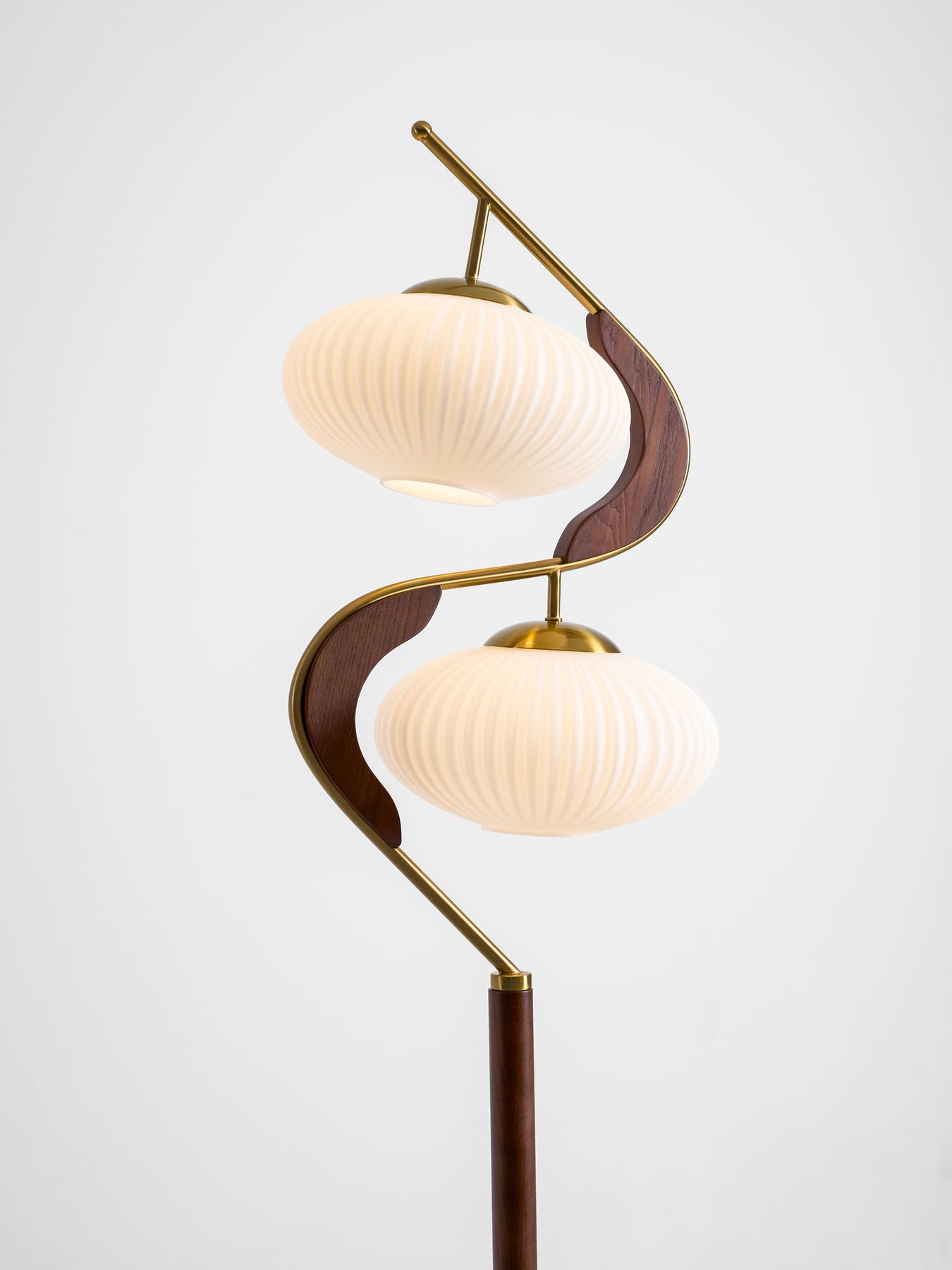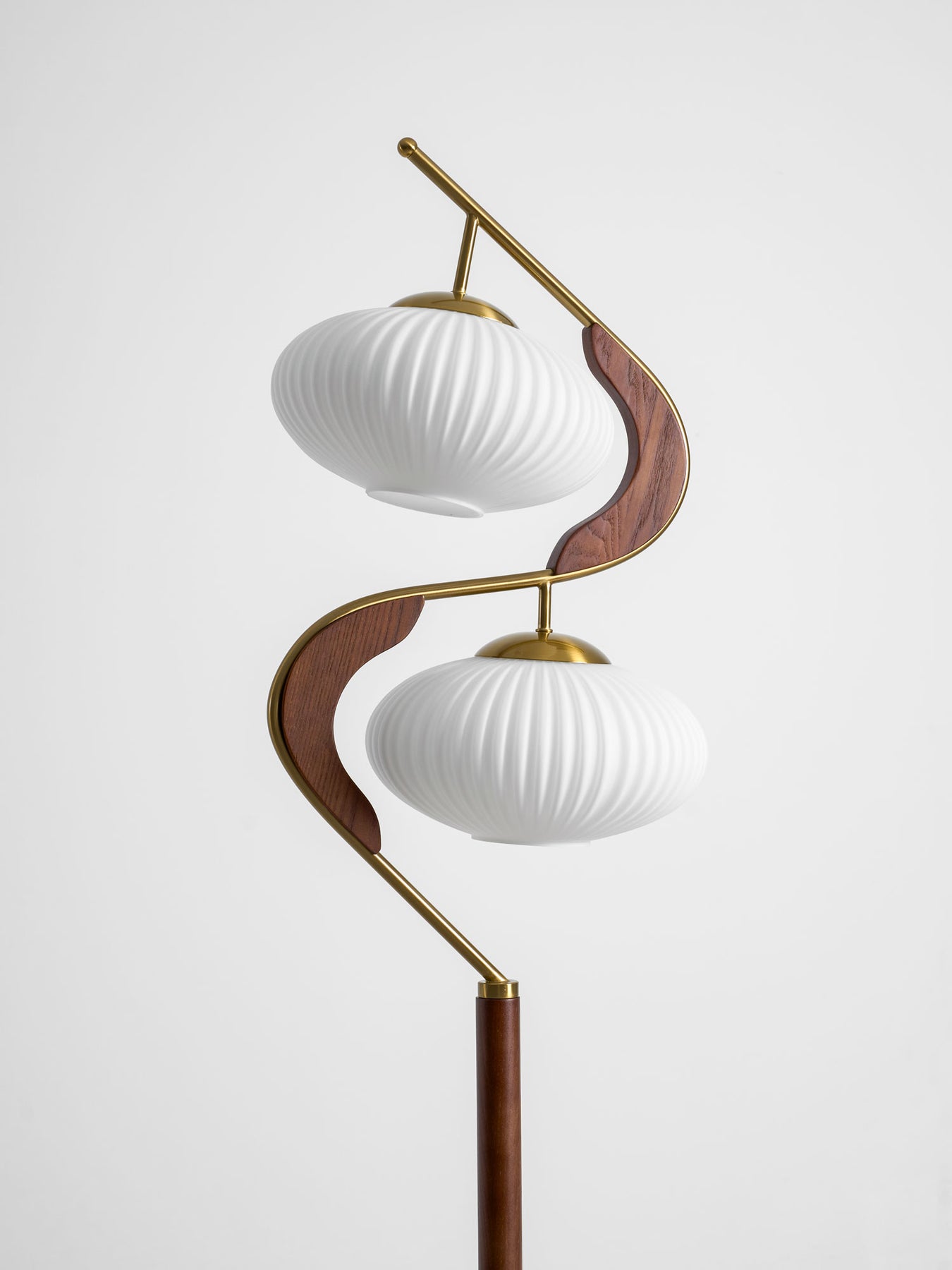 The Serenita Double Shade Floor Lamp exemplifies the fusion of elegance and artistry in lighting design. Featuring a striking blend of soft, sculptural curves and rich materials, this floor lamp brings a sense of balance and serenity to any space. The two delicately fluted shades, mounted on a sleek, sweeping metal frame, cast a soft, warm glow that enhances the ambiance of your living room or reading nook. The combination of rich wood and lustrous brass accents adds sophistication, while the graceful curves create a visual flow that’s both contemporary and timeless. Perfect for those seeking both functionality and beauty in their lighting choices.