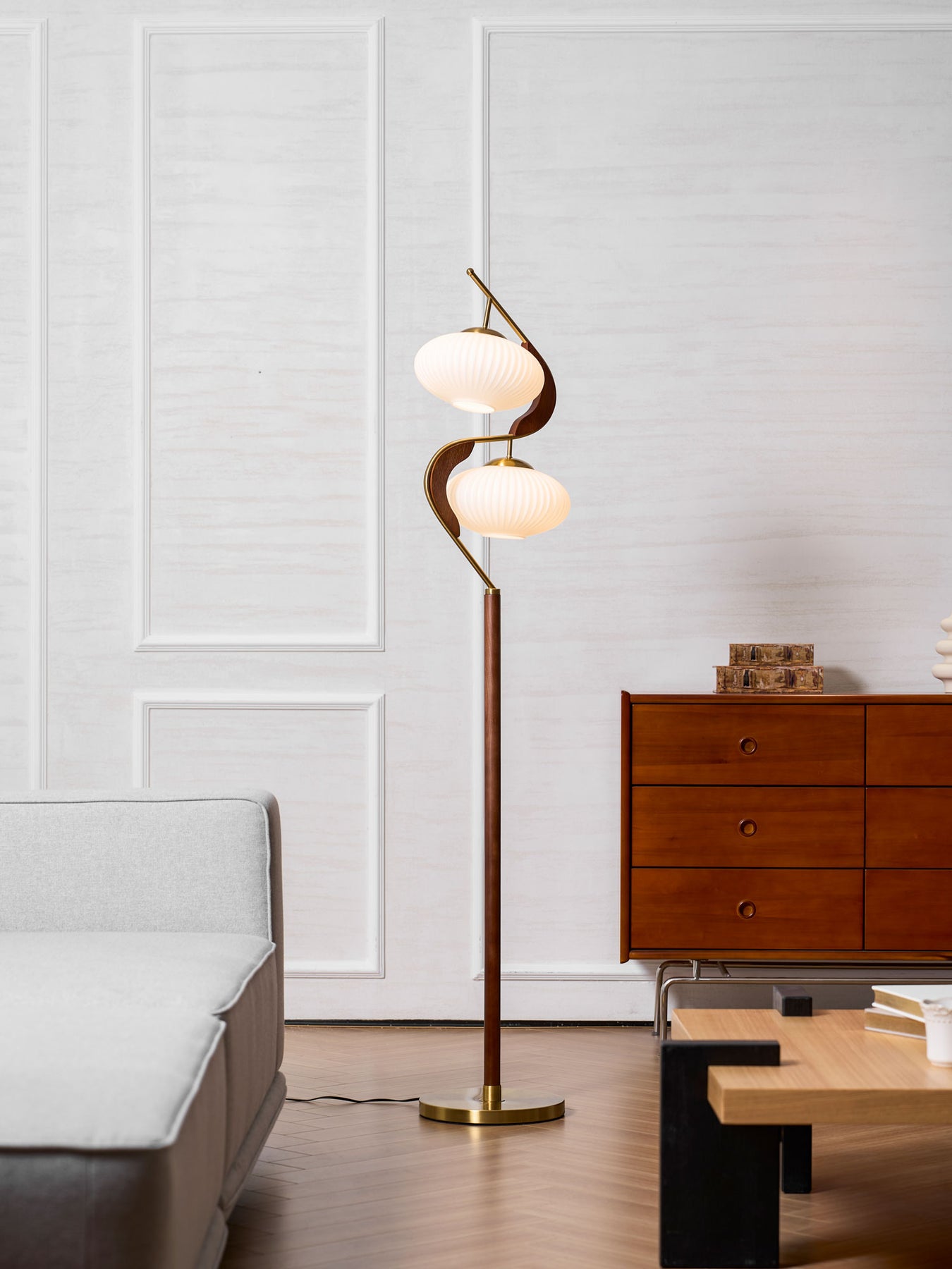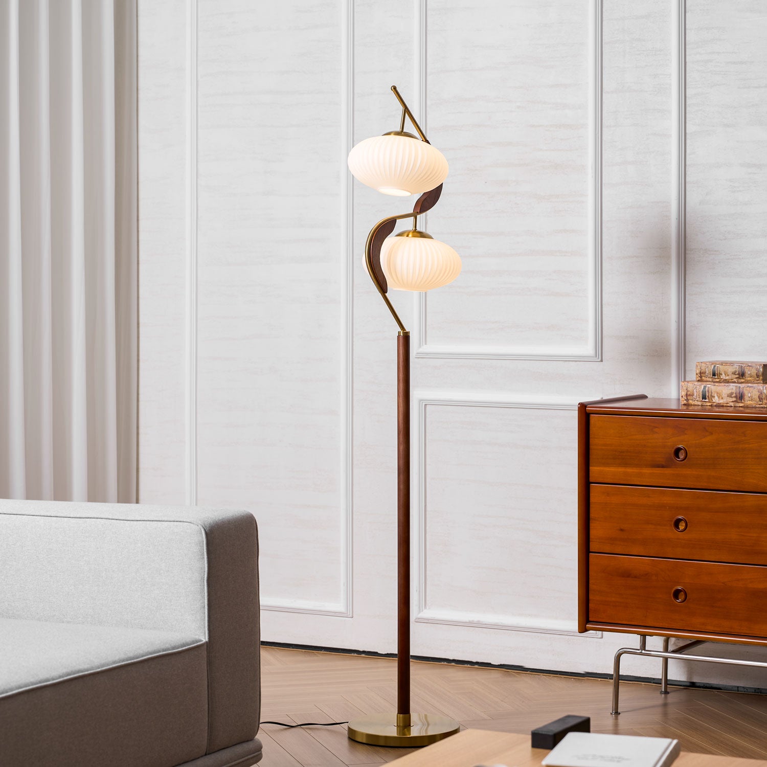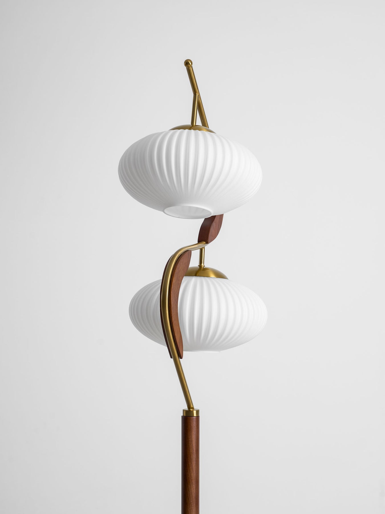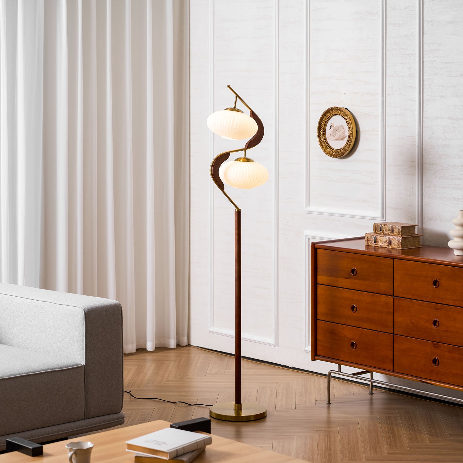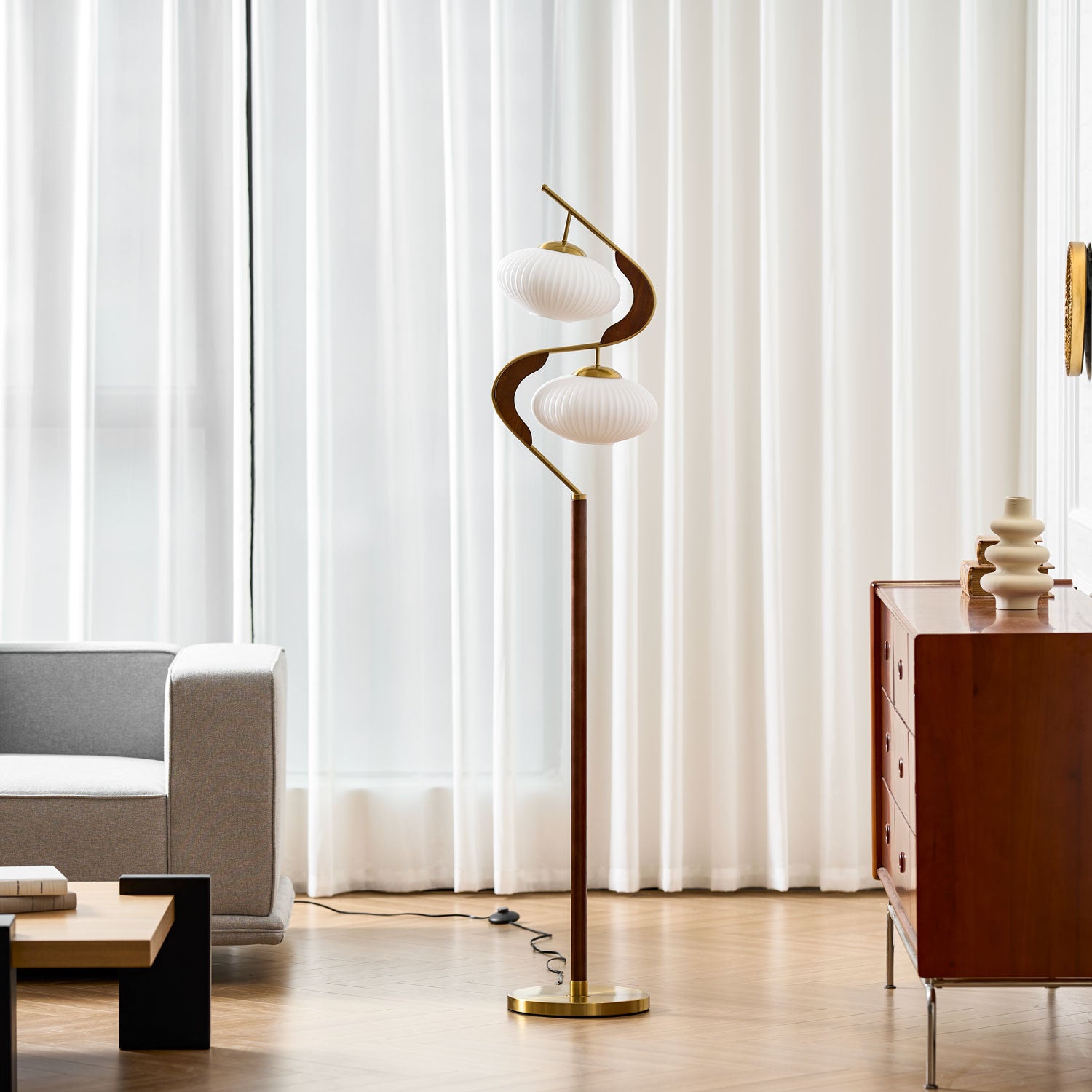 The Serenita Double Shade Floor Lamp exemplifies the fusion of elegance and artistry in lighting design. Featuring a striking blend of soft, sculptural curves and rich materials, this floor lamp brings a sense of balance and serenity to any space. The two delicately fluted shades, mounted on a sleek, sweeping metal frame, cast a soft, warm glow that enhances the ambiance of your living room or reading nook. The combination of rich wood and lustrous brass accents adds sophistication, while the graceful curves create a visual flow that’s both contemporary and timeless. Perfect for those seeking both functionality and beauty in their lighting choices.