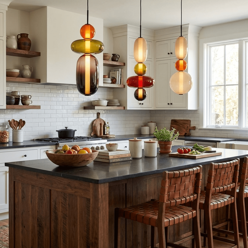 • アイランドキッチン上のペンダントライト: これらは調理に必要な作業照明として不可欠であり、作業台の表面から32~36インチ(約81~91cm)の高さに吊り下げる必要があります。十分な照明を確保しつつ空間を圧迫しないよう、各ペンダントライトの長さはアイランドの長さの約4分の1にしてください。