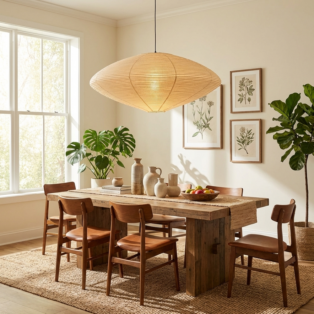• 複数のペンダント: 長方形の長いテーブルには、テーブルの上に2つか3つの小さめのペンダントライトを等間隔に配置すると、バランスの取れた印象になります。