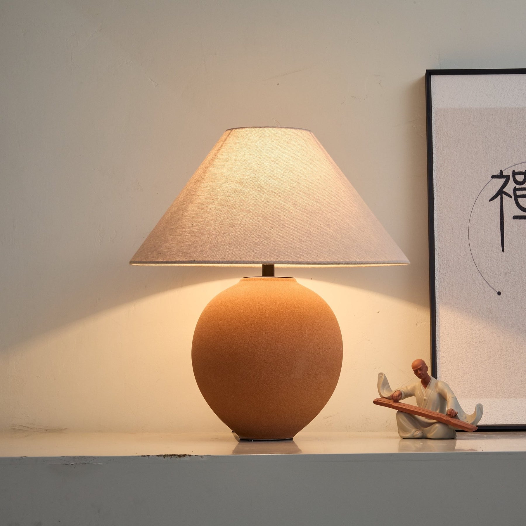 This table lamp features a base in the shape of a smooth orb, with a terracotta - colored ceramic finish that gives it a warm and rustic look. Topped with a conical, neutral - hued fabric lampshade, it diffuses light softly. Perfect for adding a touch of cozy and natural charm to bedside tables, desks, or living spaces.