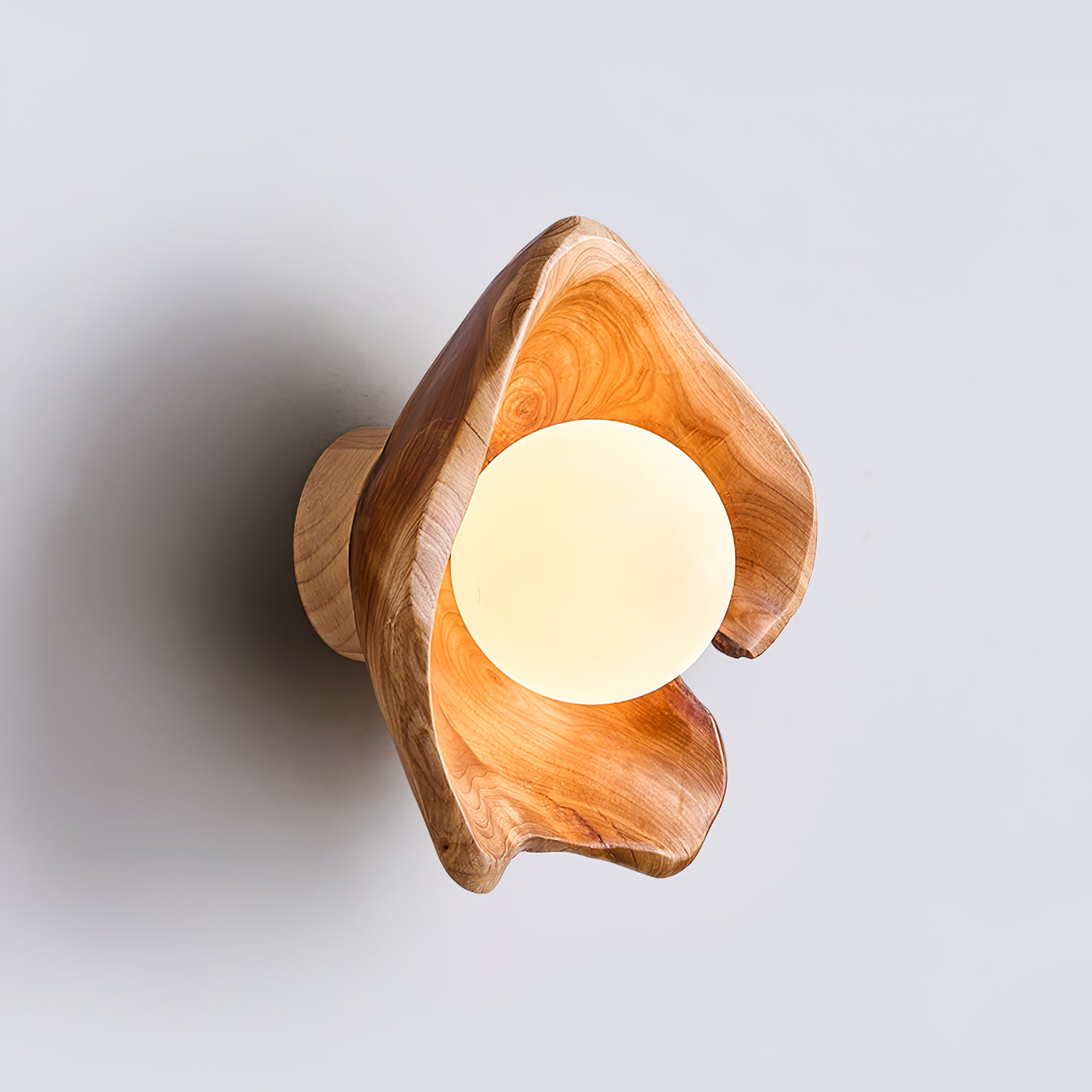 The Lunawood Halo is a striking fusion of organic form and modern illumination. Hand-carved from a single piece of richly grained natural wood, its asymmetrical, flowing shape evokes the raw beauty of a tree's heart. At its center, a smooth, spherical light orb emits a soft, ambient glow, creating a warm contrast against the earthy wood tones. Designed as a wall or ceiling light fixture, this piece serves both as functional lighting and sculptural art—ideal for interiors that celebrate nature, craftsmanship, and minimalism.