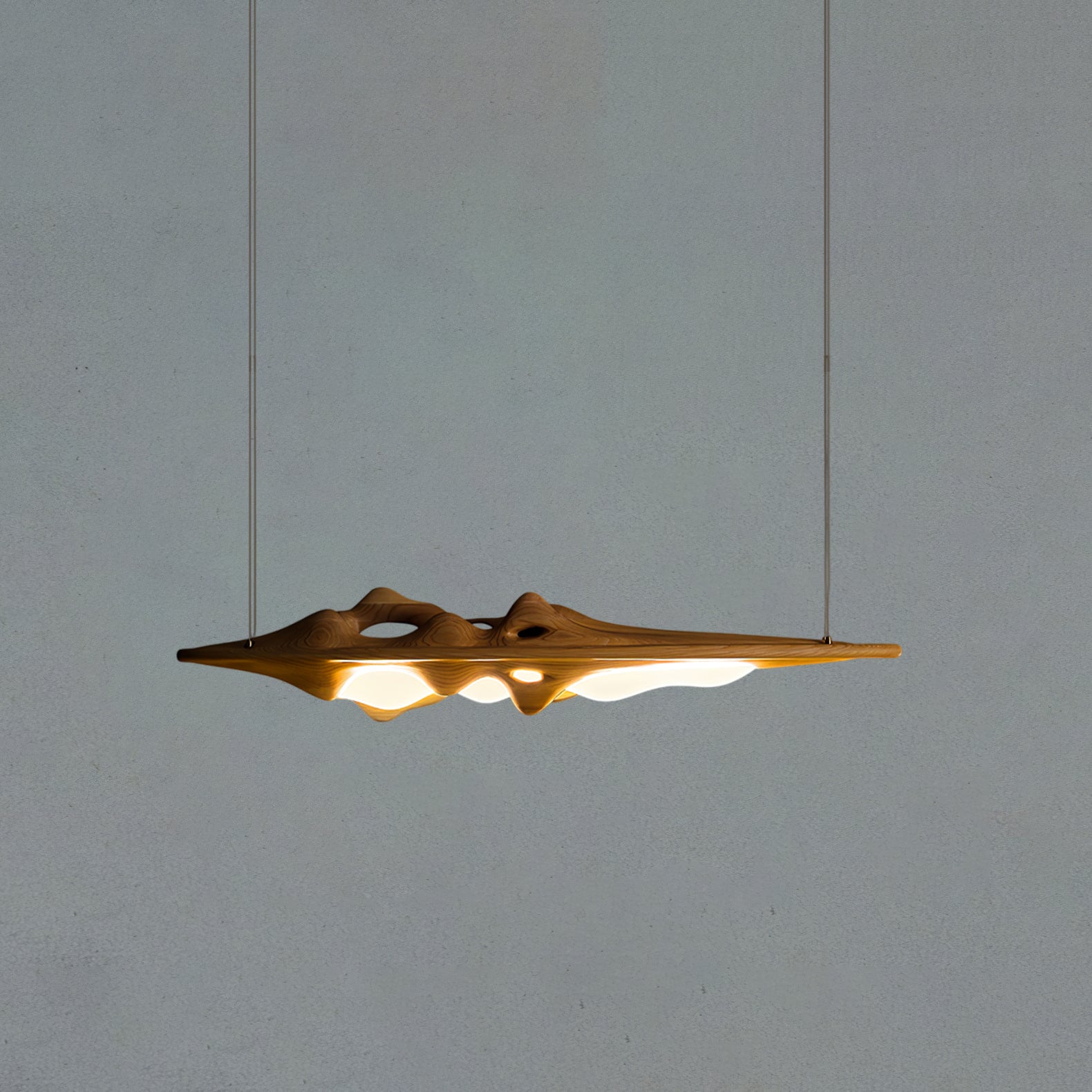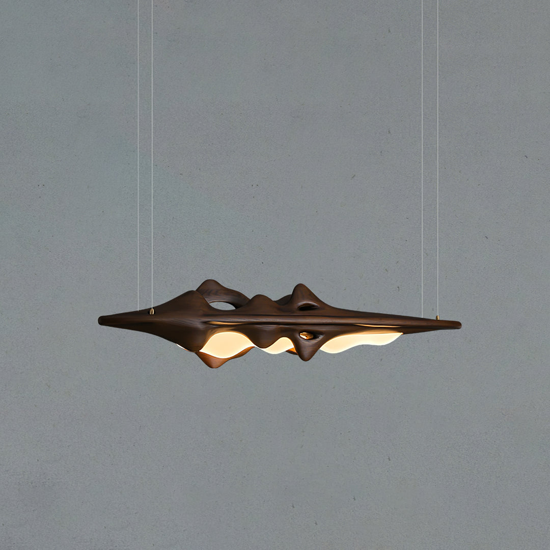 De Volar Drift hanglamp, gebeeldhouwd als een fragment van vloeiende geometrie, bevroren in de tijd, combineert organische kunst met sfeervolle functionaliteit. Vervaardigd met vloeiende, golvende contouren en rijke houtachtige afwerkingen, gloeit de geperforeerde behuizing van binnenuit en werpt gelaagde schaduwen en zacht licht. Ideaal als opvallend middelpunt boven eettafels of open ruimtes, is het een lichtsculptuur die vanuit elke hoek boeit.