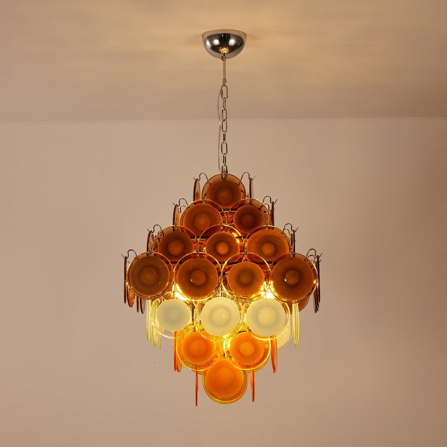 Breng een vleugje vintage glamour in uw ruimte met de Vakkerlight Retro Glass Disc Chandelier. Dit opvallende ontwerp bestaat uit meerdere mondgeblazen glazen schijven in warme amber-, bruin- en zachte pasteltinten, gelaagd voor een luxueuze waterval van kleur en licht. De kroonluchter hangt aan een stevige ketting met een gepolijst frame en creëert een rijke, sfeervolle gloed die de charme van mid-century design oproept. Perfect voor eetkamers, woonkamers of stijlvolle commerciële ruimtes, dit statement piece voegt artistieke flair en tijdloze verfijning toe aan elk interieur.
