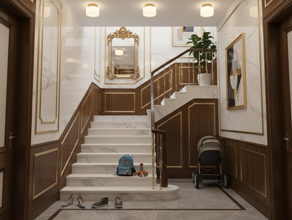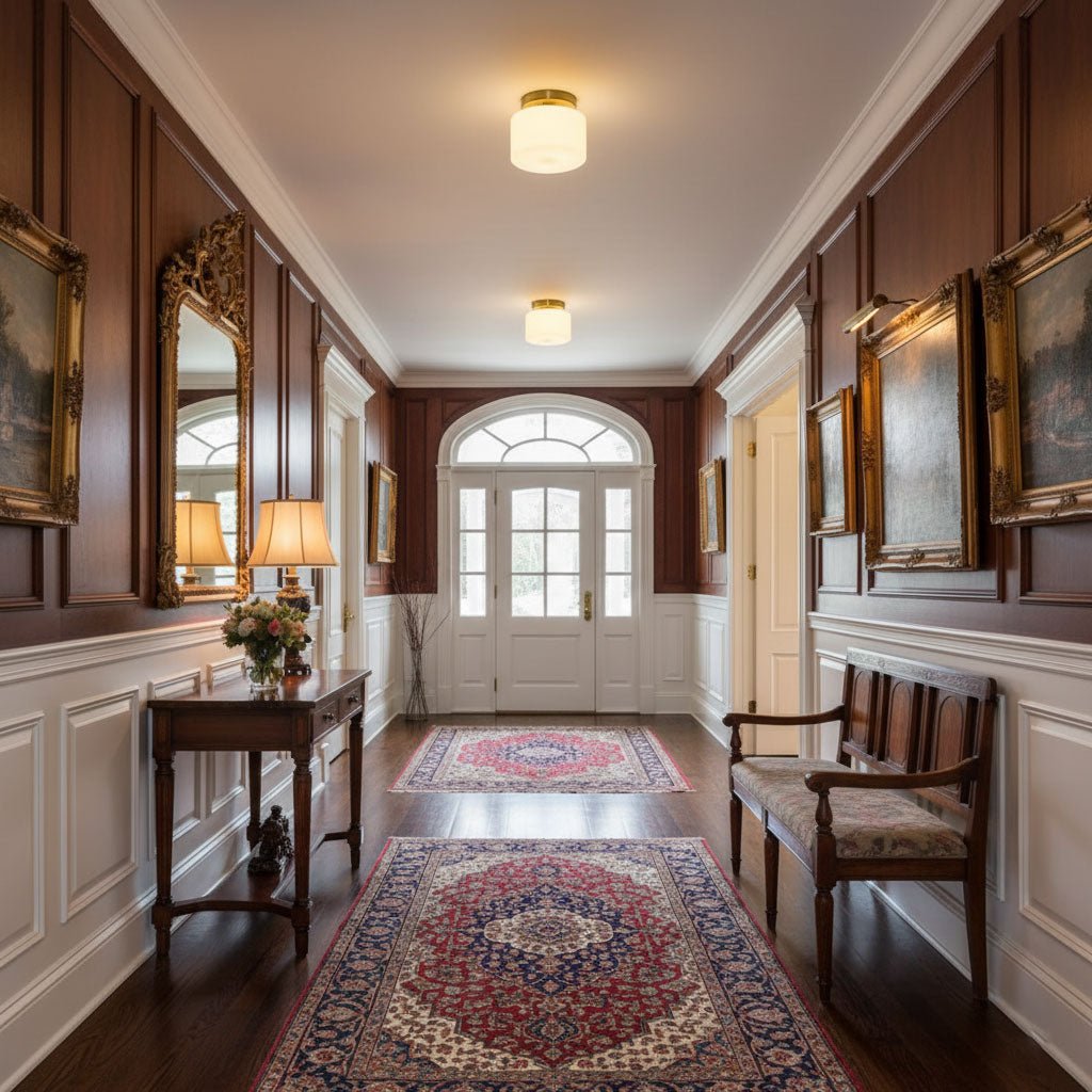 Verlichting in de hal : inbouw- of vlakke lampen die op gelijke afstand van elkaar (elke 2,5-3 meter) zijn gemonteerd, zorgen voor een goed verlichte en uitnodigende ruimte.