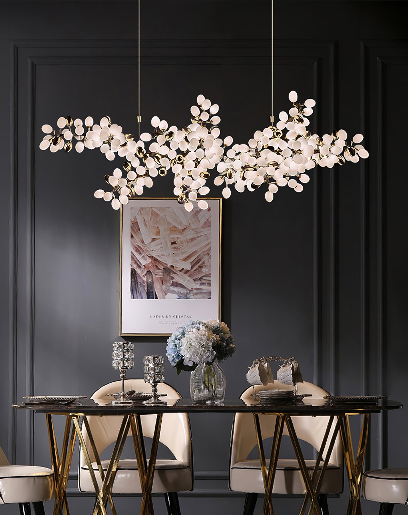 • Kroonluchters : Als middelpunt van de eetkamer moet de kroonluchter breed genoeg zijn om de eettafel te complementeren, maar niet zo breed dat hij de ruimte overheerst. Een diameter van 1/2 tot 2/3 van de tafelbreedte is een goede richtlijn.