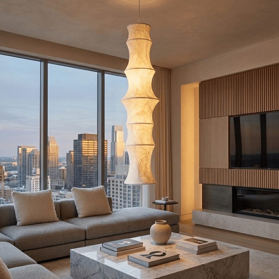 The Silvara Cocoon Pendant by Vakkerlight brings a sculptural softness to any space, inspired by the delicate architecture of silkworm cocoons. Crafted from hand-layered mulberry silk, the shade reveals natural fibers and gentle tonal shifts that glow warmly when illuminated.