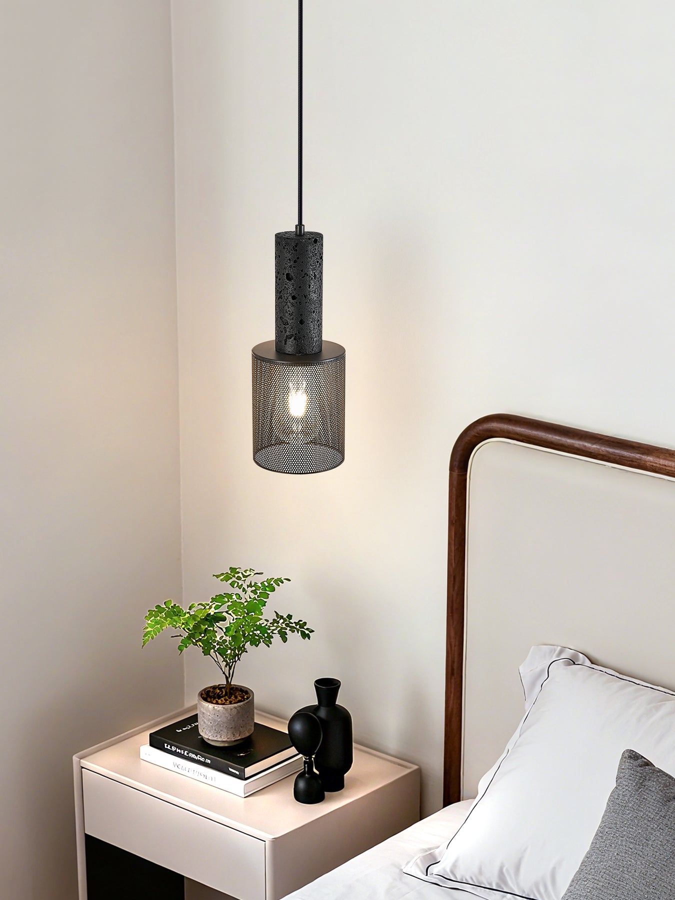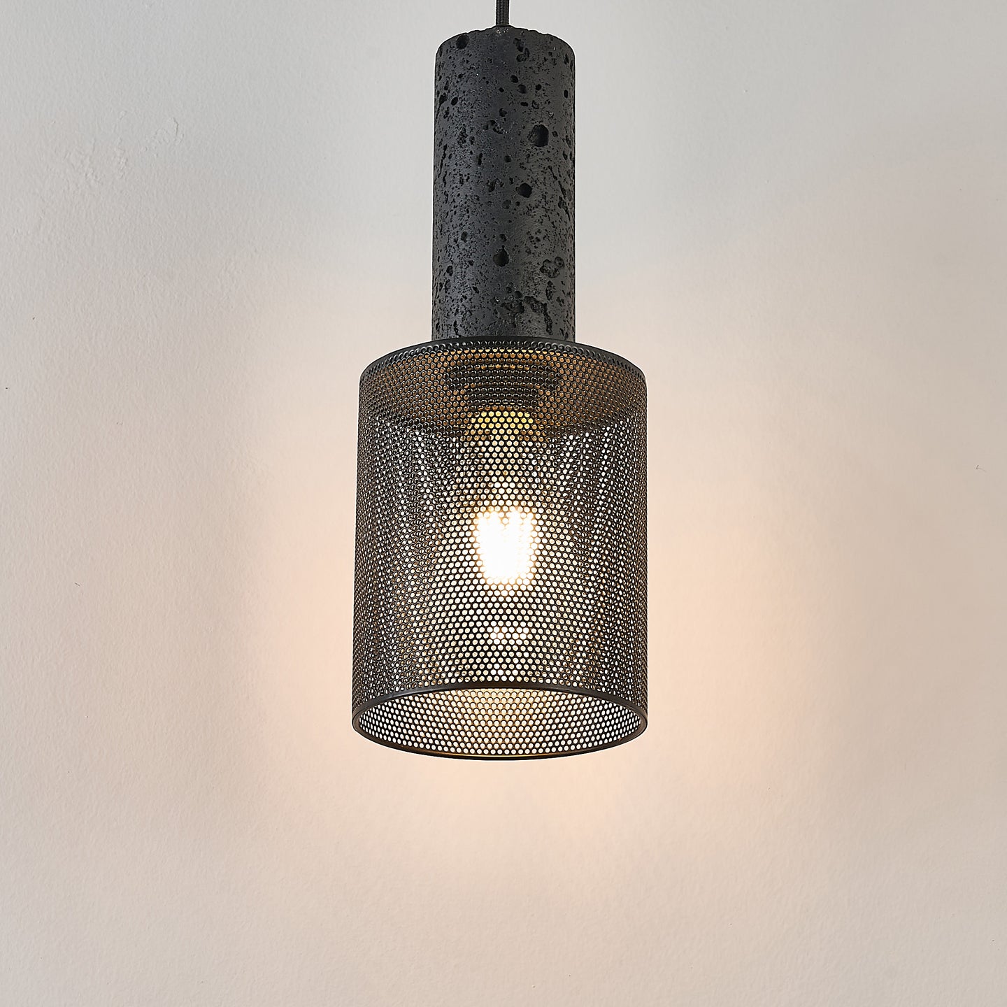 The Vultex Mesh Pendant Lamp blends raw texture with industrial refinement. Its upper body is crafted from volcanic-inspired stone, showcasing natural pores and an organic matte black finish. Below, a precision-cut metal mesh shade filters the light beautifully—softening glare while revealing a warm, atmospheric glow.