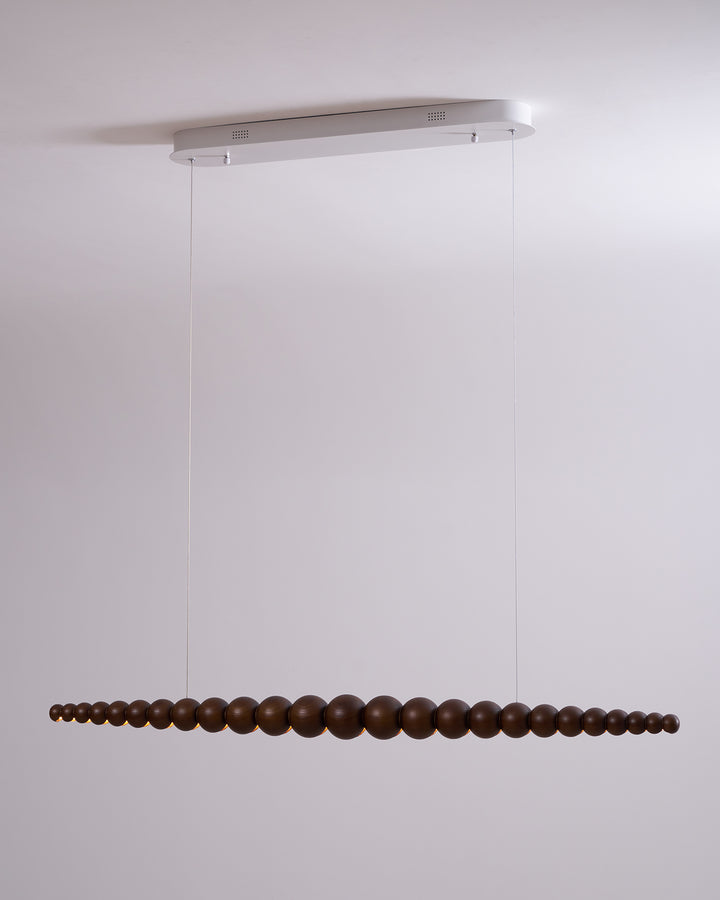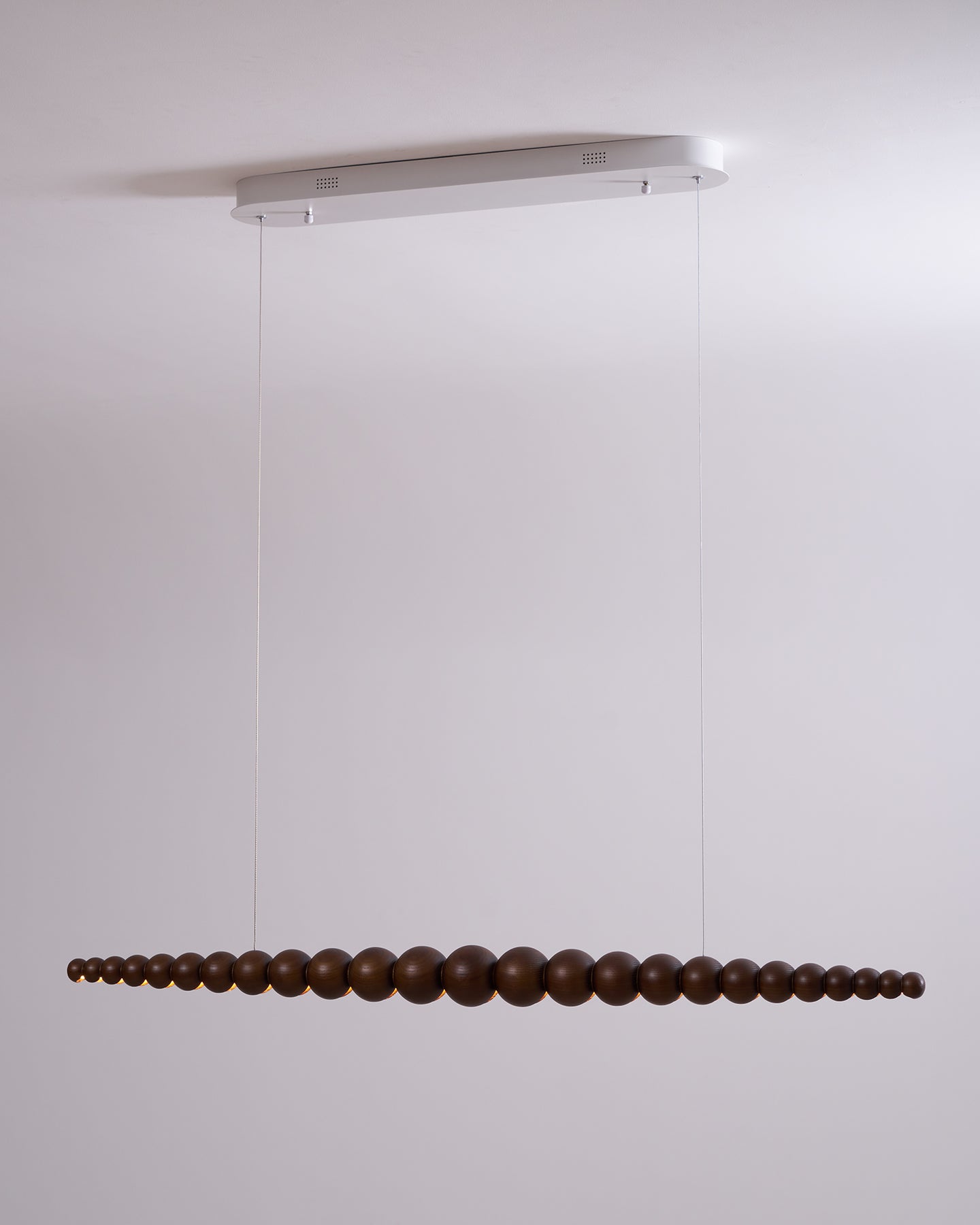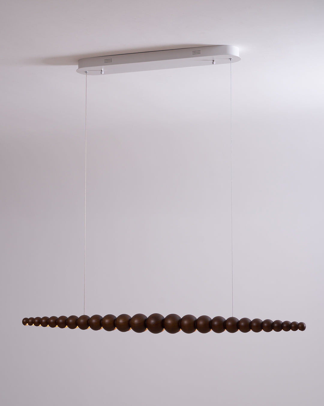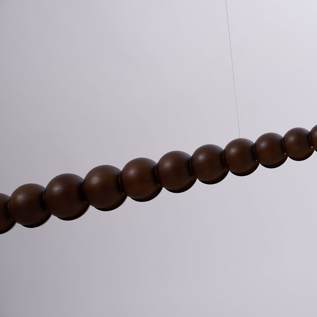 De Woodline Orb hanglamp is geïnspireerd op de natuurlijke schoonheid van hout en de tijdloze elegantie van bolvormige vormen. Deze prachtige lamp bestaat uit een reeks houten bollen, zorgvuldig lineair gerangschikt, wat een harmonieus en evenwichtig ontwerp creëert. De warme, natuurlijke houttinten voegen een vleugje organische charme toe, terwijl de minimalistische opstelling zorgt voor een moderne en verfijnde esthetiek. Perfect voor eetkamers, keukens of woonruimtes, combineert de Woodline Orb hanglamp het organische met het moderne en biedt zowel functionele verlichting als een boeiend artistiek statement.